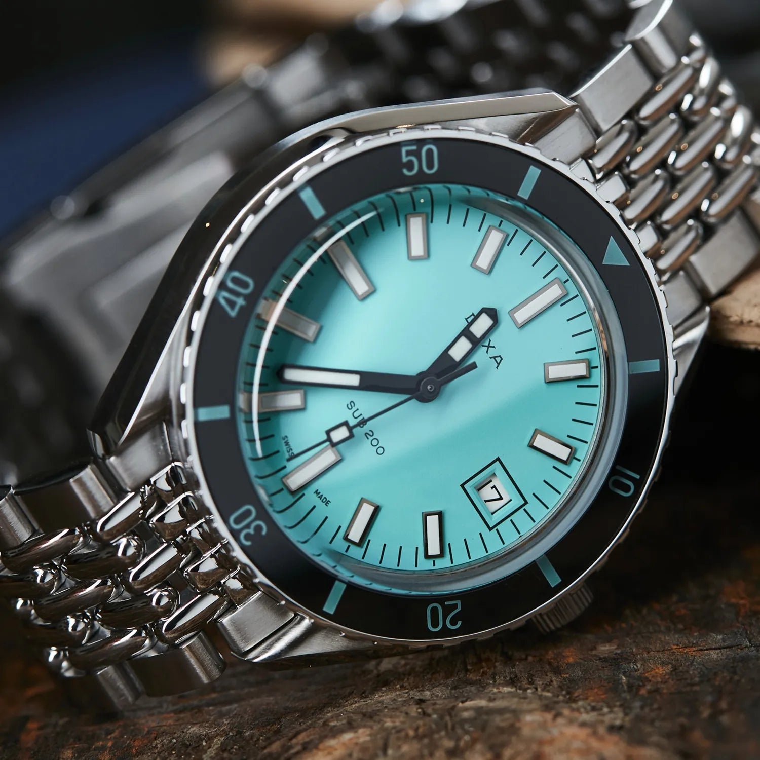 At a diameter of 42 mm, the SUB 200 is topped by a scratch-resistant sapphire crystal with an anti-reflective coating and the distinctive curvature of the domed plexiglass used back in the day.