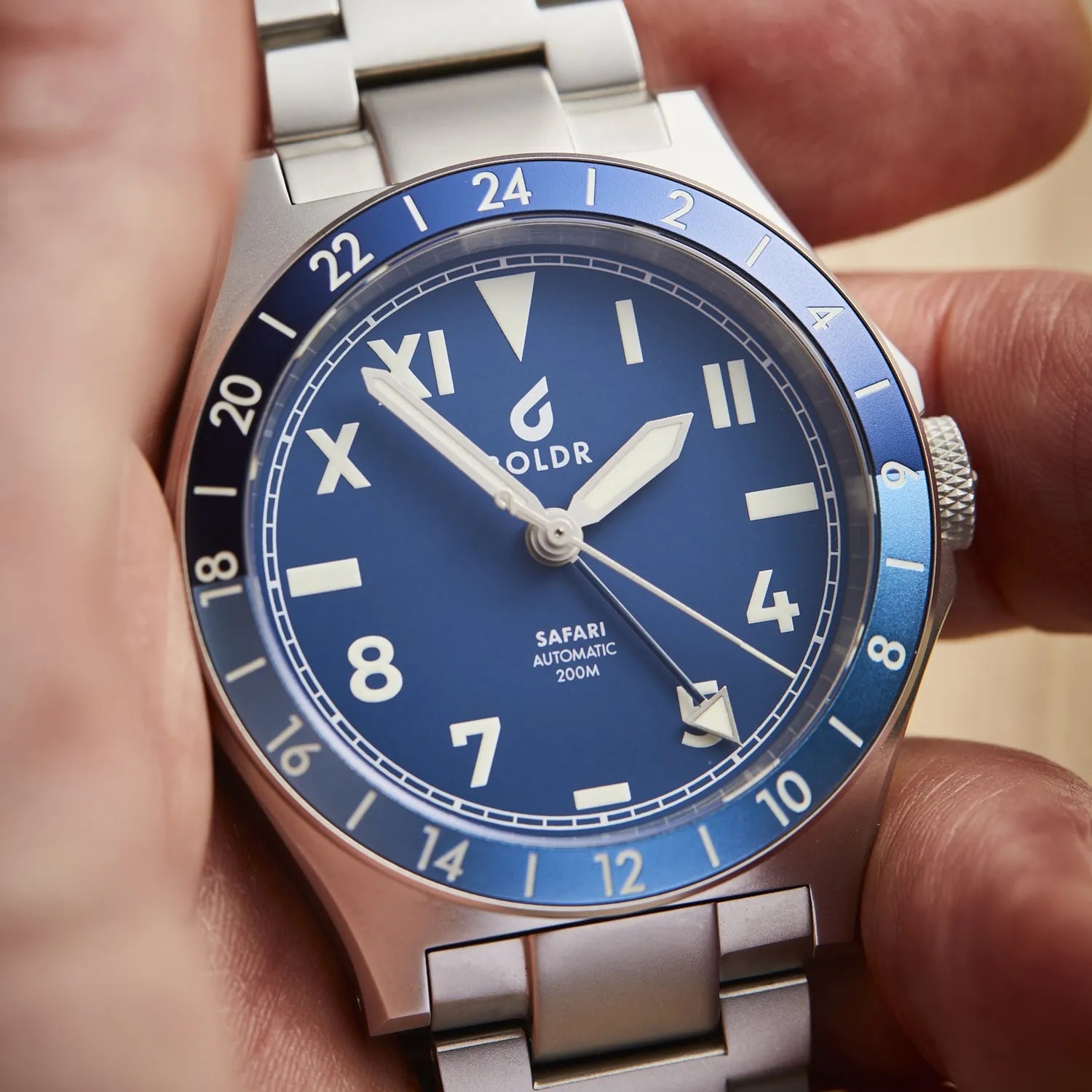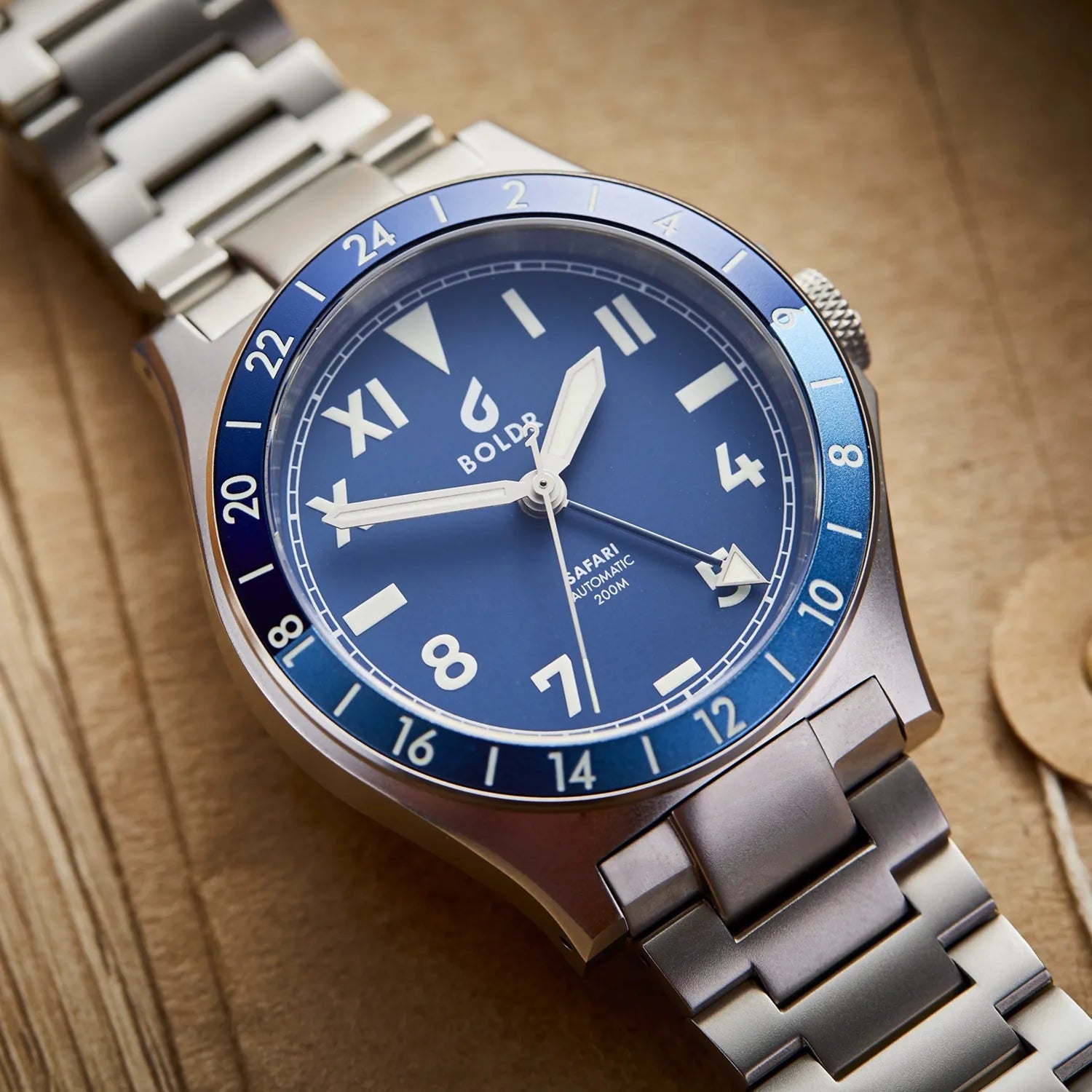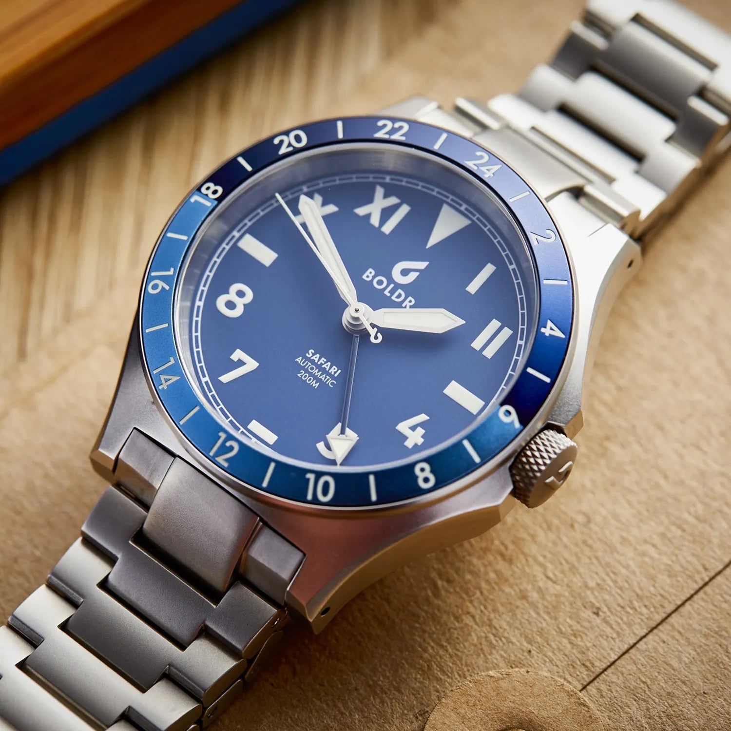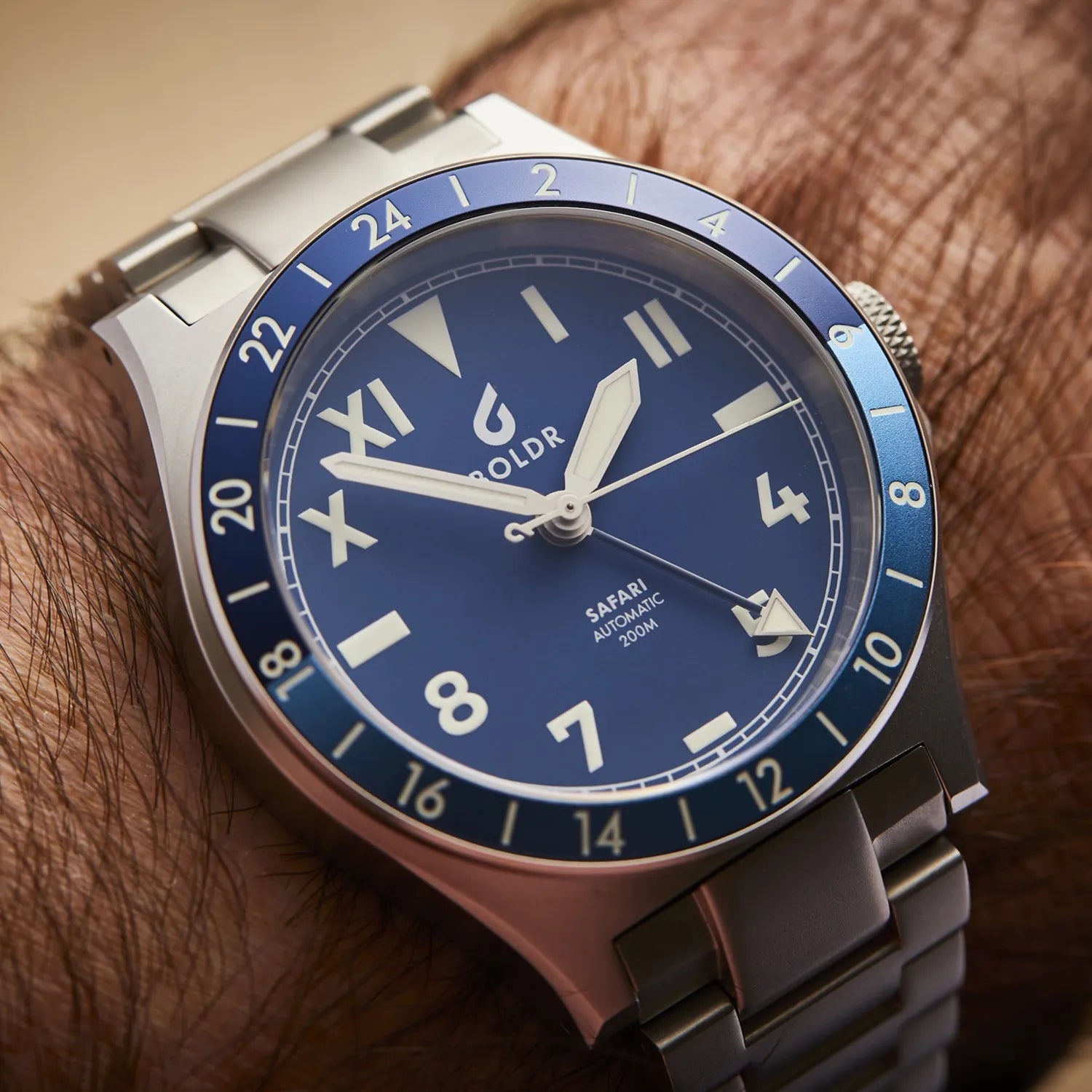 The Safari is a compact beast forged with tough stainless steel and a determination for exploration. Measuring 40mm across your wrist, this GMT edition has a fixed dual-tone bezel graduated for 24 hours, handy for tracking two timezones simultaneously.