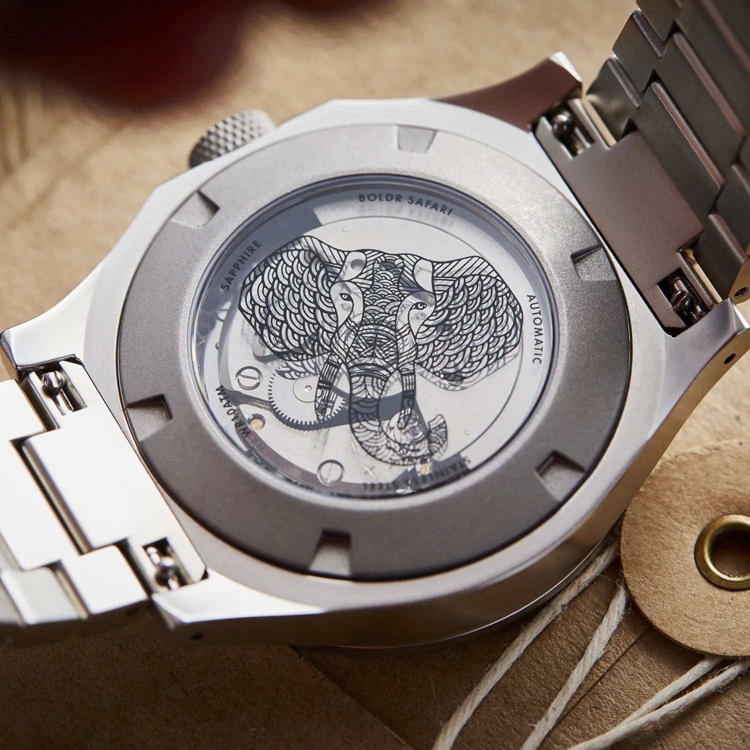Depicted on the caseback is one of four (at random) safari animal species which serve as a reminder to conserve the natural world. In an age of digital technology, we daresay an old-school toughie like this is a natural selection.