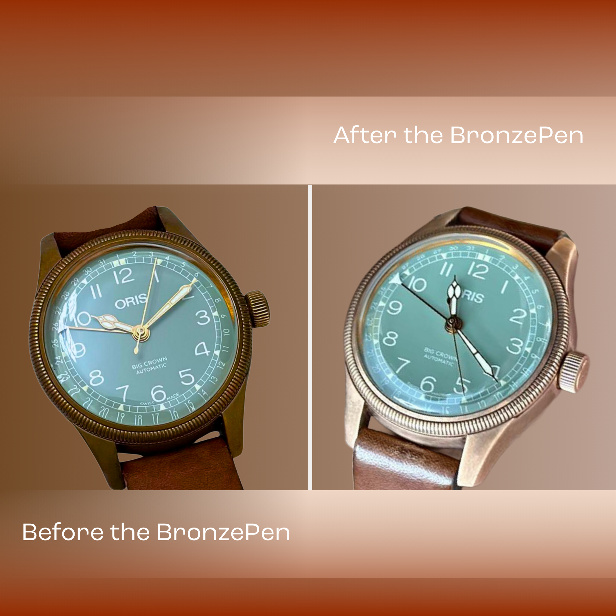 Our Swiss Made BronzePen is the smartest way to care for your bronze timepieces. Specially developed in Switzerland, it removes patina gently yet effectively, restoring the natural beauty of bronze watches while preserving their character.