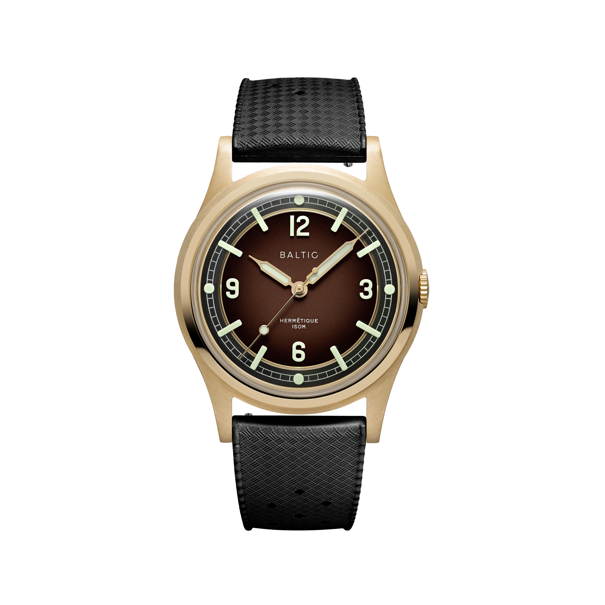 The Hermétique Tourer is a versatile toolwatch designed for exploration and ideal for everyday use. Its 37mm-diameter case is made of bronze and houses a double-domed sapphire crystal all of which offers exemplary durability and water resistance up to 150m. Its integrated crown offers comfort and flexibility allowing you to wear the watch on your left or right wrist as you prefer. The case is brushed horizontally along the sides circularly on the lugs and features a polished bezel.