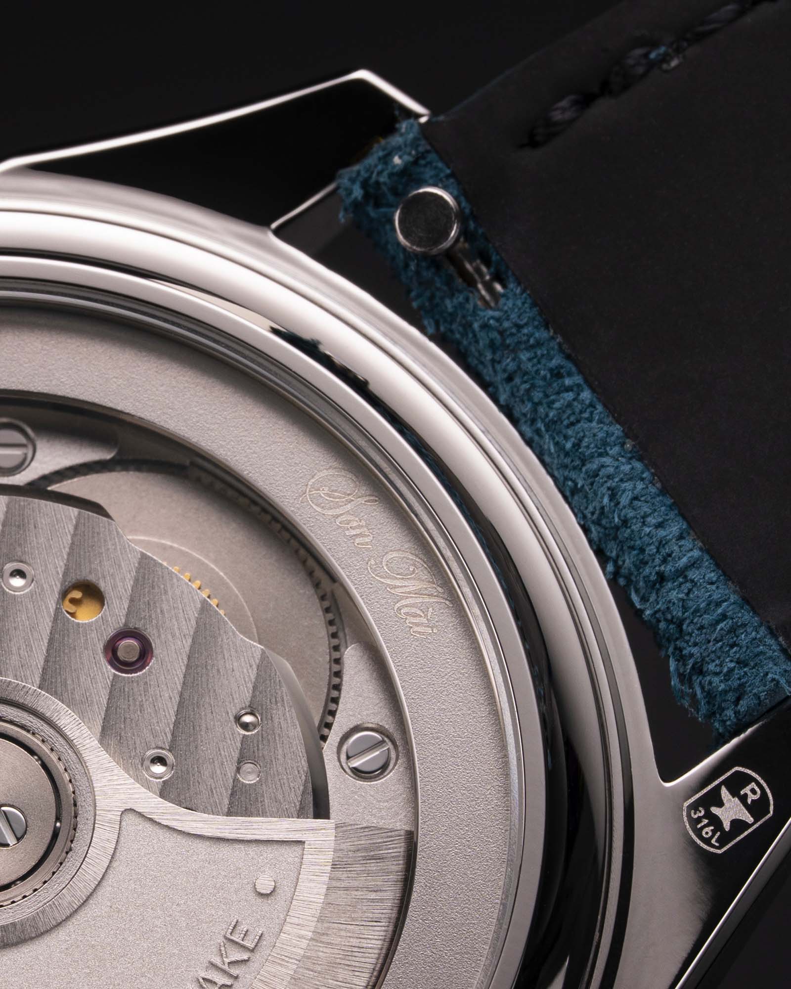 Visible through the sapphire caseback, the movement is complemented by a custom tungsten oscillating rotor, featuring a combination of sandblasted, polished, and micro-blasted finishes.