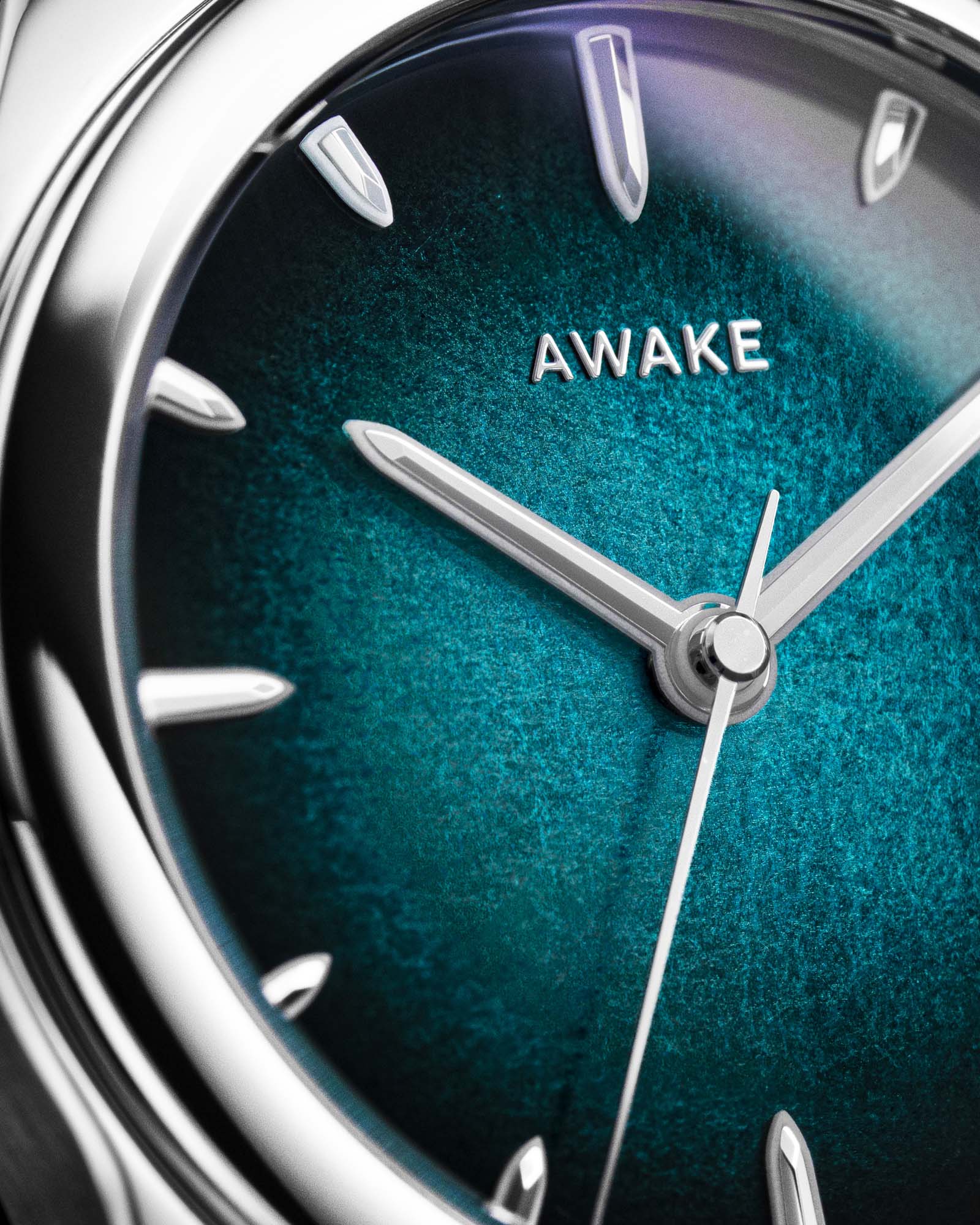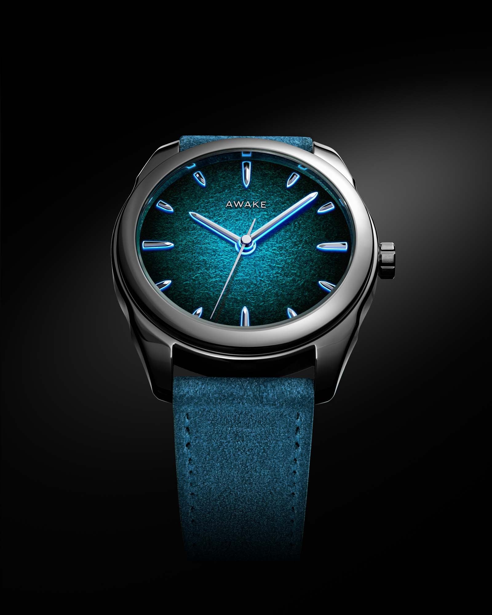 AWAKE’s exclusive luminous design enhances the dial’s depth while maintaining a refined appearance in daylight. The indices and hands are built on a thin Super-LumiNova® BGW9 base, topped with polished, faceted steel elements.