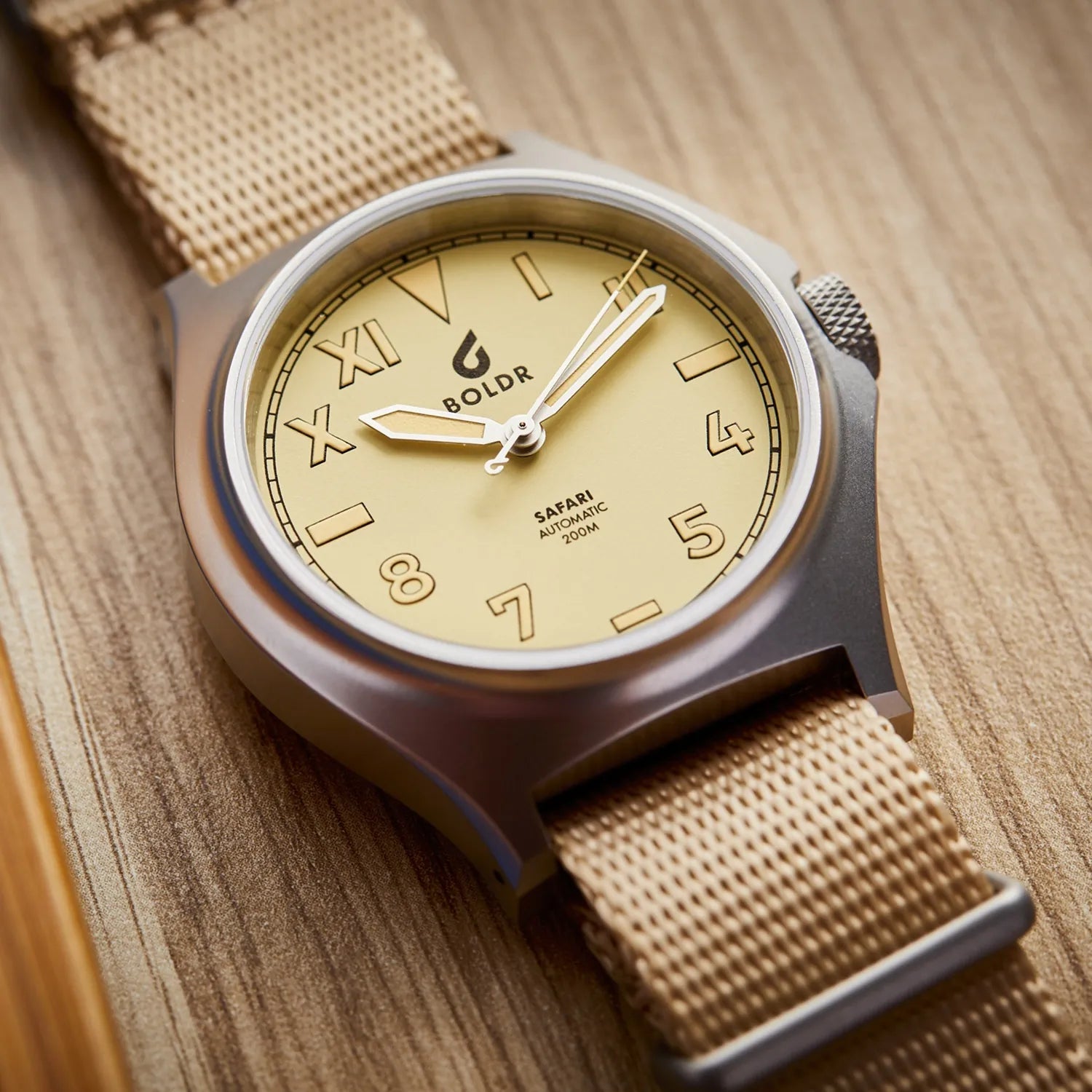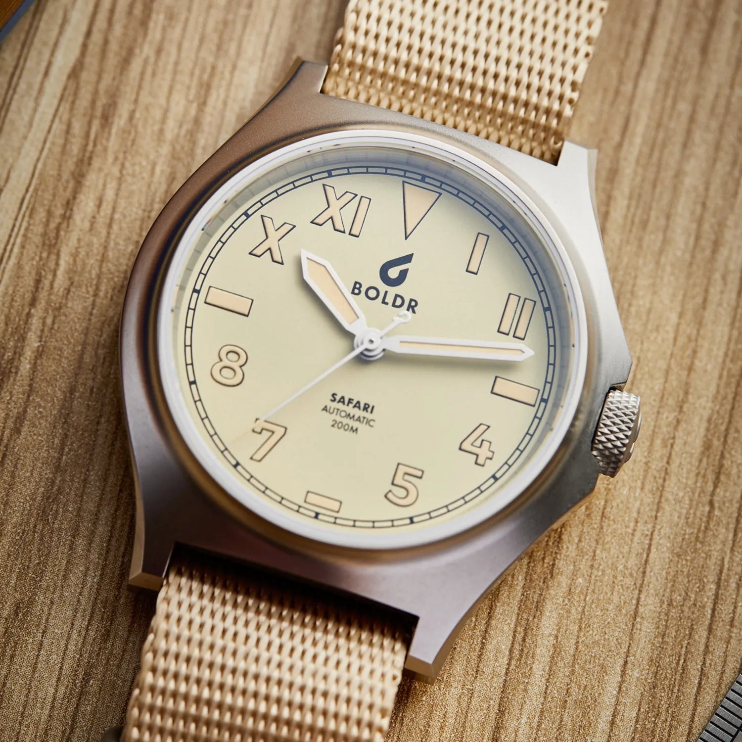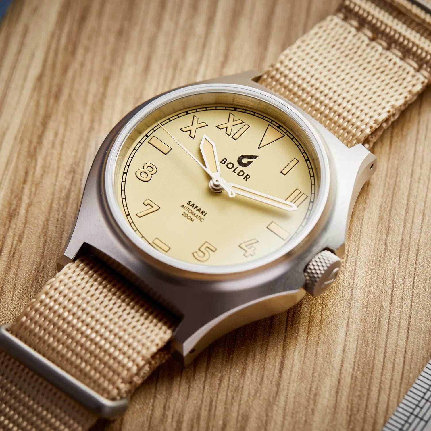 This Safari Ranger is a compact beast forged with stainless steel and a determination for exploration. Measuring 40mm across your wrist, it has the simple elegance of a field-style tool watch.