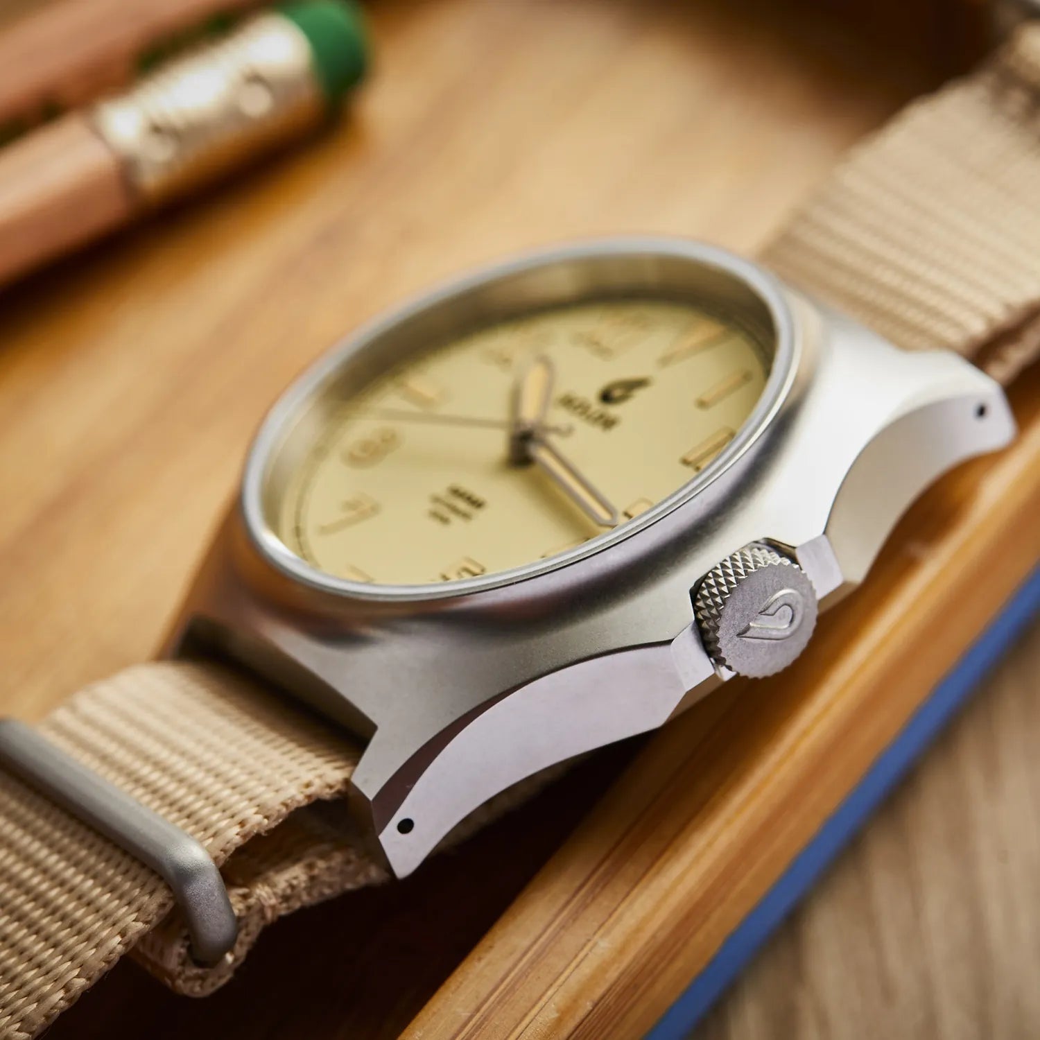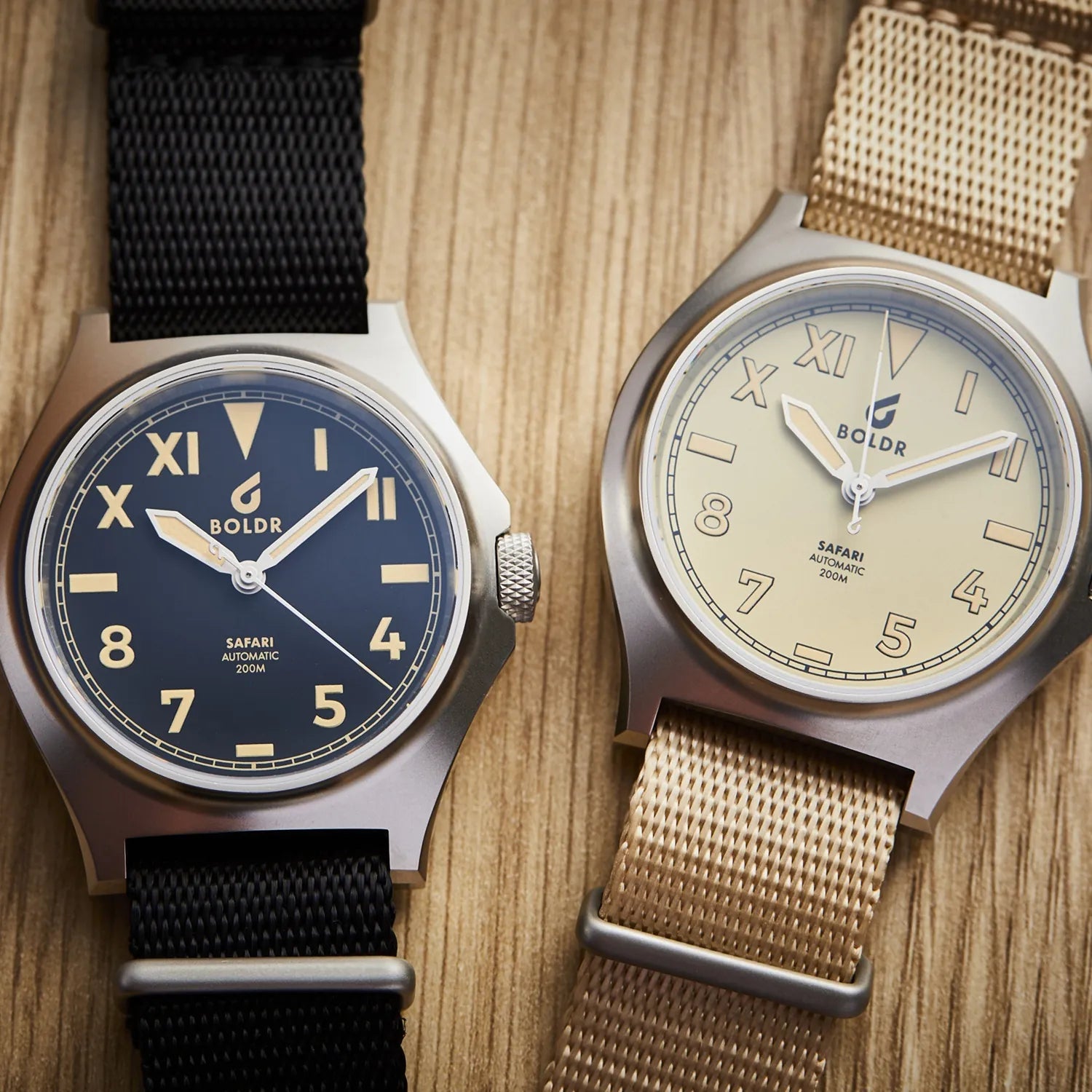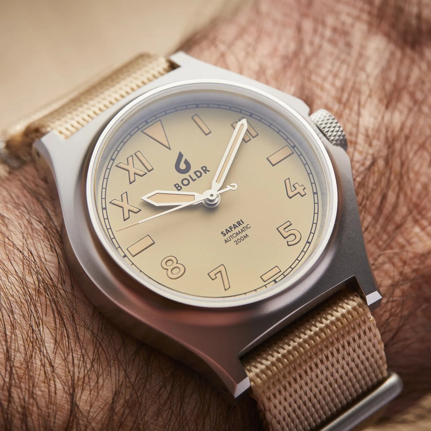 This Safari Ranger is a compact beast forged with stainless steel and a determination for exploration. Measuring 40mm across your wrist, it has the simple elegance of a field-style tool watch.
