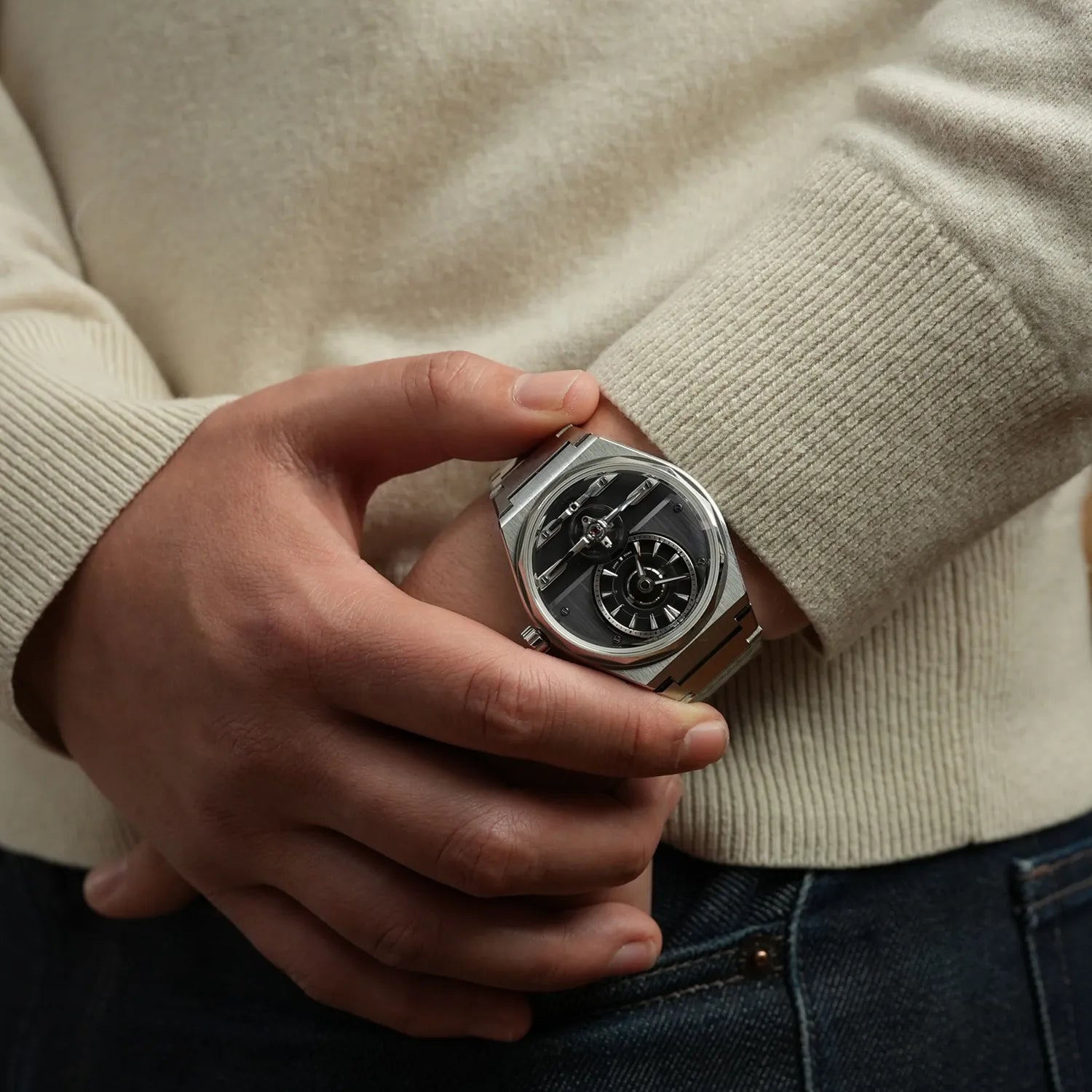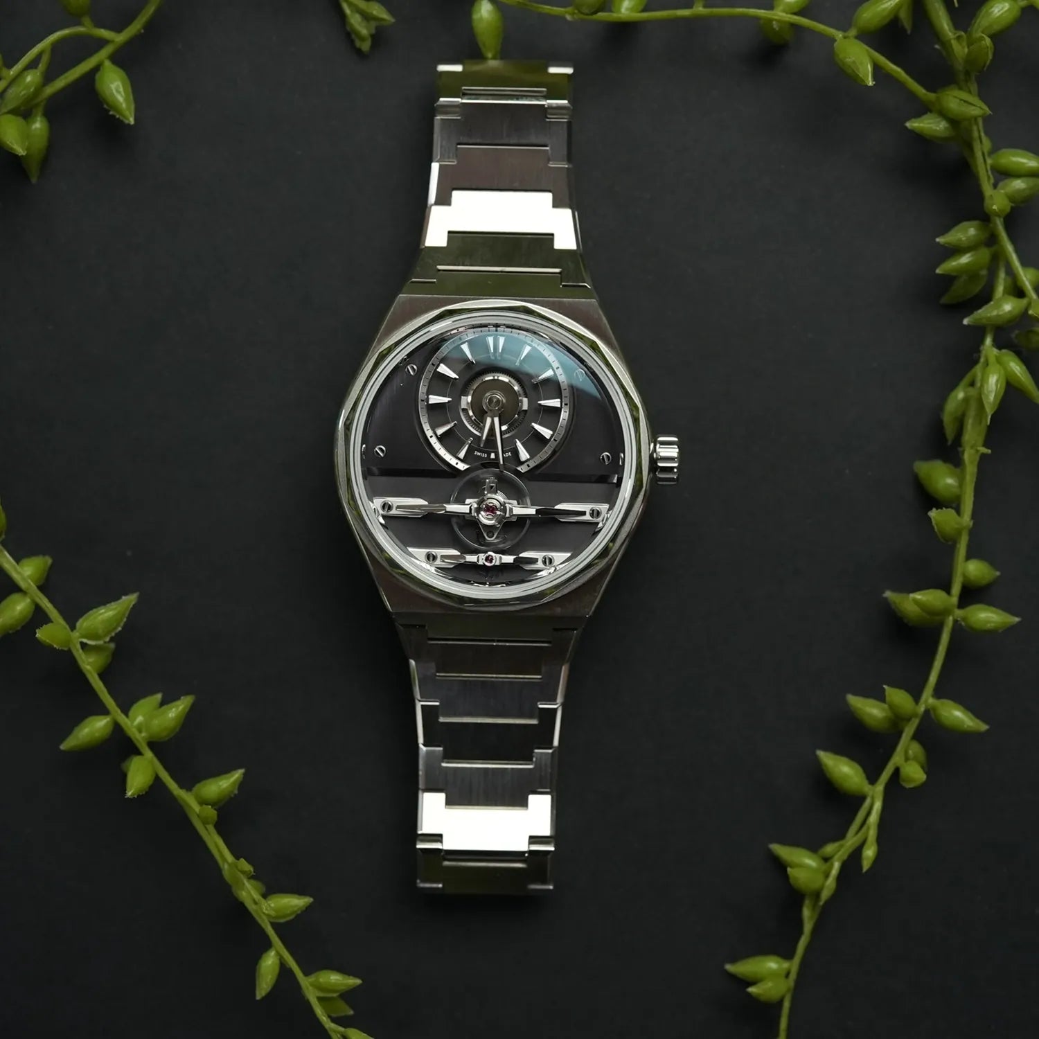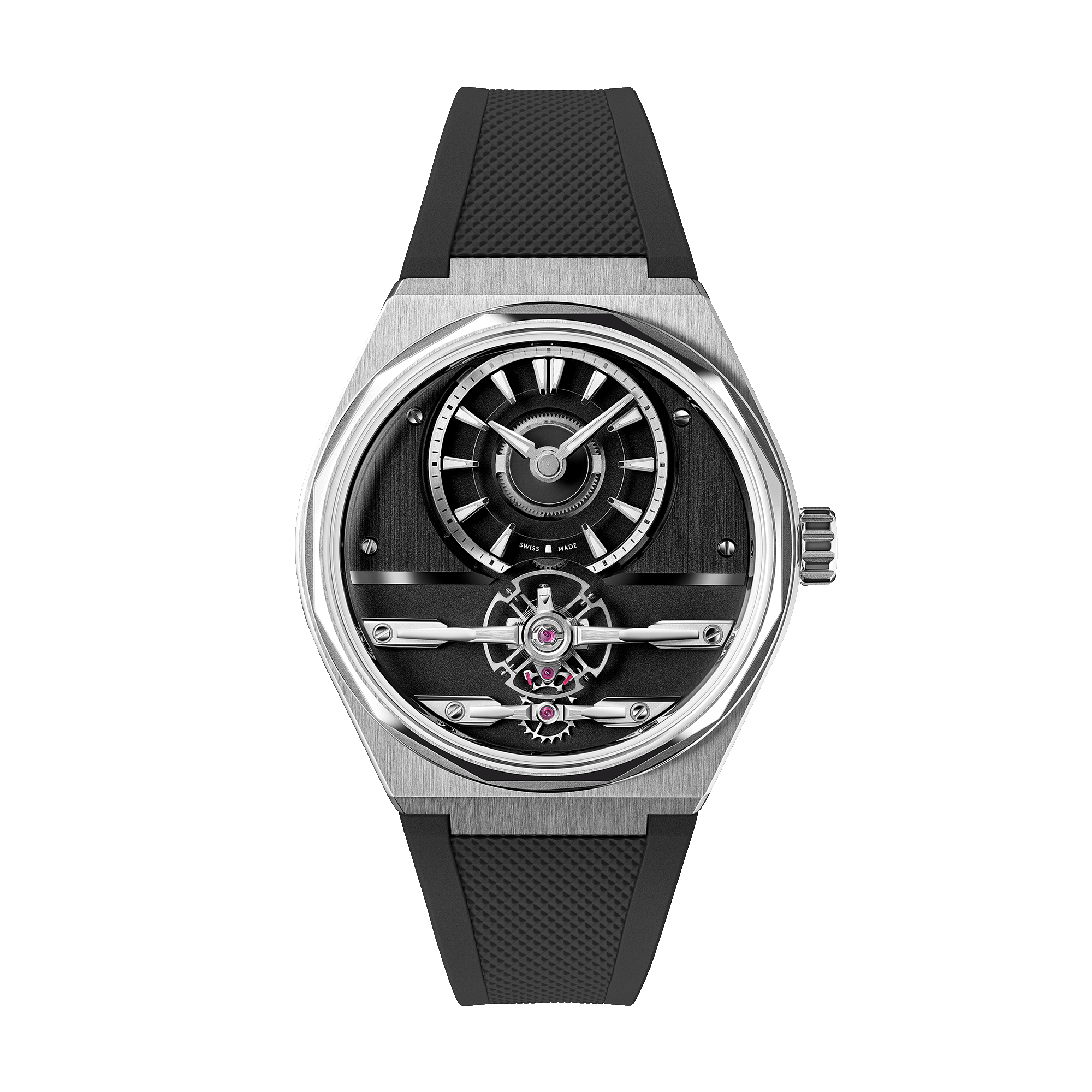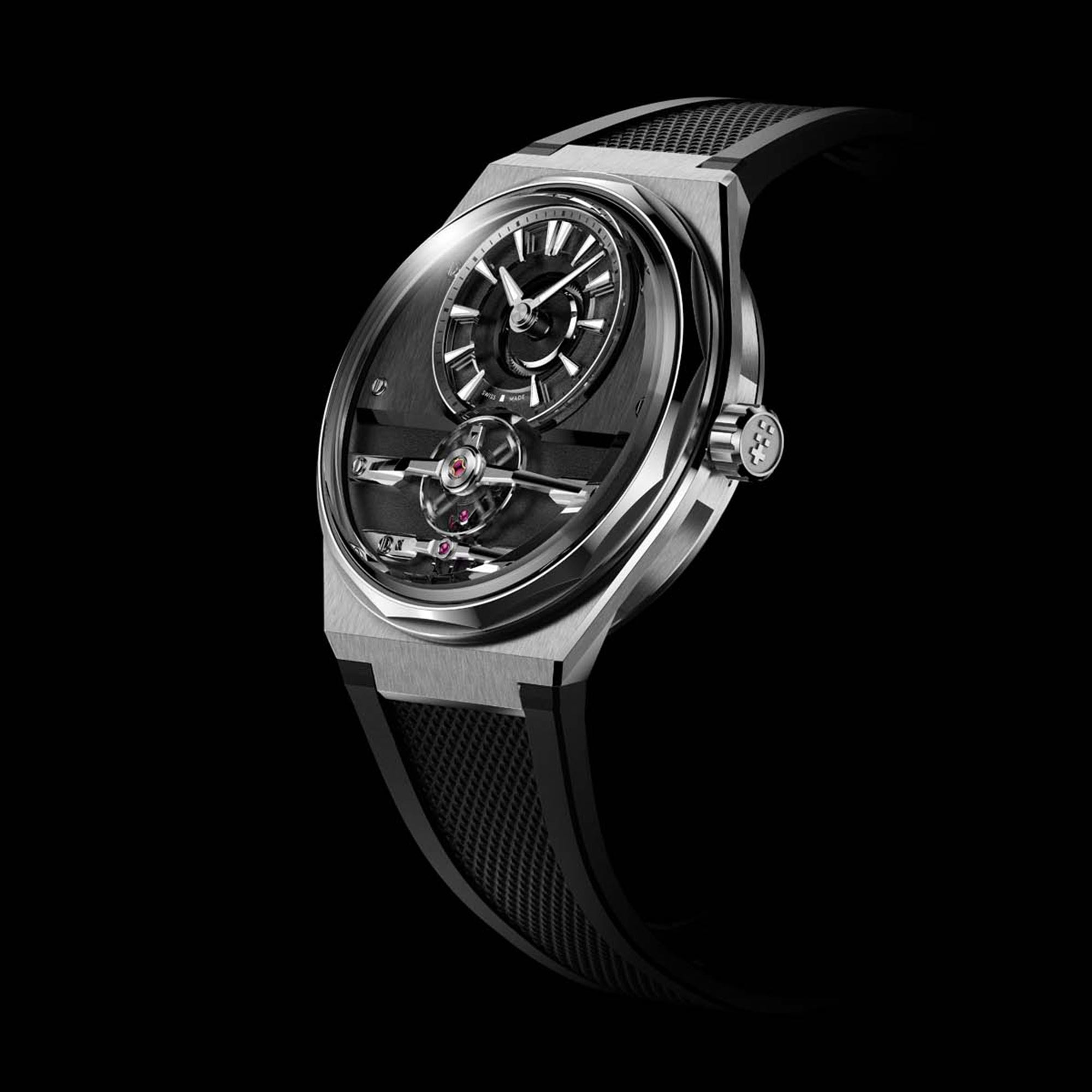 Open-worked and symmetrical by design, the movement is beautifully showcased beneath sapphire crystals front and back. Look closer and you’ll find hand-finished, multi-faceted bridges that reflect light with depth and detail, combining high-end aesthetics with mechanical sophistication.