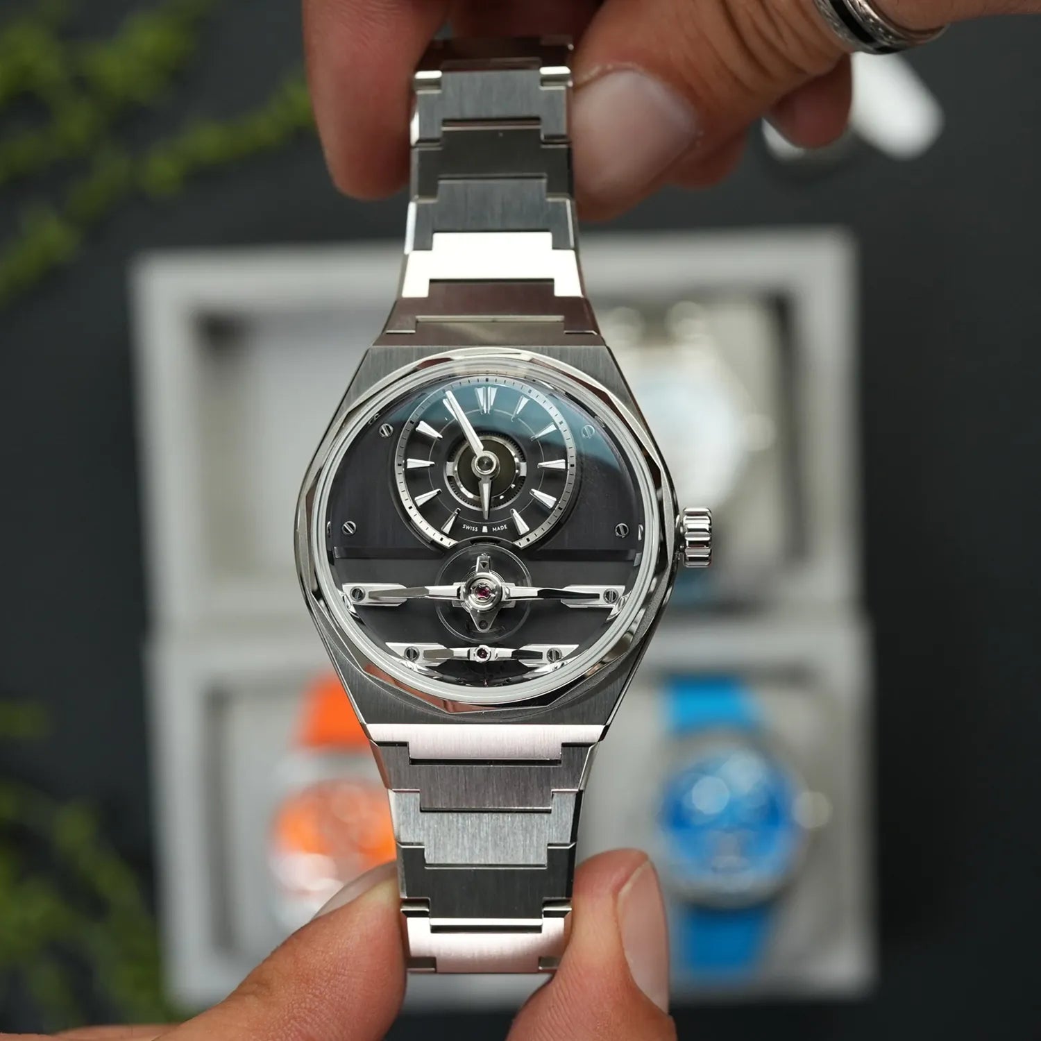 Refined for comfort, the updated 41mm Twelve case features sharply downturned lugs and a sleek profile at just 9.75mm thick (excluding crystals). It wears elegantly while delivering a bold technical statement – particularly in the striking metallic orange, vibrant blue, classic black or crisp white colourways, each chosen to complement the exposed movement within.