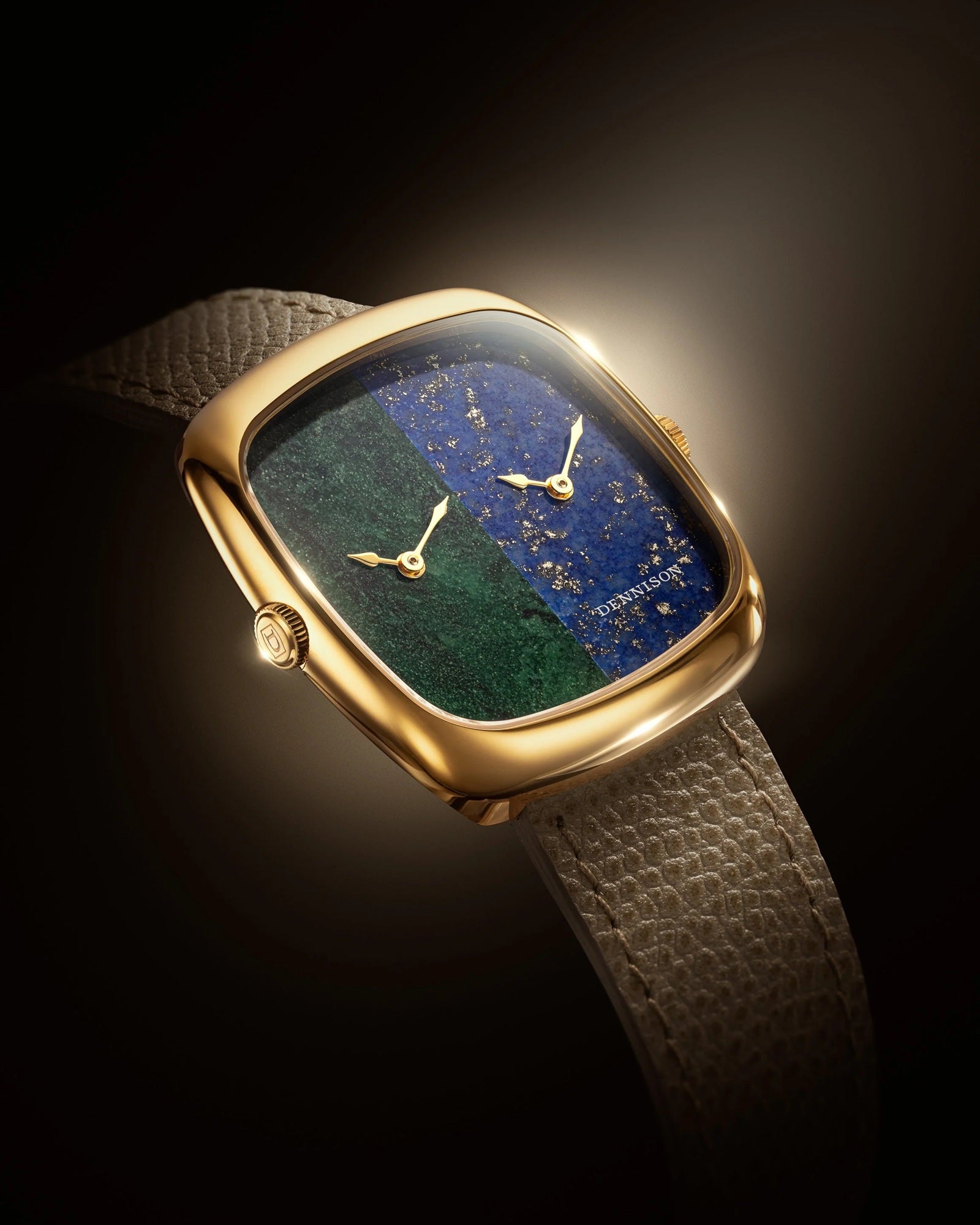 Dennison’s new watches make an immediate impression thanks to their distinctive 37mm cushioned square case. Available in either stainless steel or gold-tone cases, the A.L.D serves up different permutations of dials. From the eye-catching stone dials crafted in malachite, aventurine, or red agate, to the cleverly executed dual-time models, and capped off by the gradient models with their radial bursts of colour, all timepieces showcase Dennison’s design-led approach.