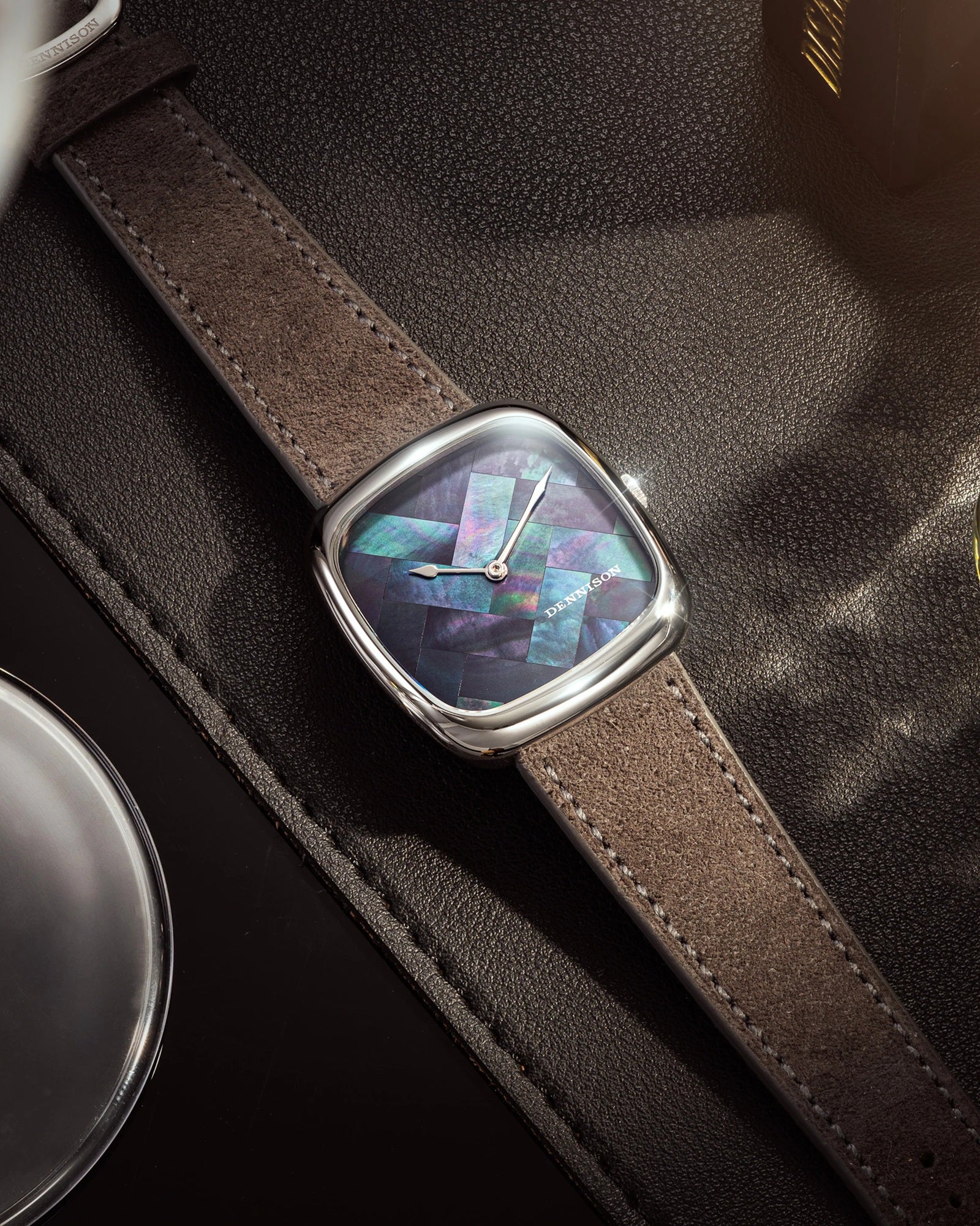For the Date Night limited edition model, Time+Tide joined forces with Dennison to create a timepiece that is as much art as it is watchmaking. Its mother-of-pearl dial showcases the meticulous marquetry technique, with hand-inlaid nacre filaments creating a shimmering, multidimensional effect. On the reverse, the caseback is adorned with Pietro Pilla’s engraved depiction of the doorway to Time+Tide’s London Watch Discovery Studio, adding a unique artistic signature.