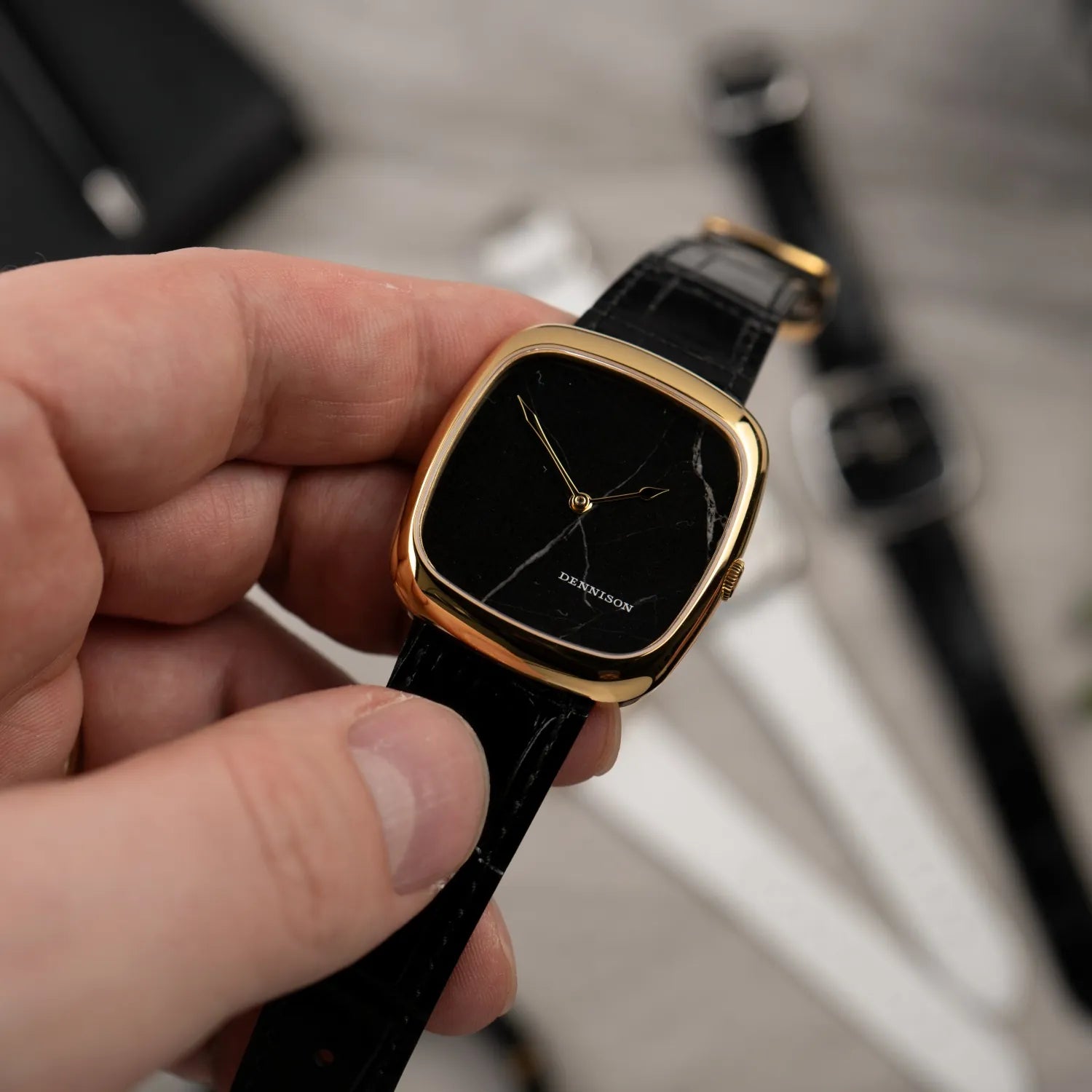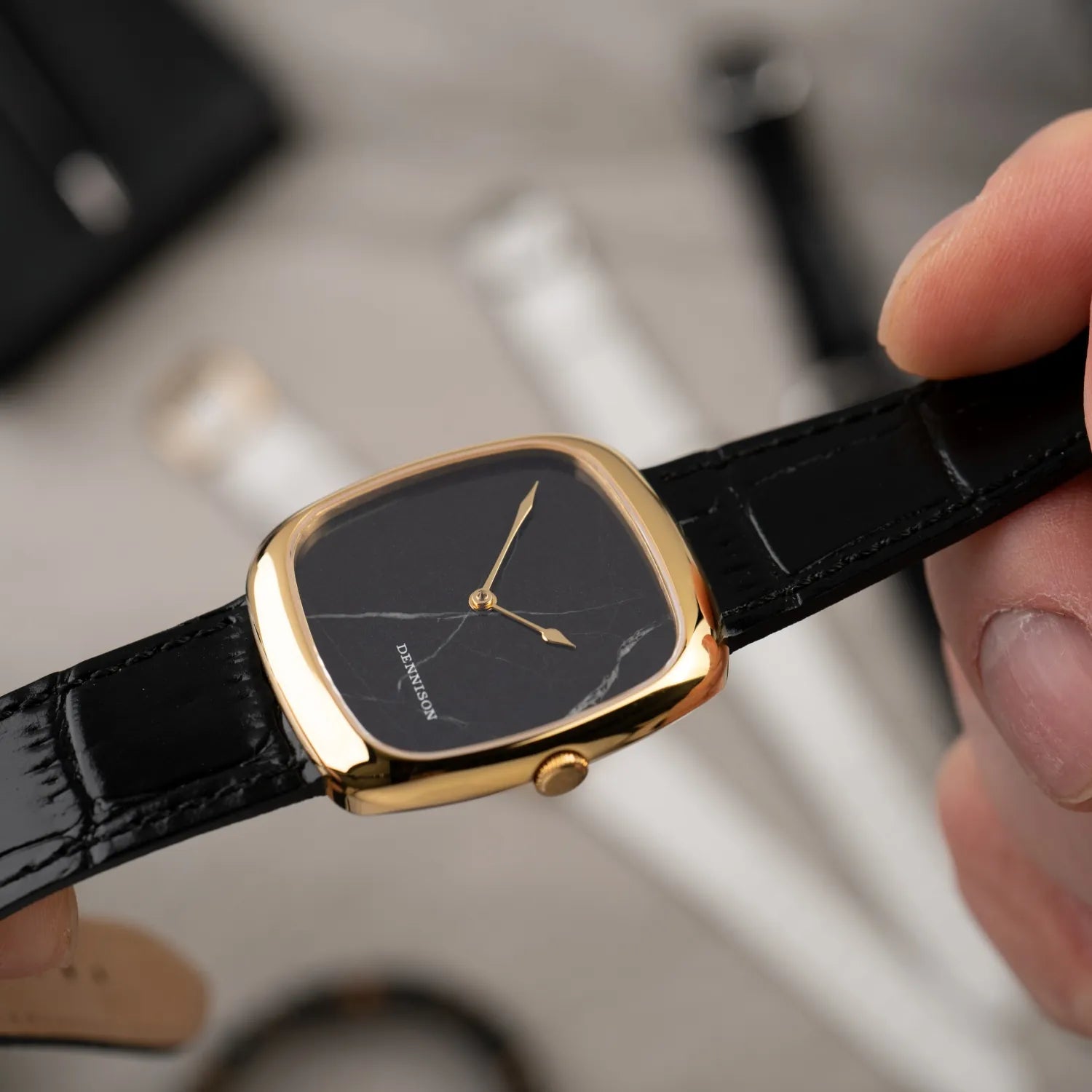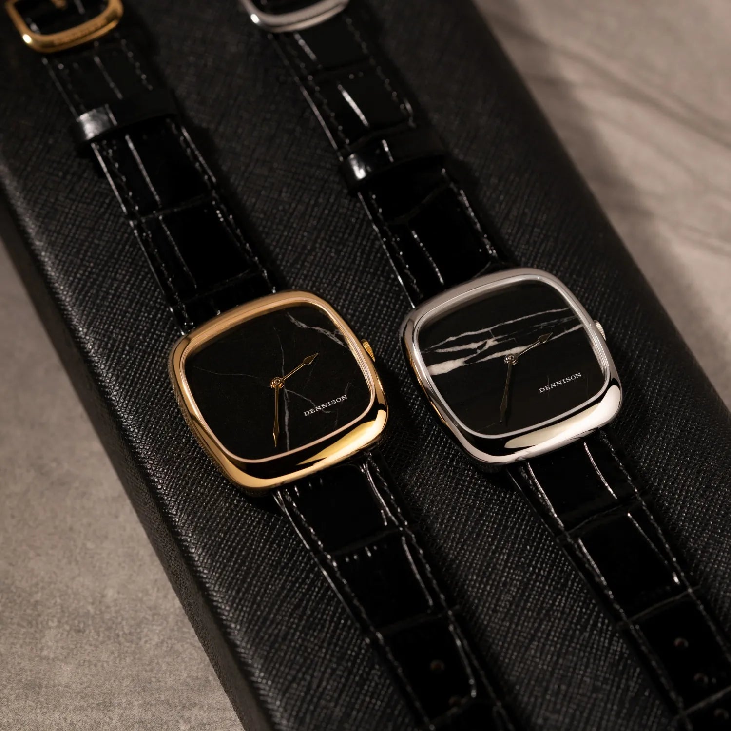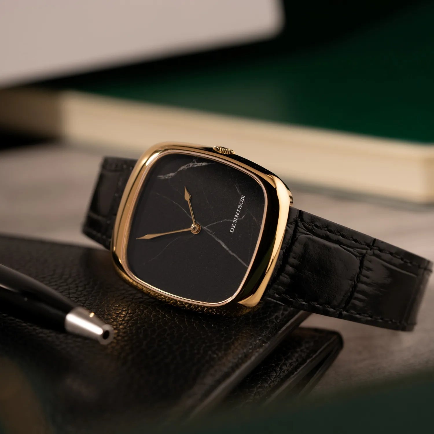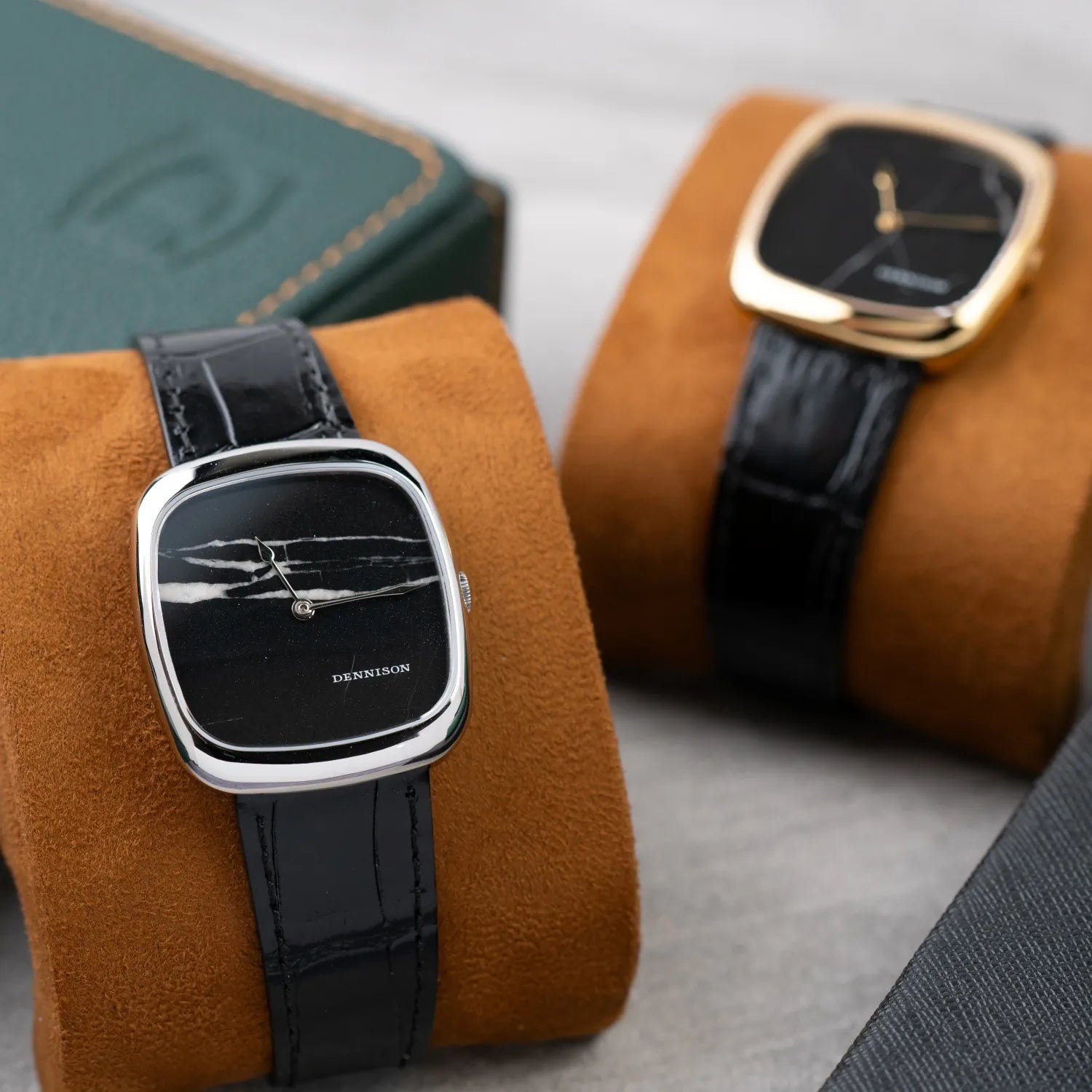 A distinguished revival of the classic Dennison cushion case, the ALD Collection channels the timeless refinement and flair of the 1960s. The dial features natural black marble, chosen for its dramatic and striking vein patterns reminiscent of lightning bolts, with each piece cut and polished to reveal its unique character. The steel case measures 37mm by 33.5mm with a 6mm thickness. It is complemented by an embossed brown leather strap with a bespoke pin-buckle that echoes the elegant curvature and finish of the case. A testament to enduring style and subtle detail. Additional strap colours can be added to your order.