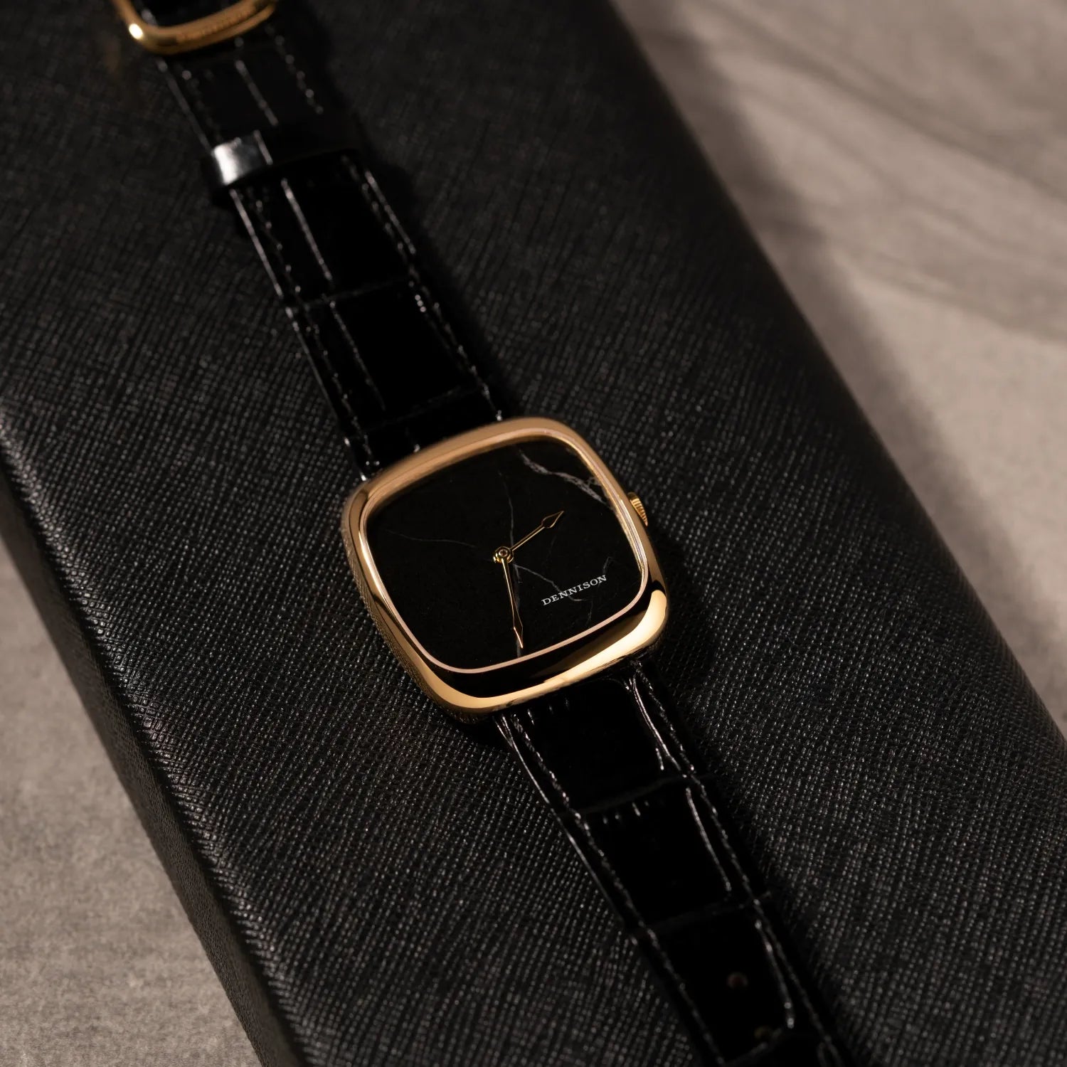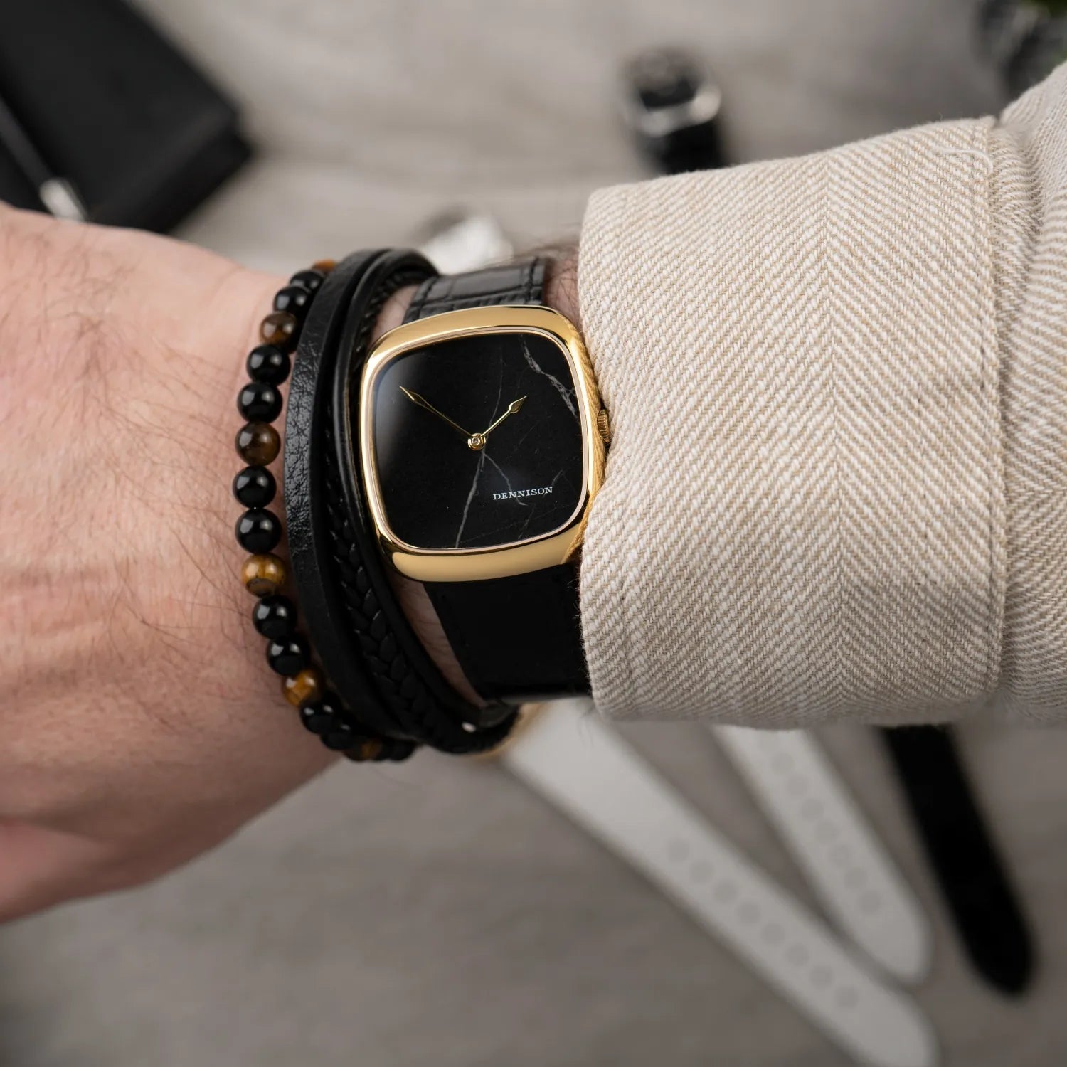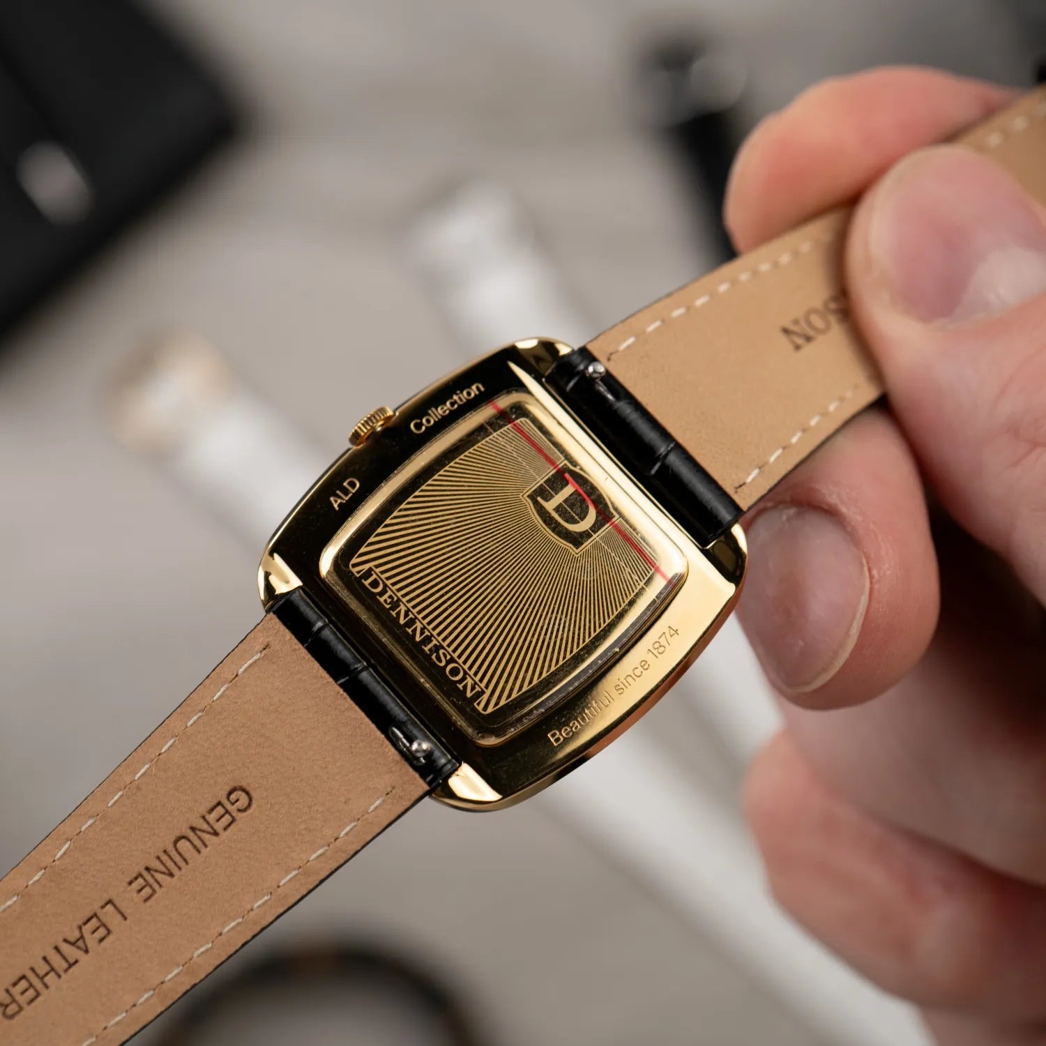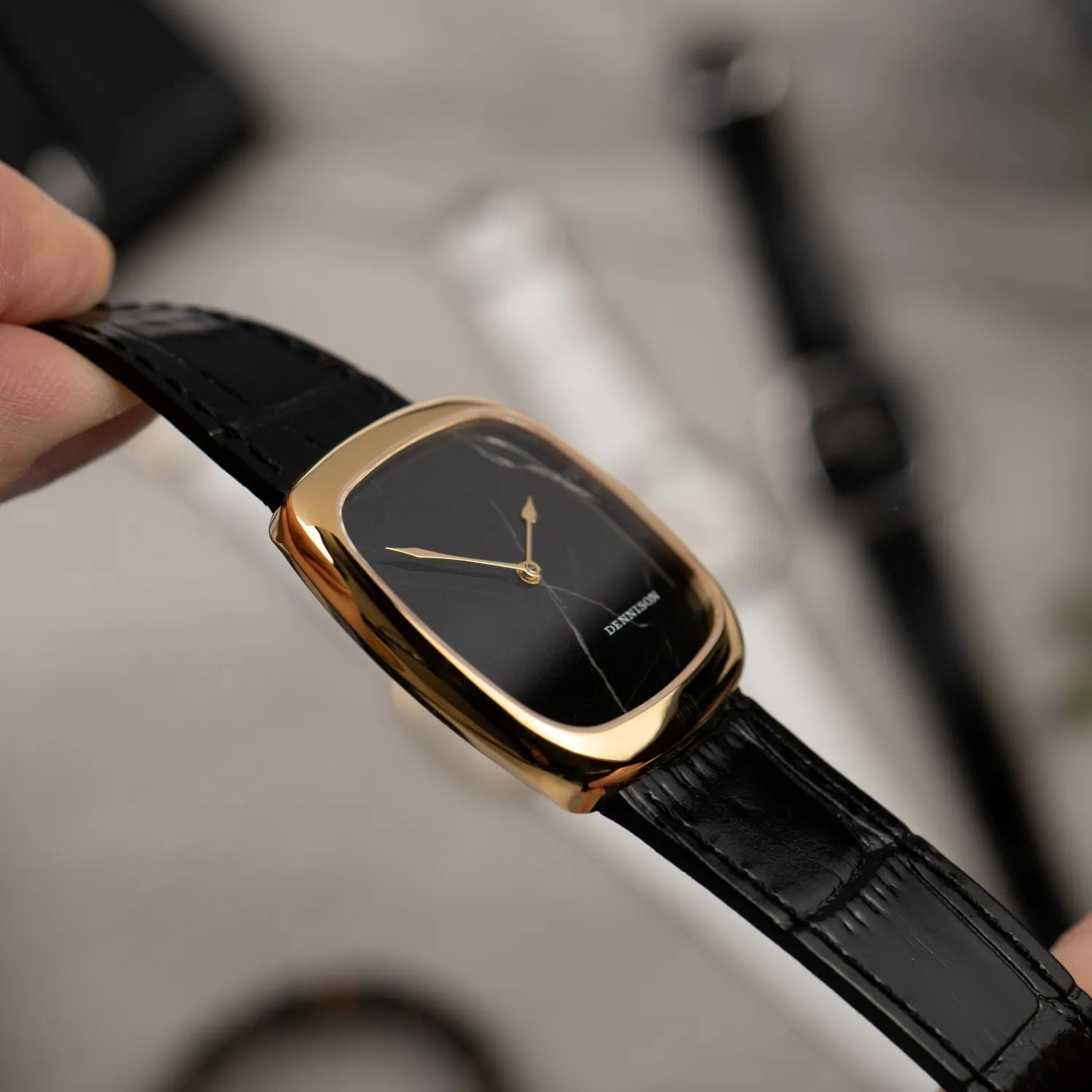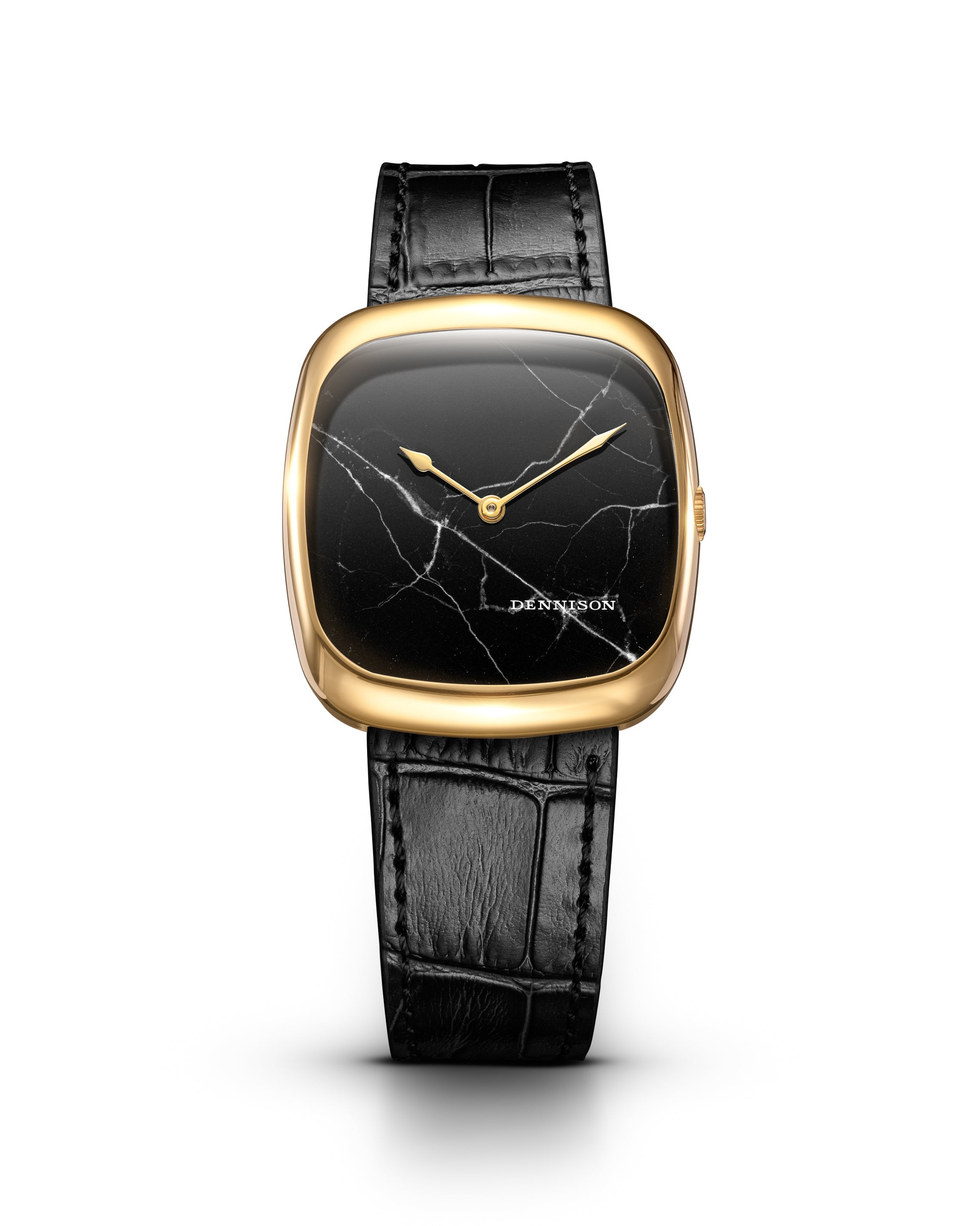 A distinguished revival of the classic Dennison cushion case, the ALD Collection channels the timeless refinement and flair of the 1960s. The dial features natural black marble, chosen for its dramatic and striking vein patterns reminiscent of lightning bolts, with each piece cut and polished to reveal its unique character. The steel case measures 37mm by 33.5mm with a 6mm thickness. It is complemented by an embossed brown leather strap with a bespoke pin-buckle that echoes the elegant curvature and finish of the case. A testament to enduring style and subtle detail. Additional strap colours can be added to your order.