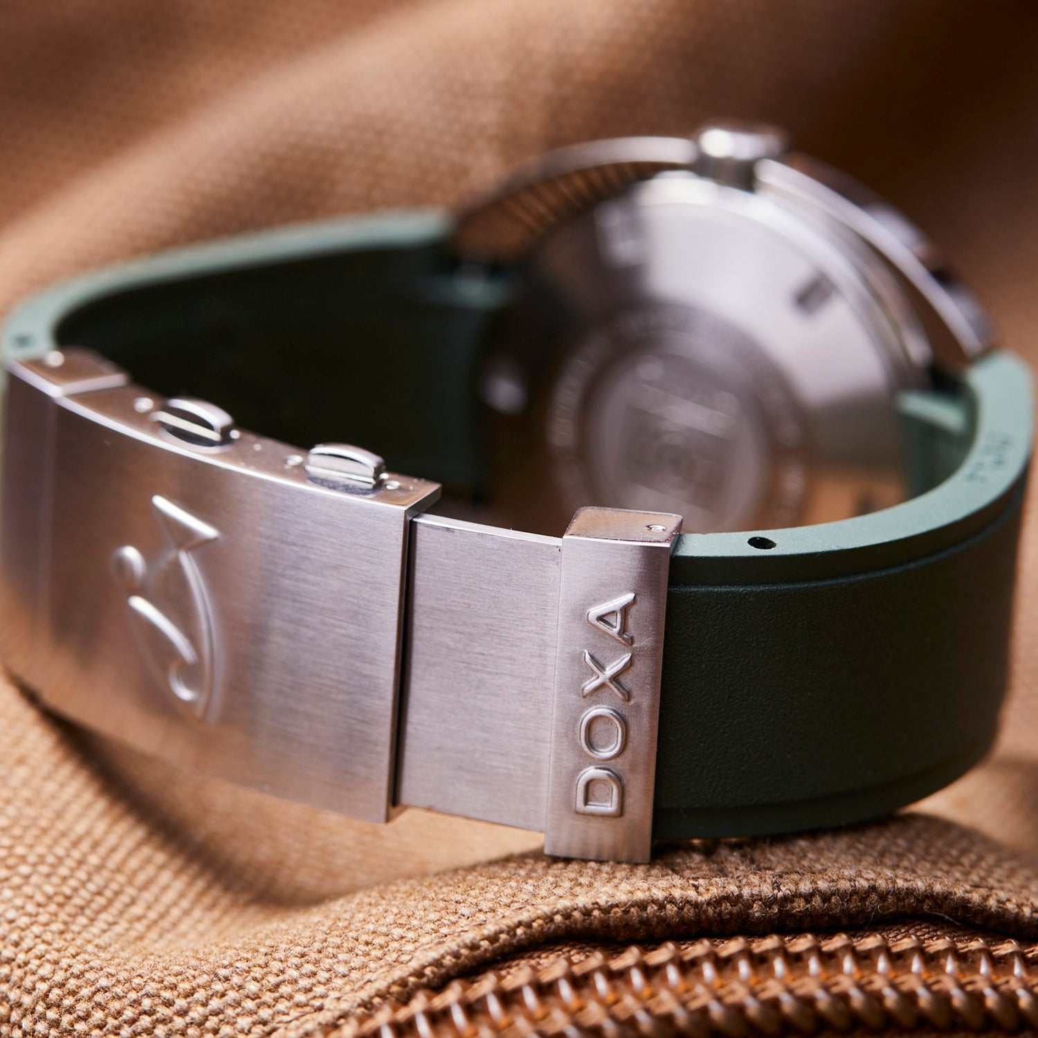 All diving-related indications are enhanced with a Super-LumiNova luminescent coating to ensure optimal readability underwater. The watch comes with the choice of a stainless steel 'beads of rice' bracelet with folding clasp and exclusive DOXA fish symbol or an FKM rubber strap in black or hunter green. Included in the box with each Doxa Army comes is an additional NATO camouflage strap. The special case features the original camouflage pattern of the field uniform worn at the time by the Swiss Army.