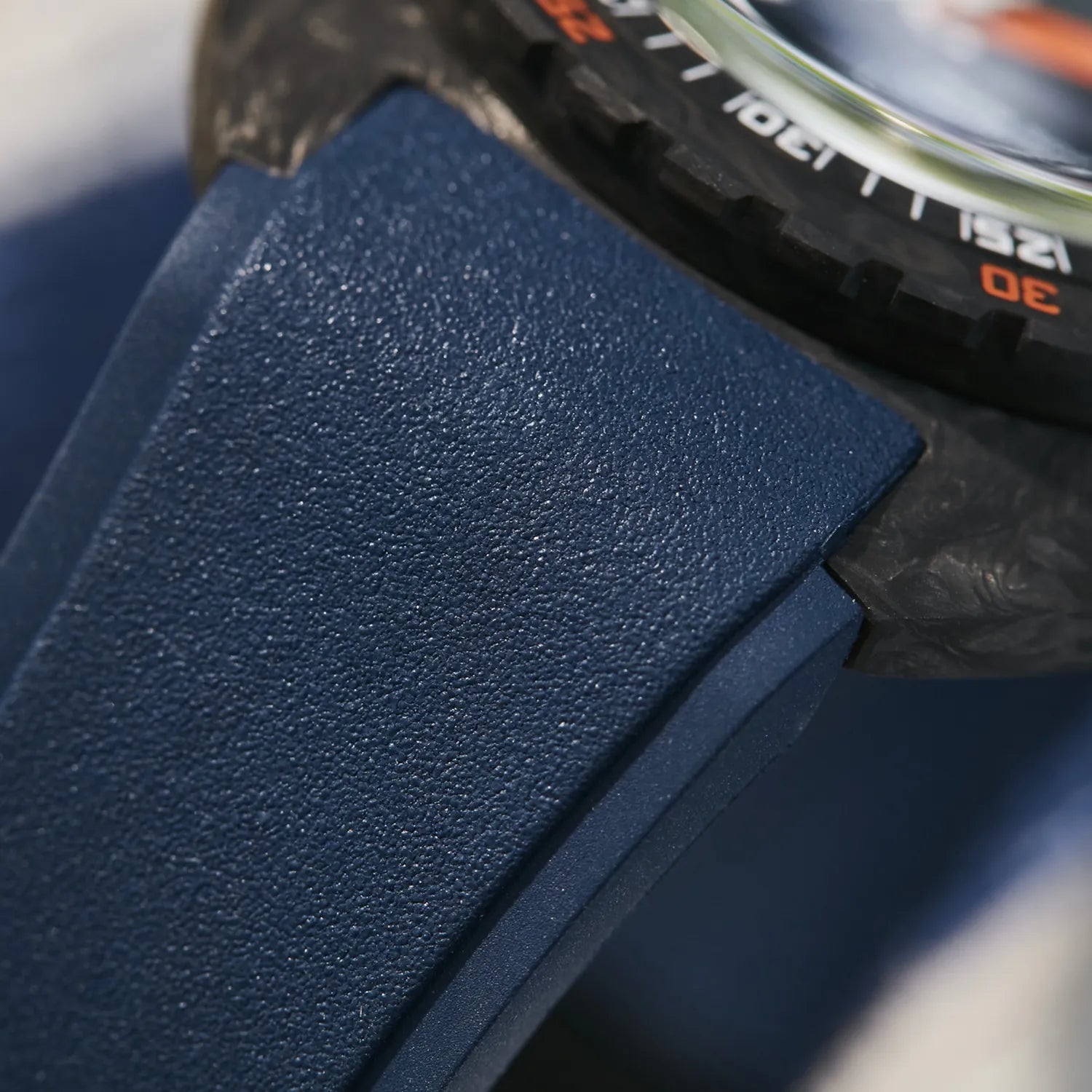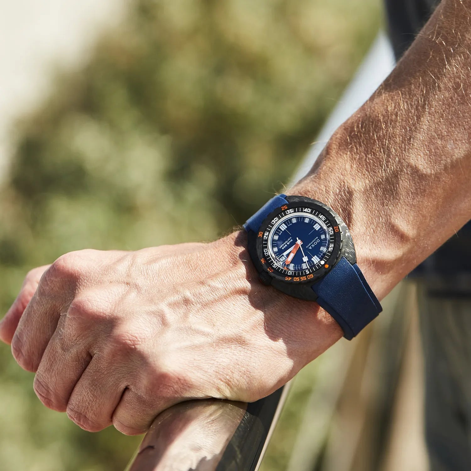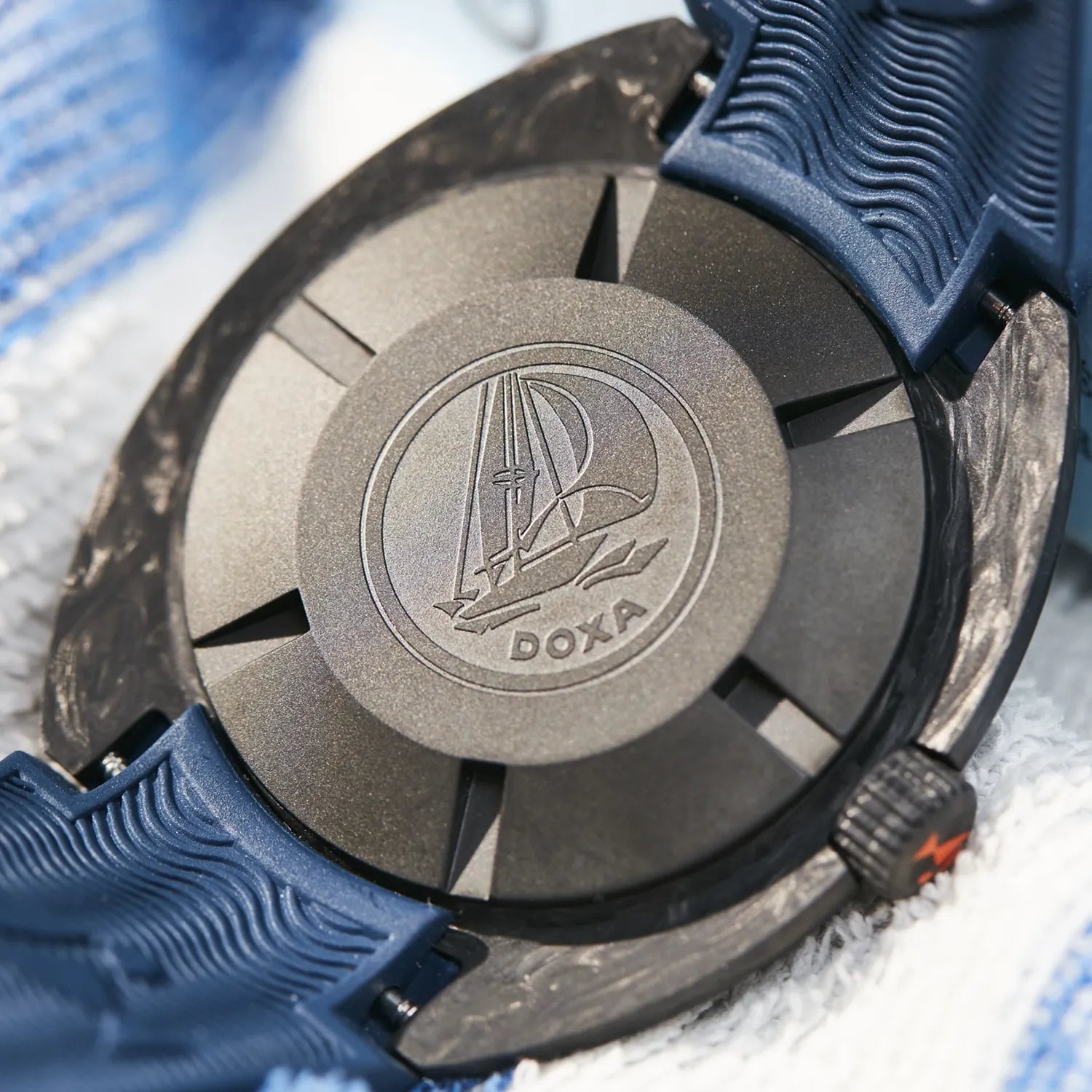 The SUB 300 in carbon is available in 6 colors with the choice of a rubber strap in black or in the same color as the dial. Featuring distinctive DOXA cues on both sides, the strap is fitted with a black PVD-treated folding clasp decorated with the exclusive DOXA fish symbol. It also has an adjustable diving extension to accommodate the thickness of a wetsuit.