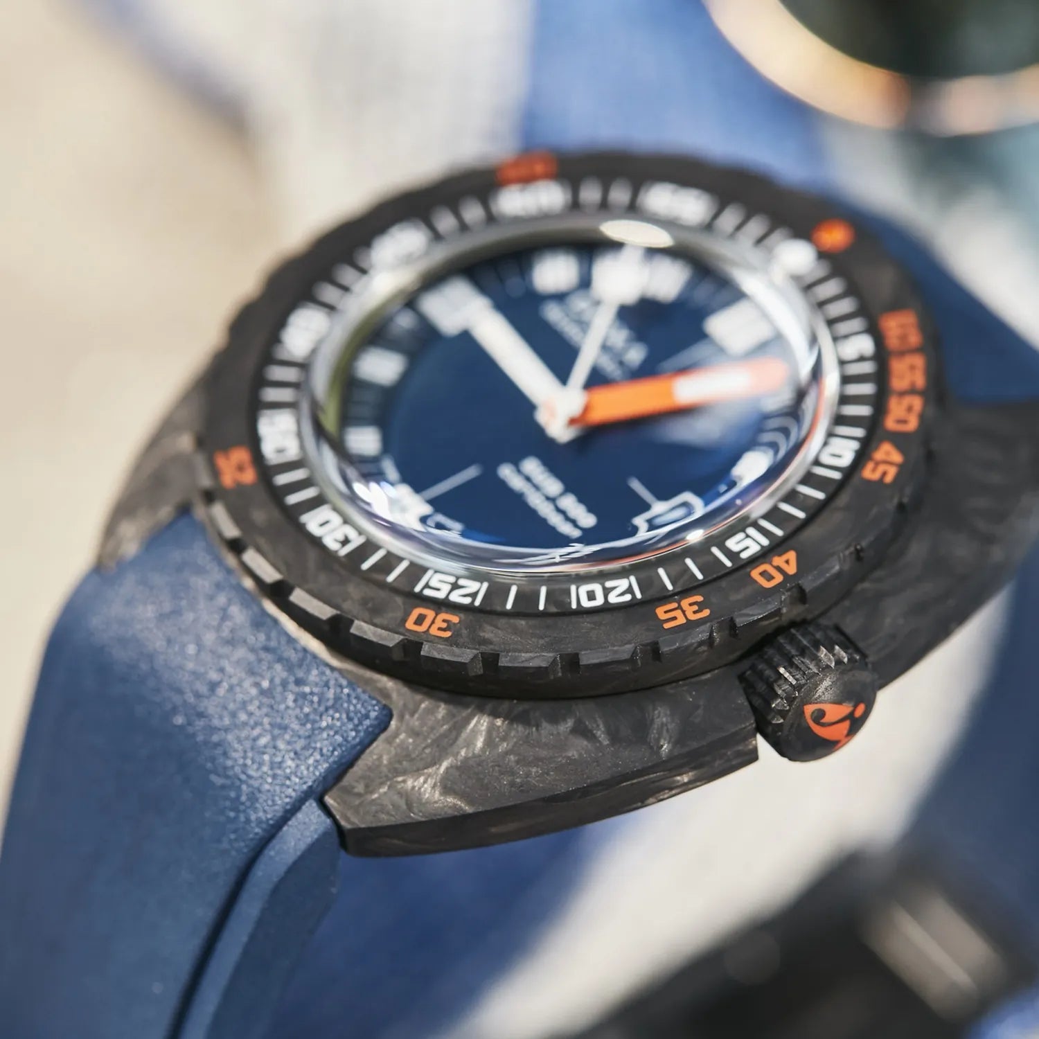 The SUB 300 in carbon remains true to its origins while cultivating an edgier, more technical, but also more urban look and feel. It takes the legend into the future, with a high-performance, putting an advanced lightweight material at the service of function. With a diameter of 42.5 mm, the carbon SUB 300 features a pressure-resistant titanium casing to protect the movement and a screw-down crown. It is rated to 300 meters, equivalent to approximately 980 feet. Precision, robustness, reliability the SUB 300s automatic three-hand movement holds the prestigious COSC Certified Chronometer certification guaranteeing all three. It also provides a 38-hour power reserve. The date window is positioned at 3 o'clock. The scratch-resistant sapphire crystal with an anti-reflective treatment is domed: a tribute to its heritage and the curved plexiglass of the very first SUB 300. All dive-related markings have a Super-LumiNova luminescent coating to ensure optimum legibility even in low-visibility conditions.