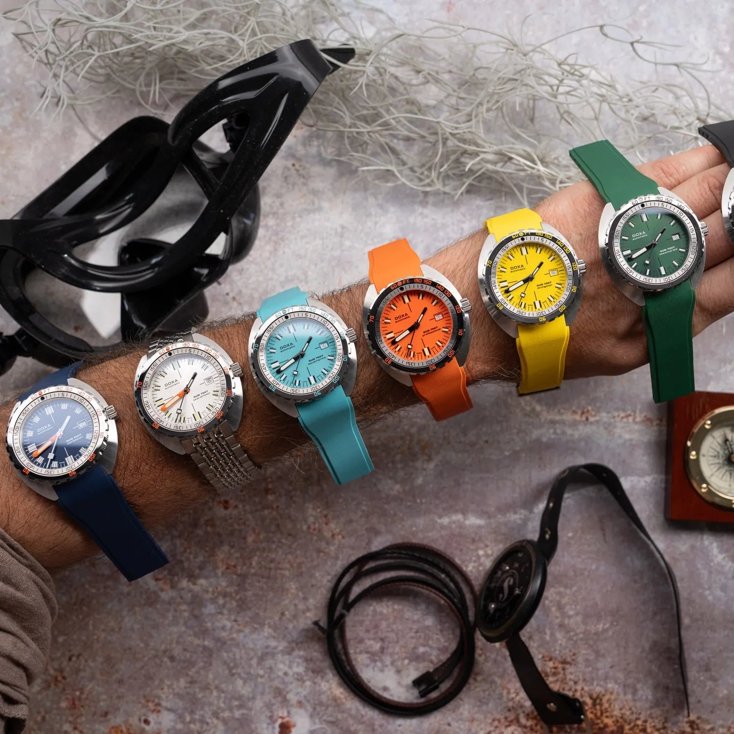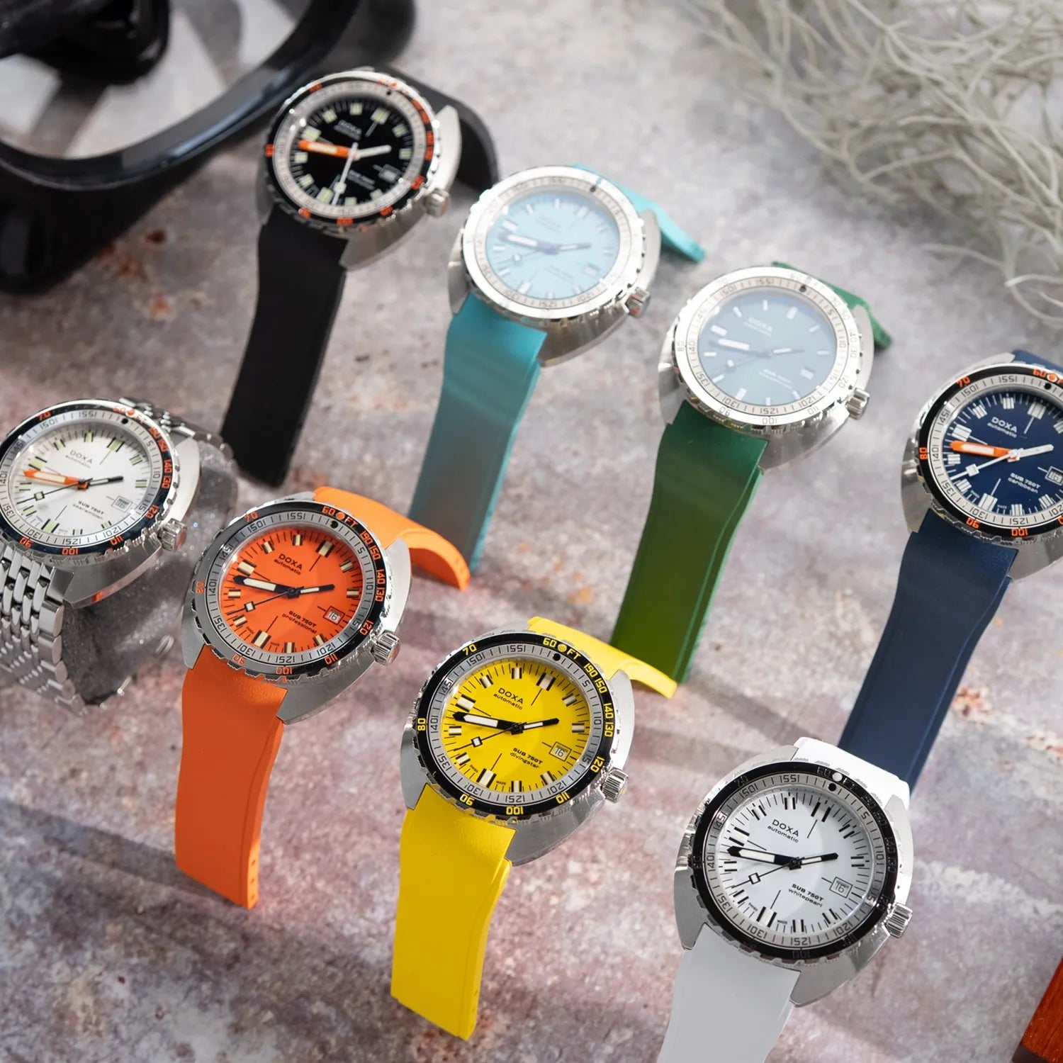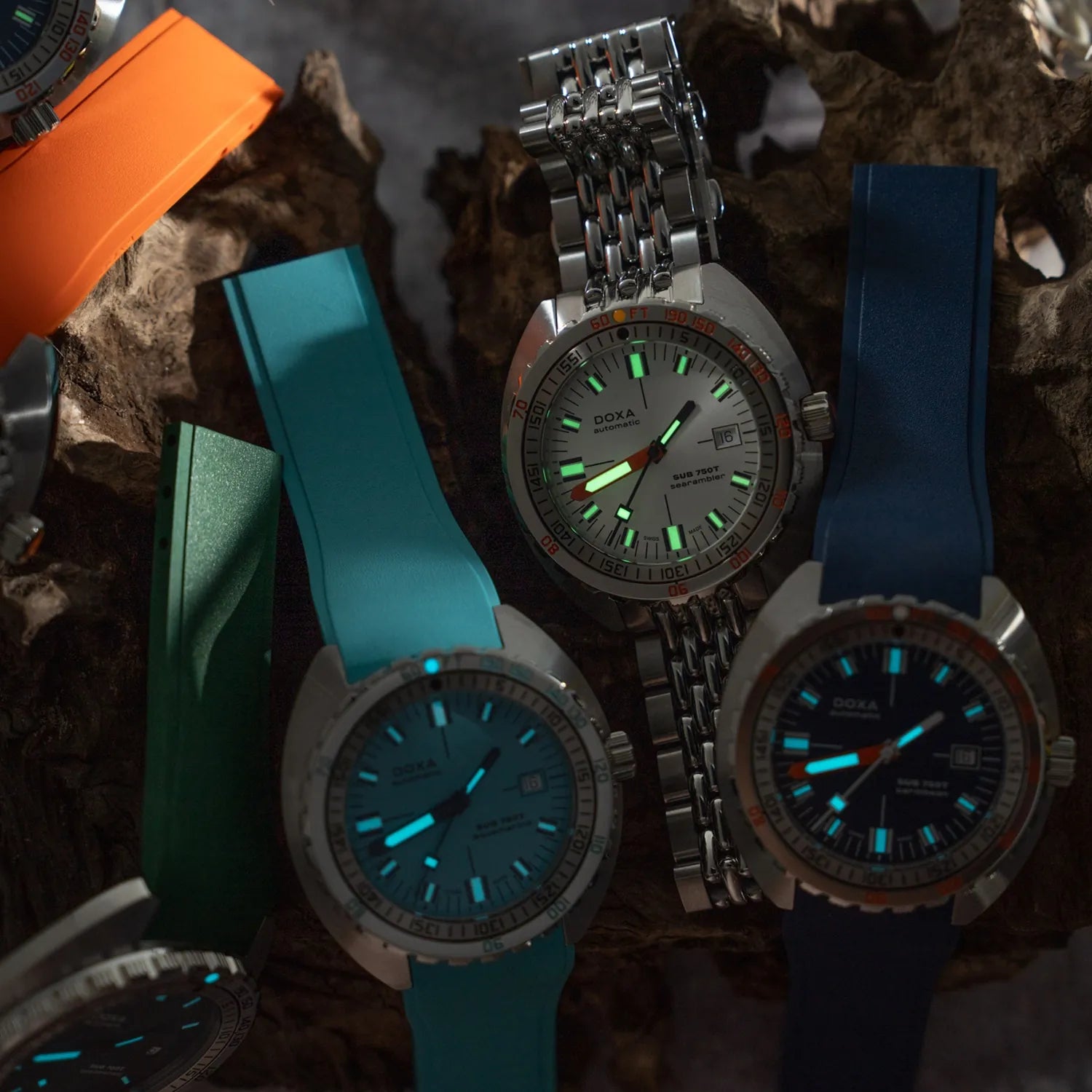 Today, DOXA brings this icon into the present with a completely reimagined design. The new SUB 750T preserves the DNA of the original with its bold presence, uncompromising build, and rugged reliability while introducing a slimmer and more modern silhouette. The redesigned case remains substantial at 45.00 x 47.00 mm but has been refined to 11.95 mm in thickness, making it lighter, more comfortable, and better suited to contemporary wear.