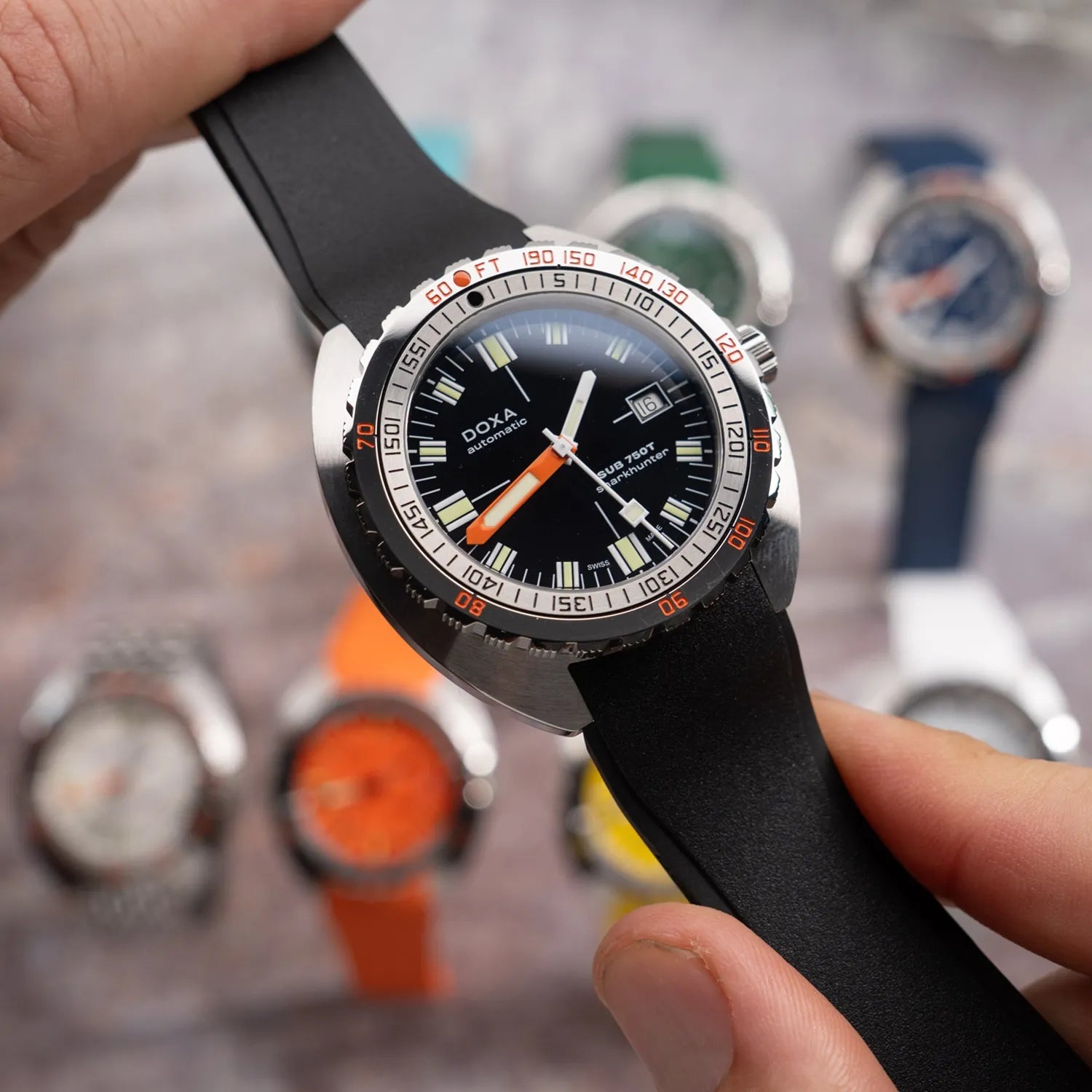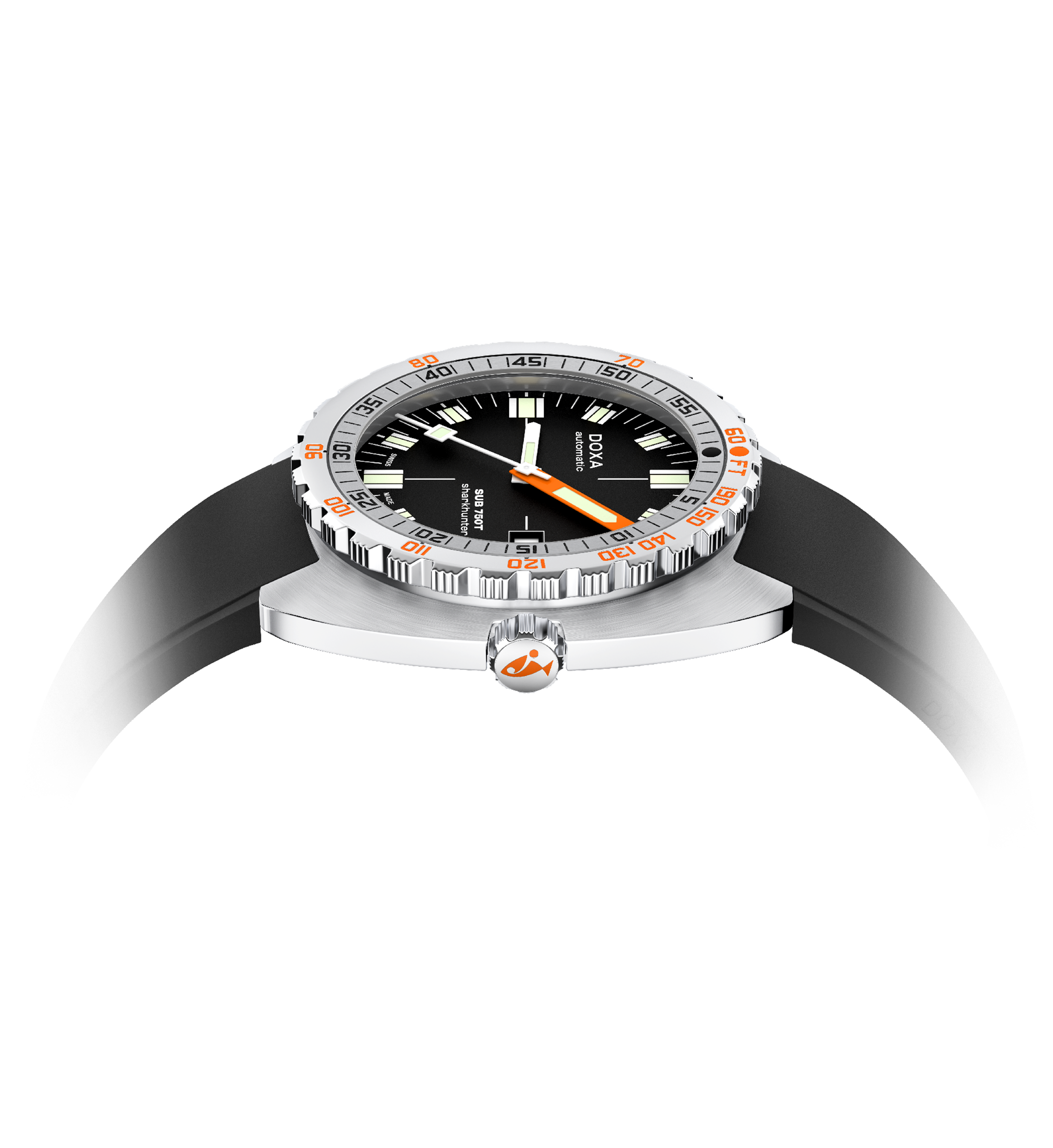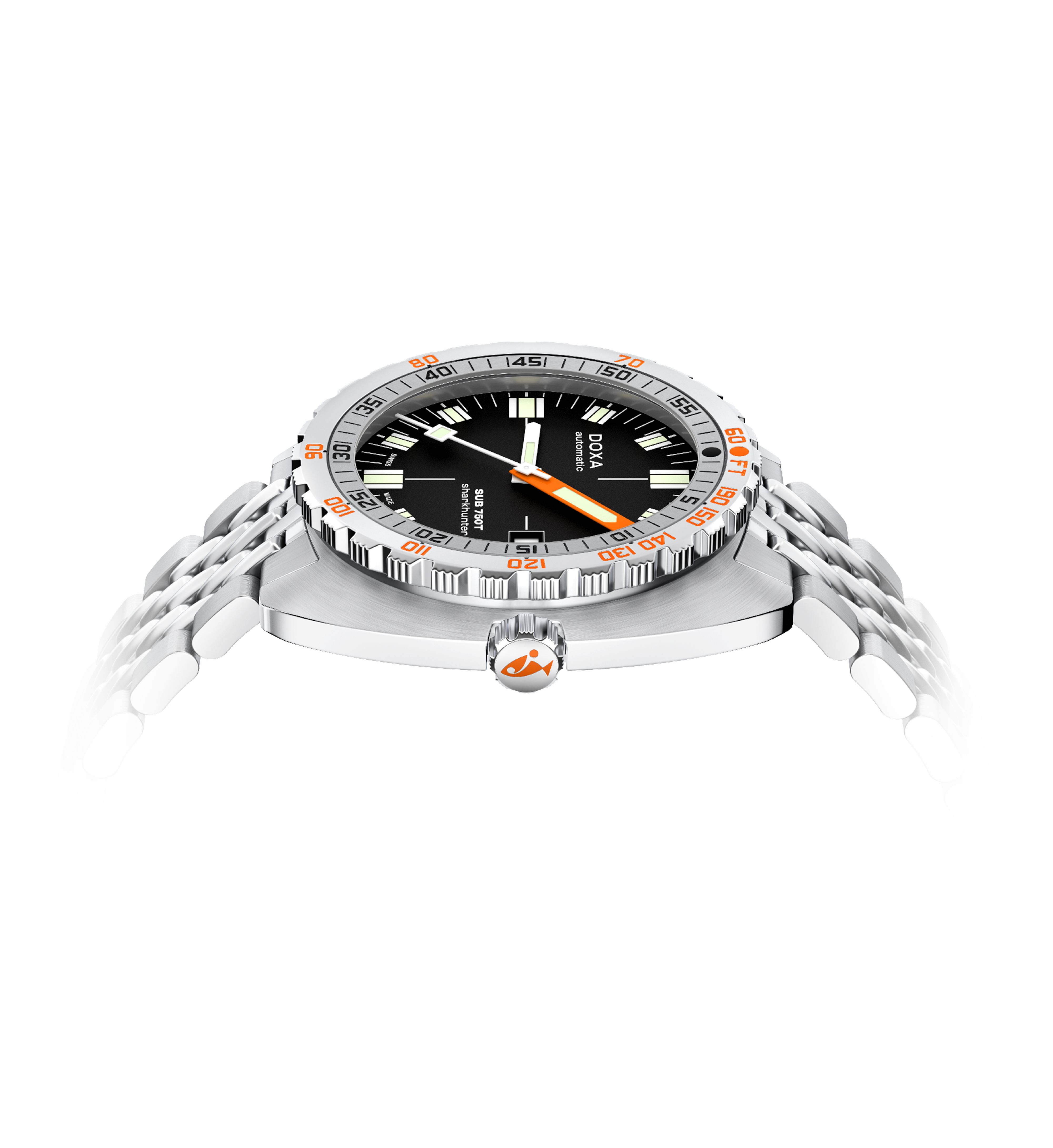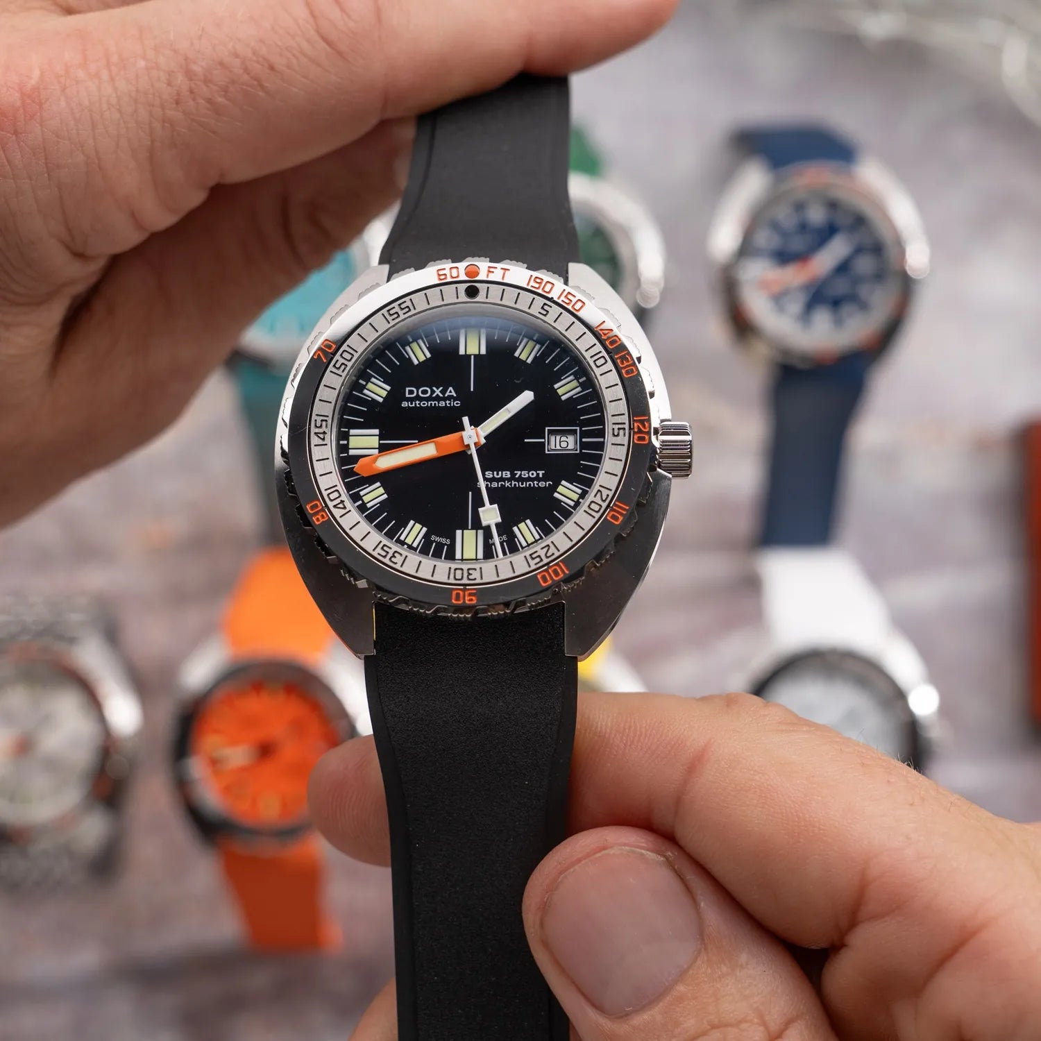 Today, DOXA brings this icon into the present with a completely reimagined design. The new SUB 750T preserves the DNA of the original with its bold presence, uncompromising build, and rugged reliability while introducing a slimmer and more modern silhouette. The redesigned case remains substantial at 45.00 x 47.00 mm but has been refined to 11.95 mm in thickness, making it lighter, more comfortable, and better suited to contemporary wear.