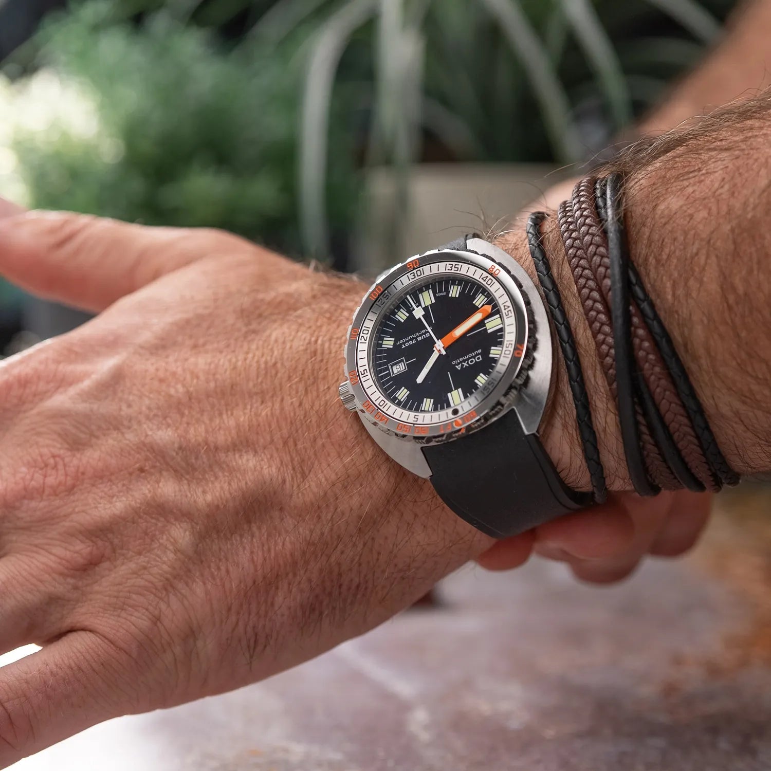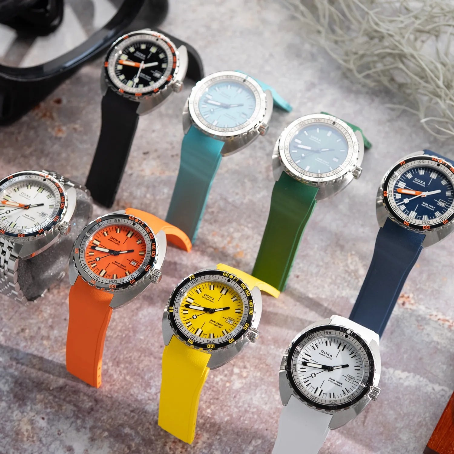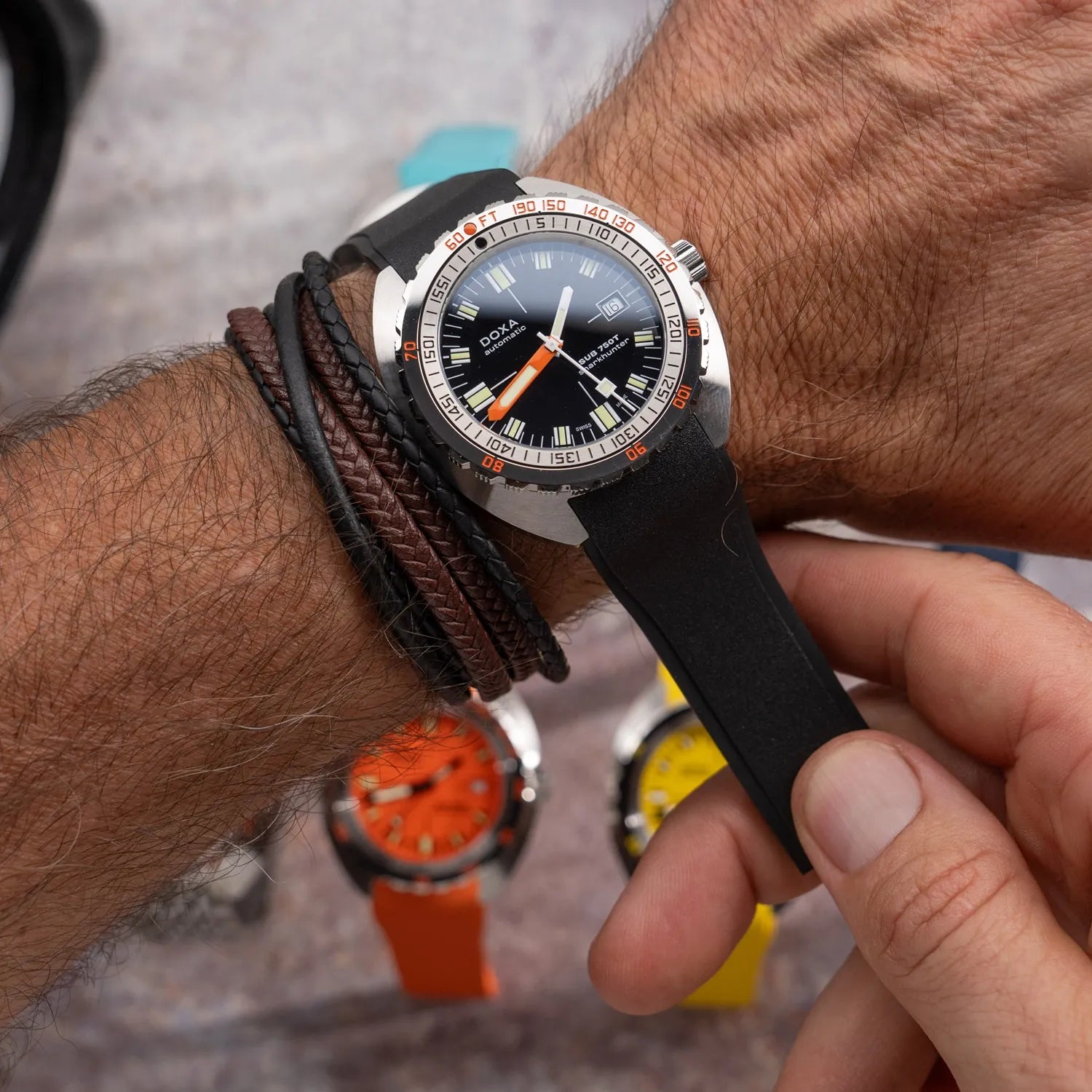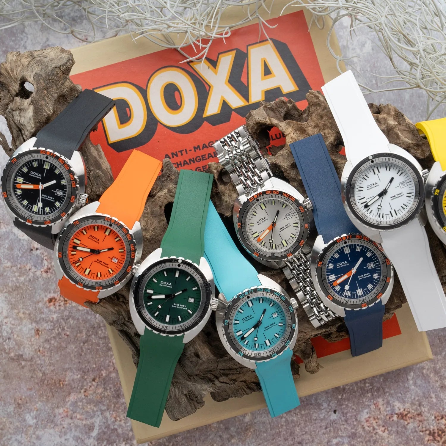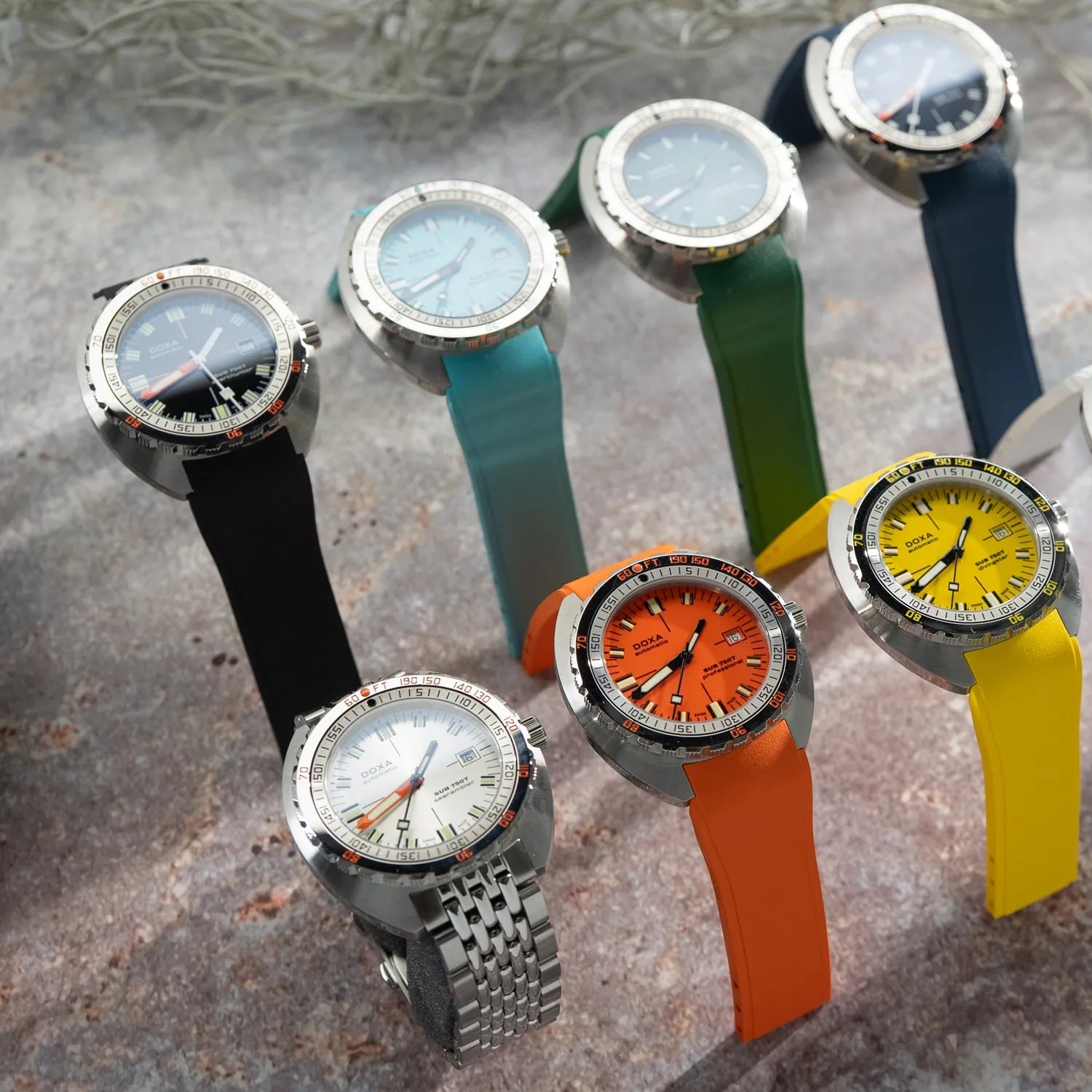 Today, DOXA brings this icon into the present with a completely reimagined design. The new SUB 750T preserves the DNA of the original with its bold presence, uncompromising build, and rugged reliability while introducing a slimmer and more modern silhouette. The redesigned case remains substantial at 45.00 x 47.00 mm but has been refined to 11.95 mm in thickness, making it lighter, more comfortable, and better suited to contemporary wear.