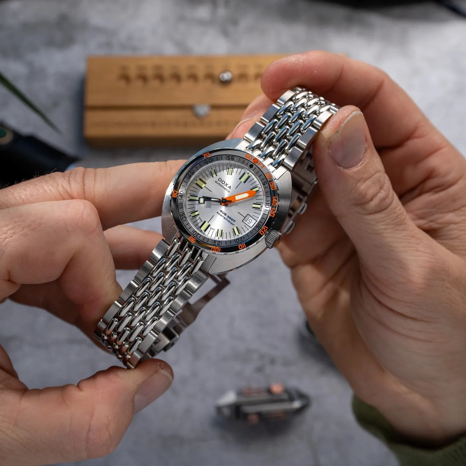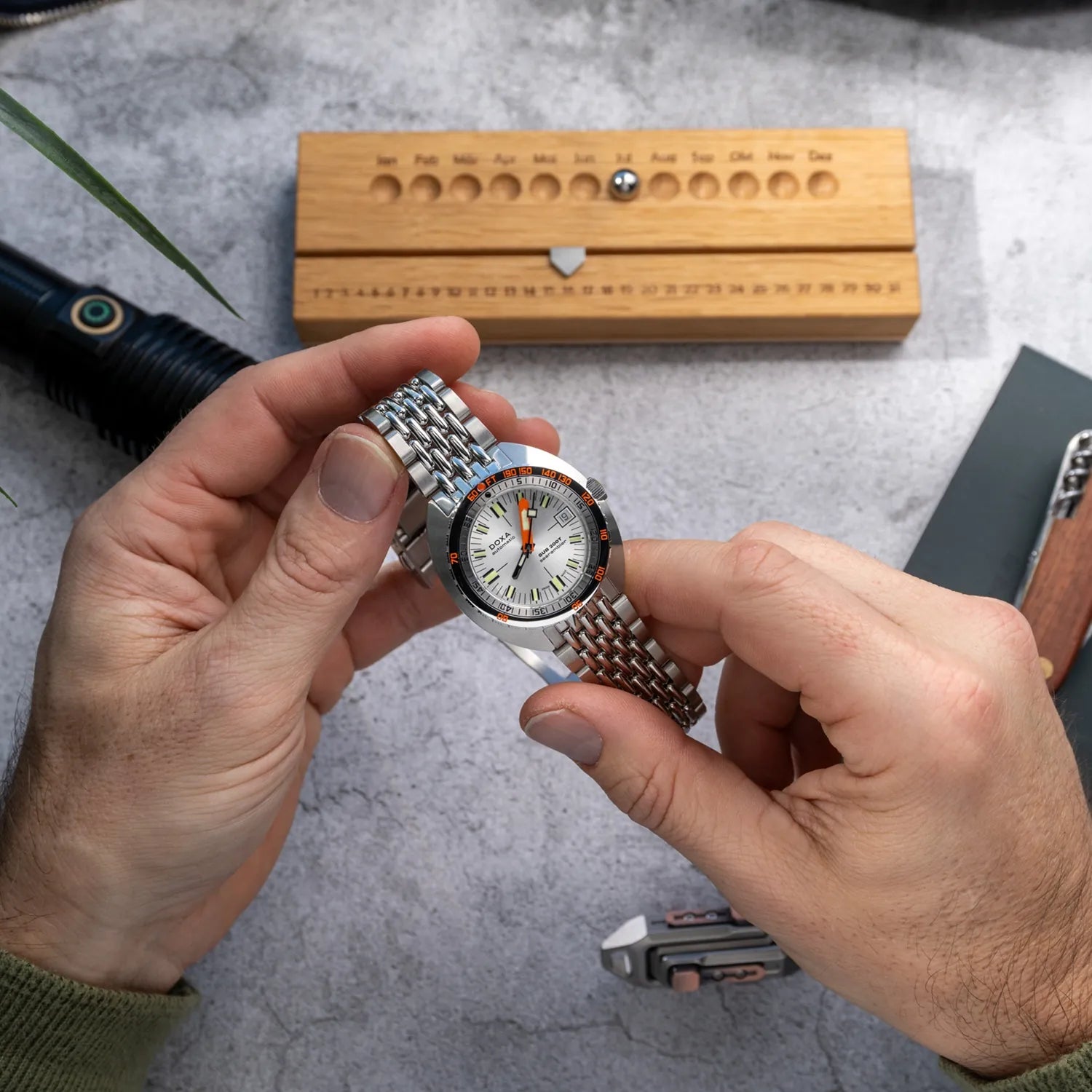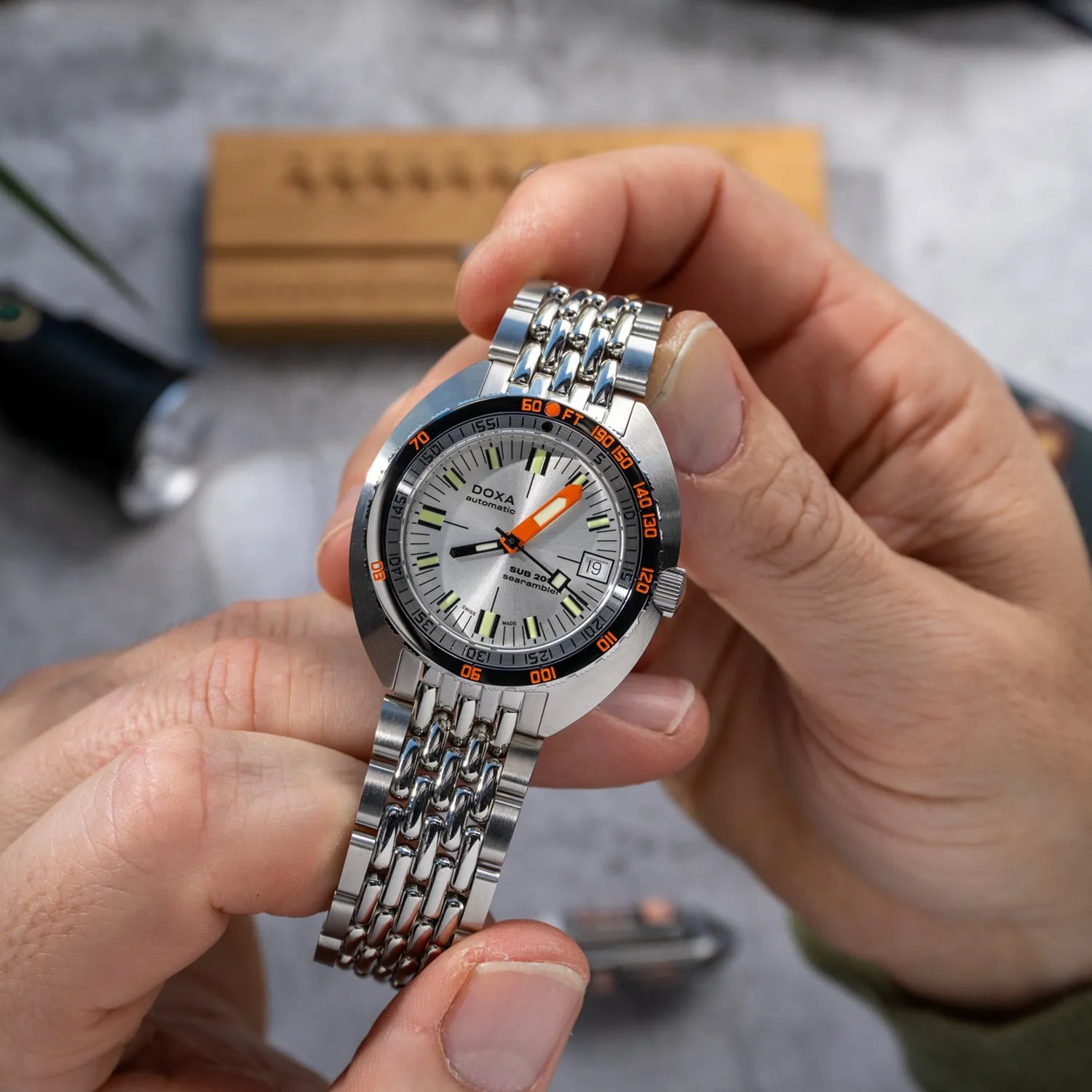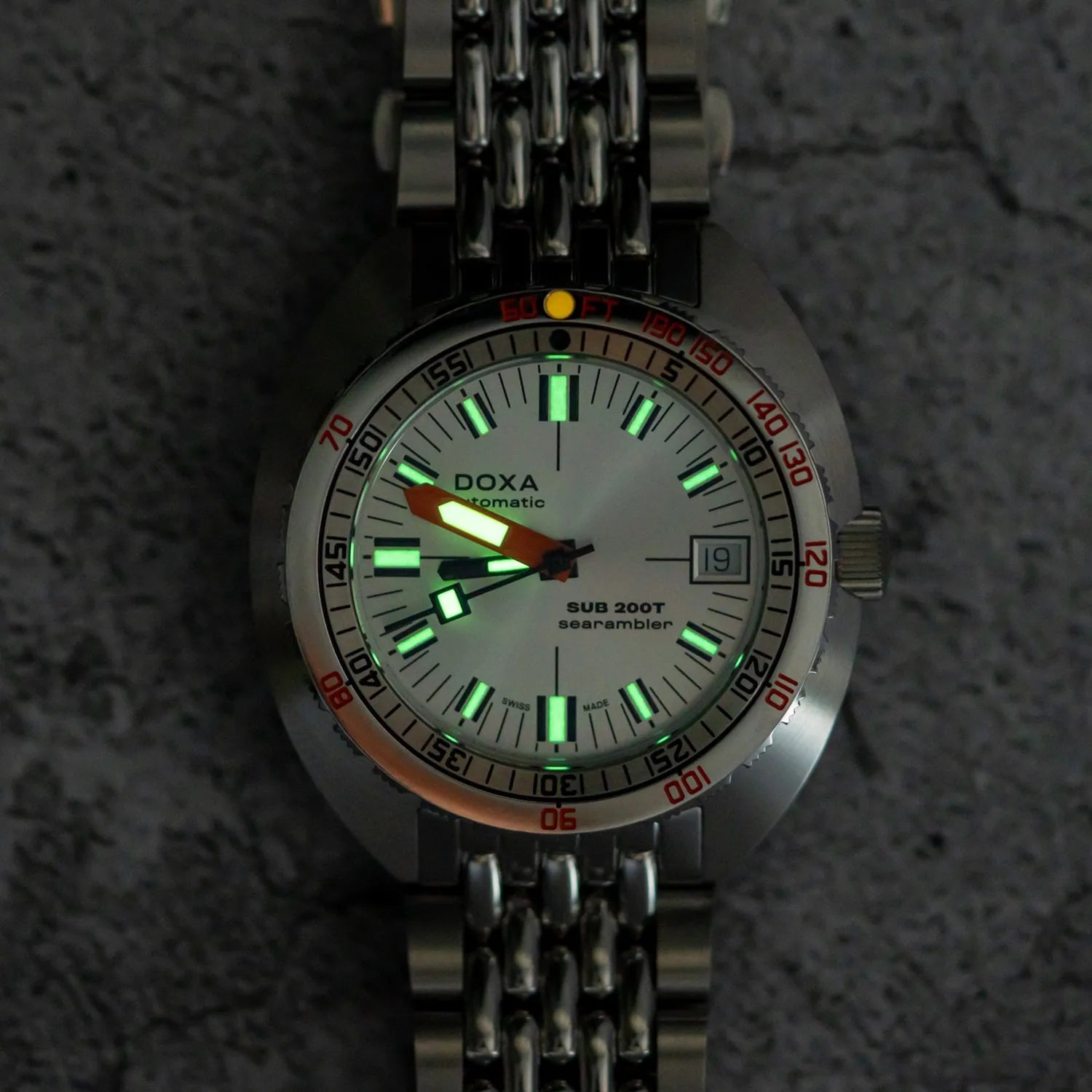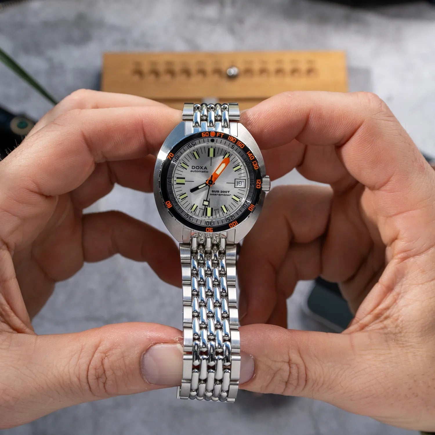 The new SUB 200T skillfully retains all of the original SUBs DNA while embracing modern style and sophistication with its smaller diameter. In reworking the spatial volumes inside the case to bring it down to an elegant 39 mm diameter and a more wearable thickness of 10.70 mm, DOXA has also tweaked the dial design to achieve a more contemporary visual presence on the wrist.