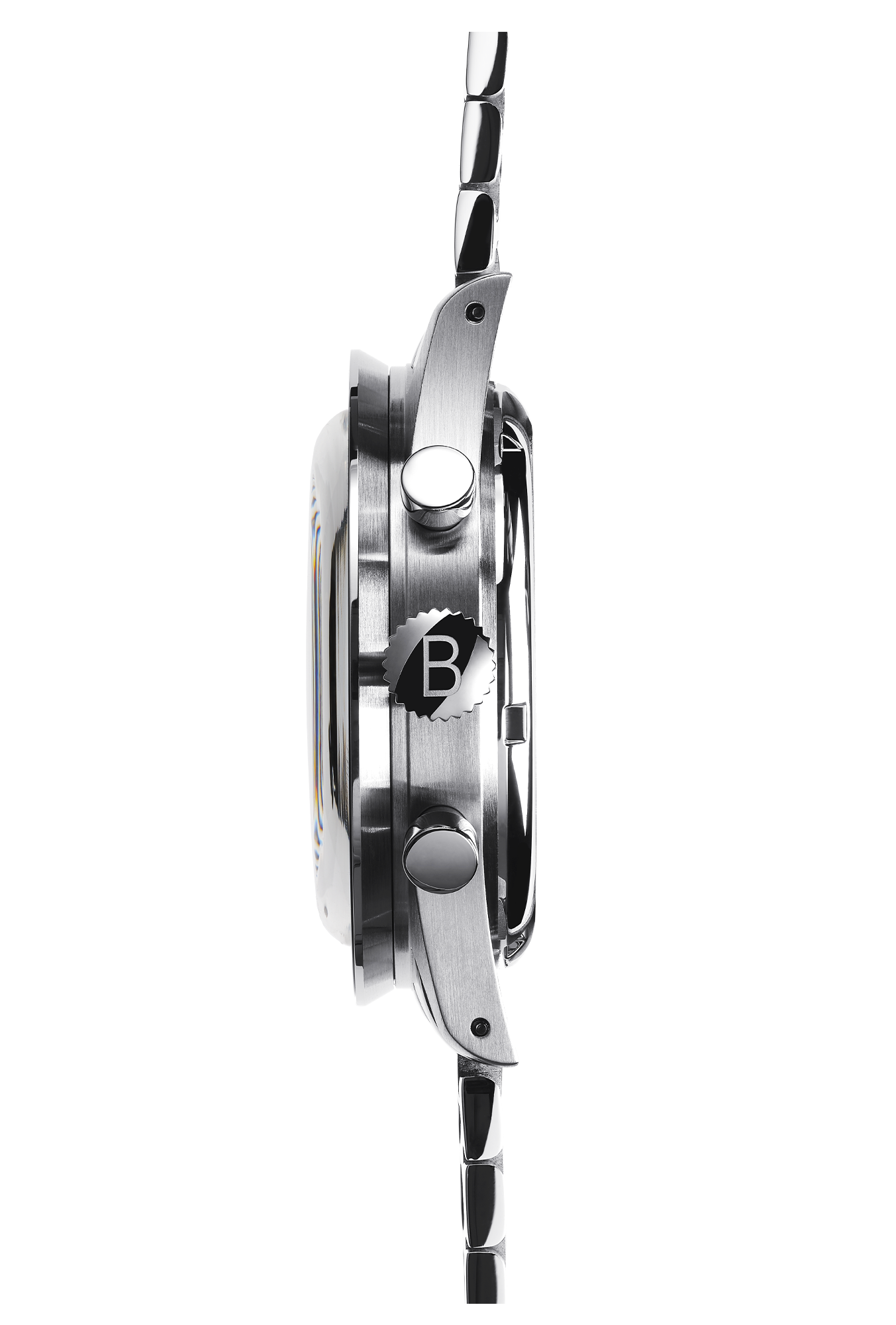 To stay in the sporty and vintage spirit of this chronograph, we chose to accompany it with a comfortable metal bracelet inspired by the 70s. This Flat link perfectly fits the curve of the wrist thanks to its fine and flexible links, while its polished and brushed finish allows to combine elegance and sportiness. Easily adjustable thanks to its many independent links and micro-adjustments, simple to attach and detach from the watch, it is the ideal accessory to accompany this chronograph.