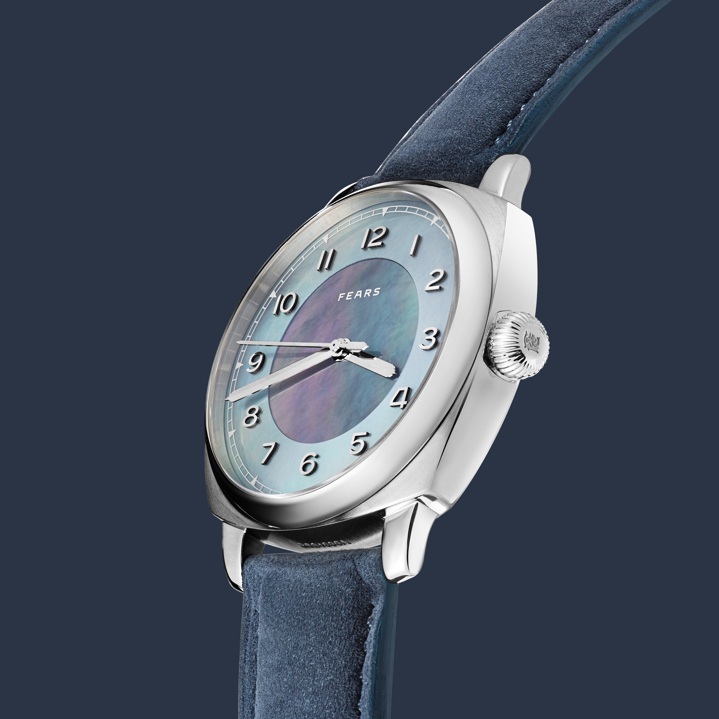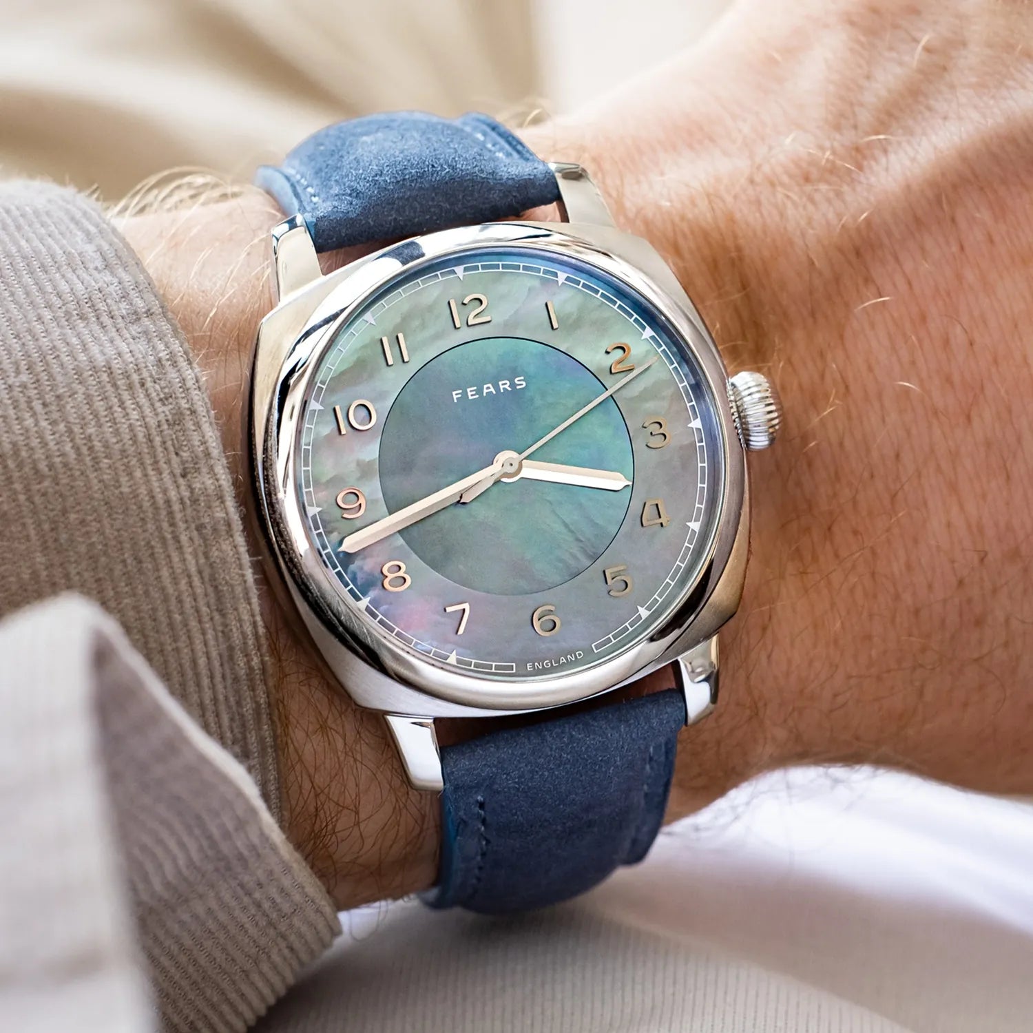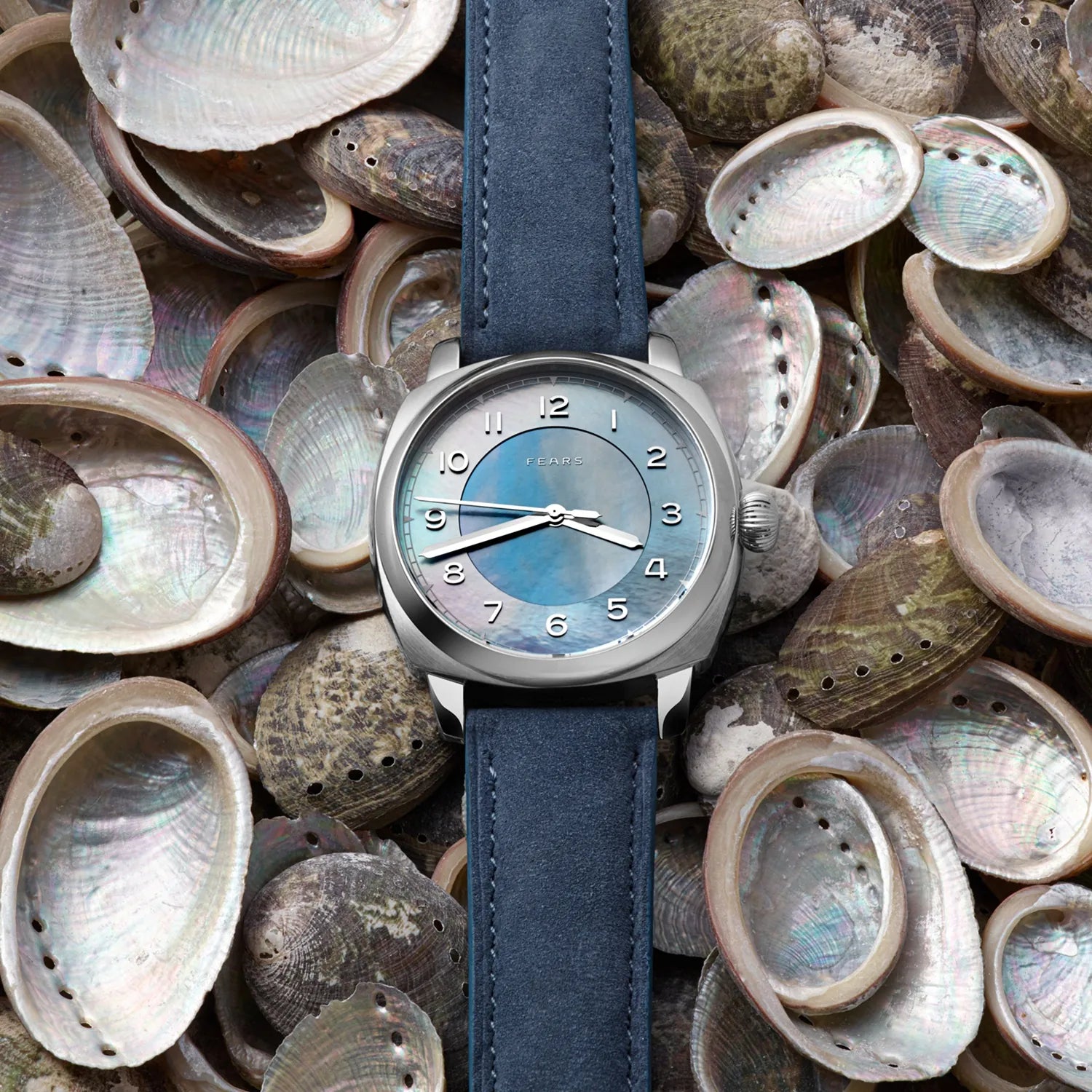 The Brunswick 'Aurora' features a unique mother-of-pearl dial made from Pinctada Maxima oyster shells, hand-tinted for a distinctive blue hue. The dial is meticulously crafted in Germany, with hand-applied numerals milled from brass and coated in rhodium, using Fears' custom ‘Edwin’ typeface.