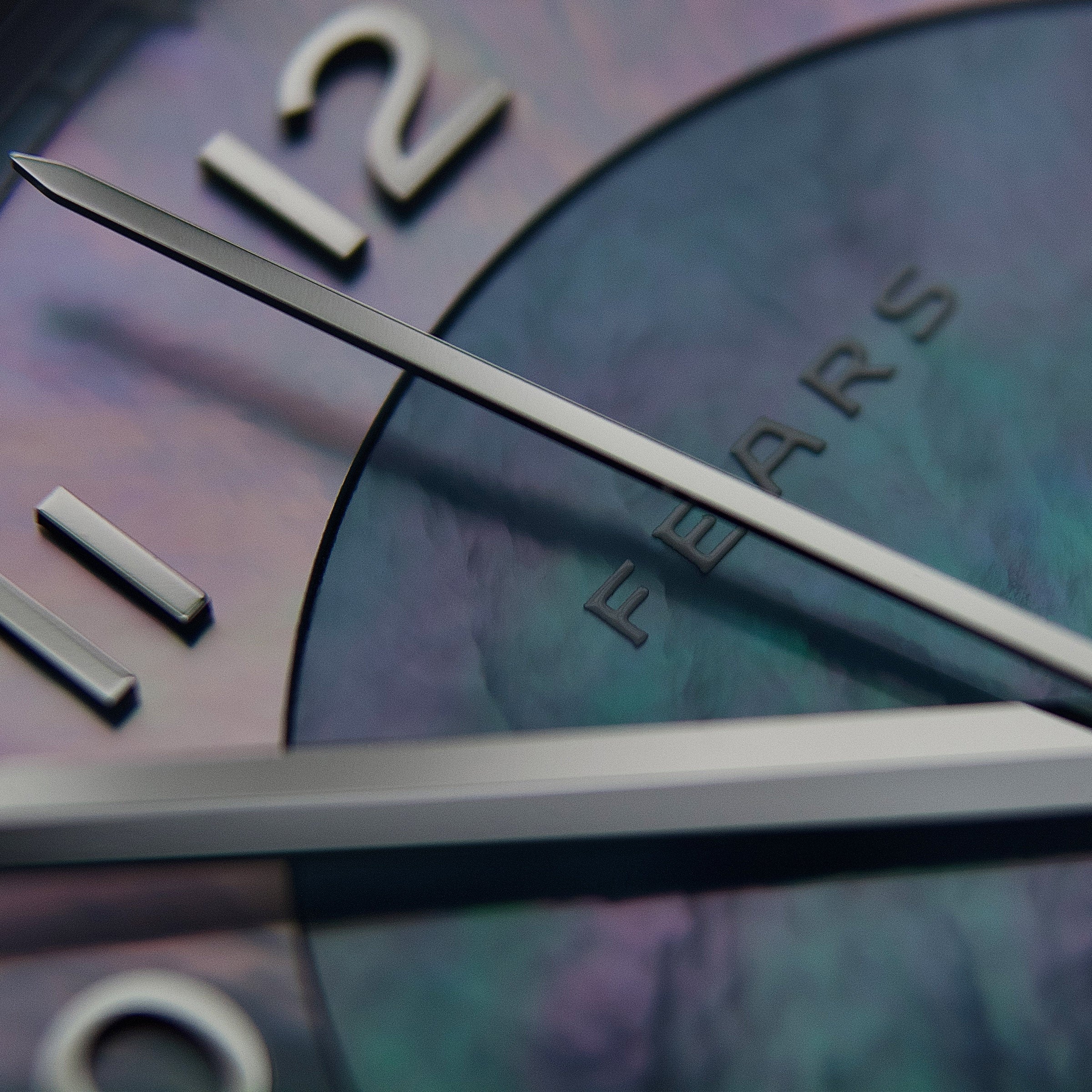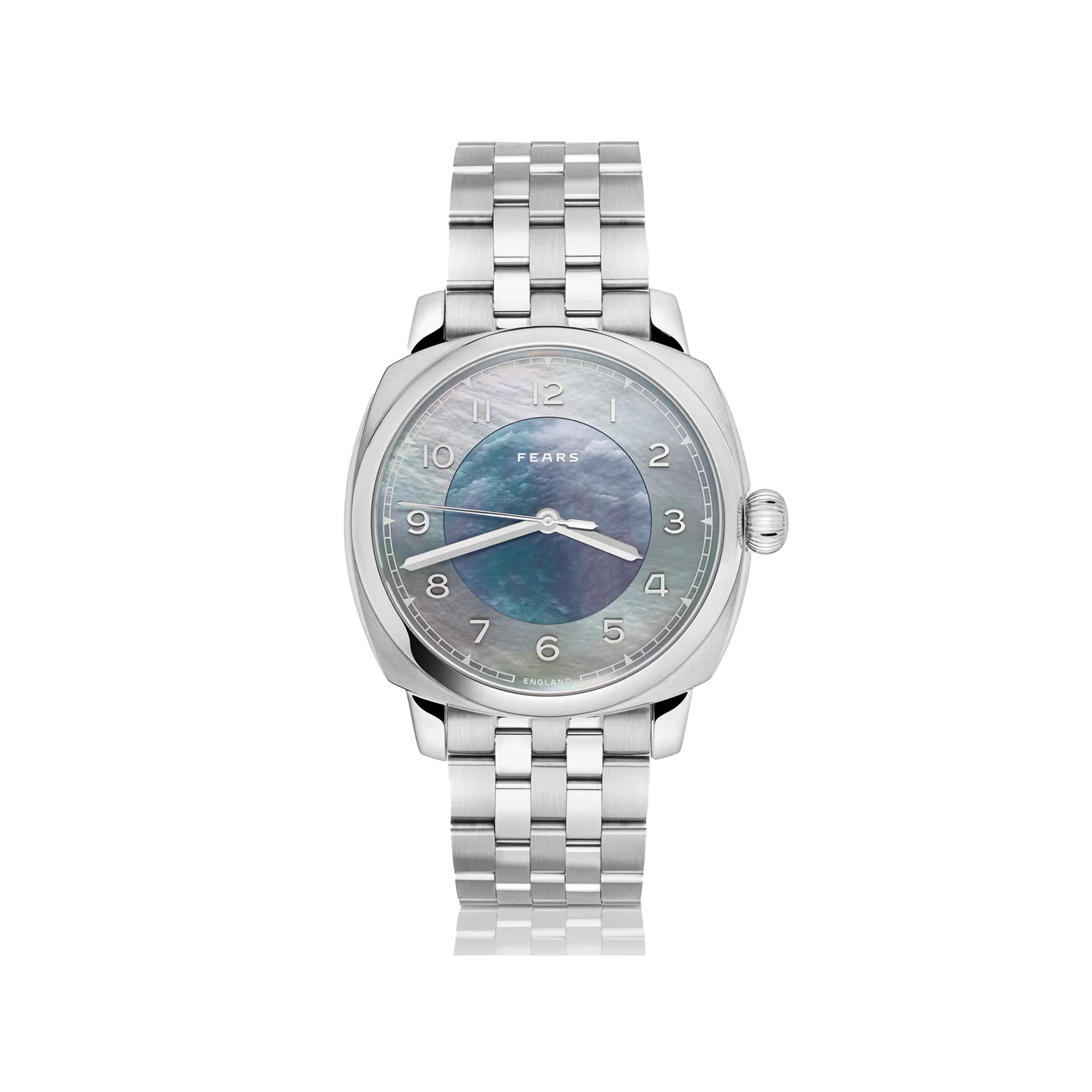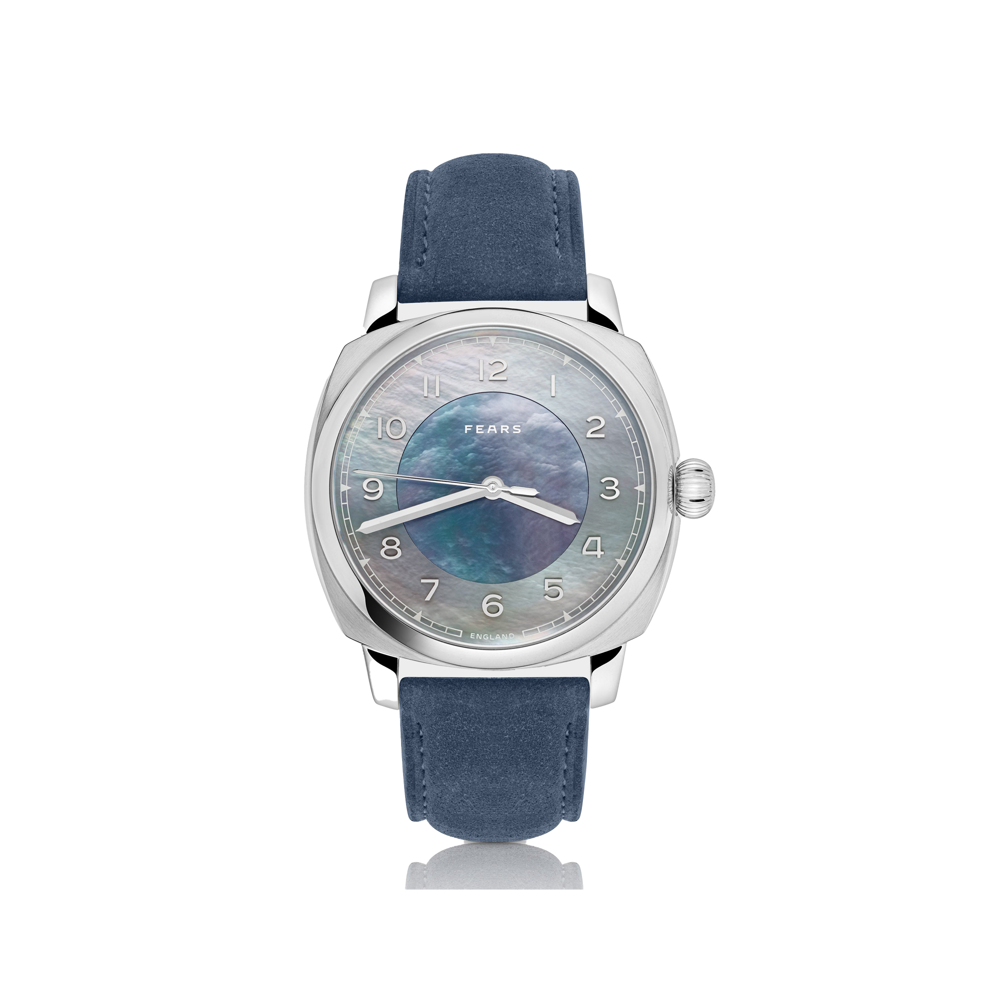 The Brunswick 'Aurora' features a unique mother-of-pearl dial made from Pinctada Maxima oyster shells, hand-tinted for a distinctive blue hue. The dial is meticulously crafted in Germany, with hand-applied numerals milled from brass and coated in rhodium, using Fears' custom ‘Edwin’ typeface.