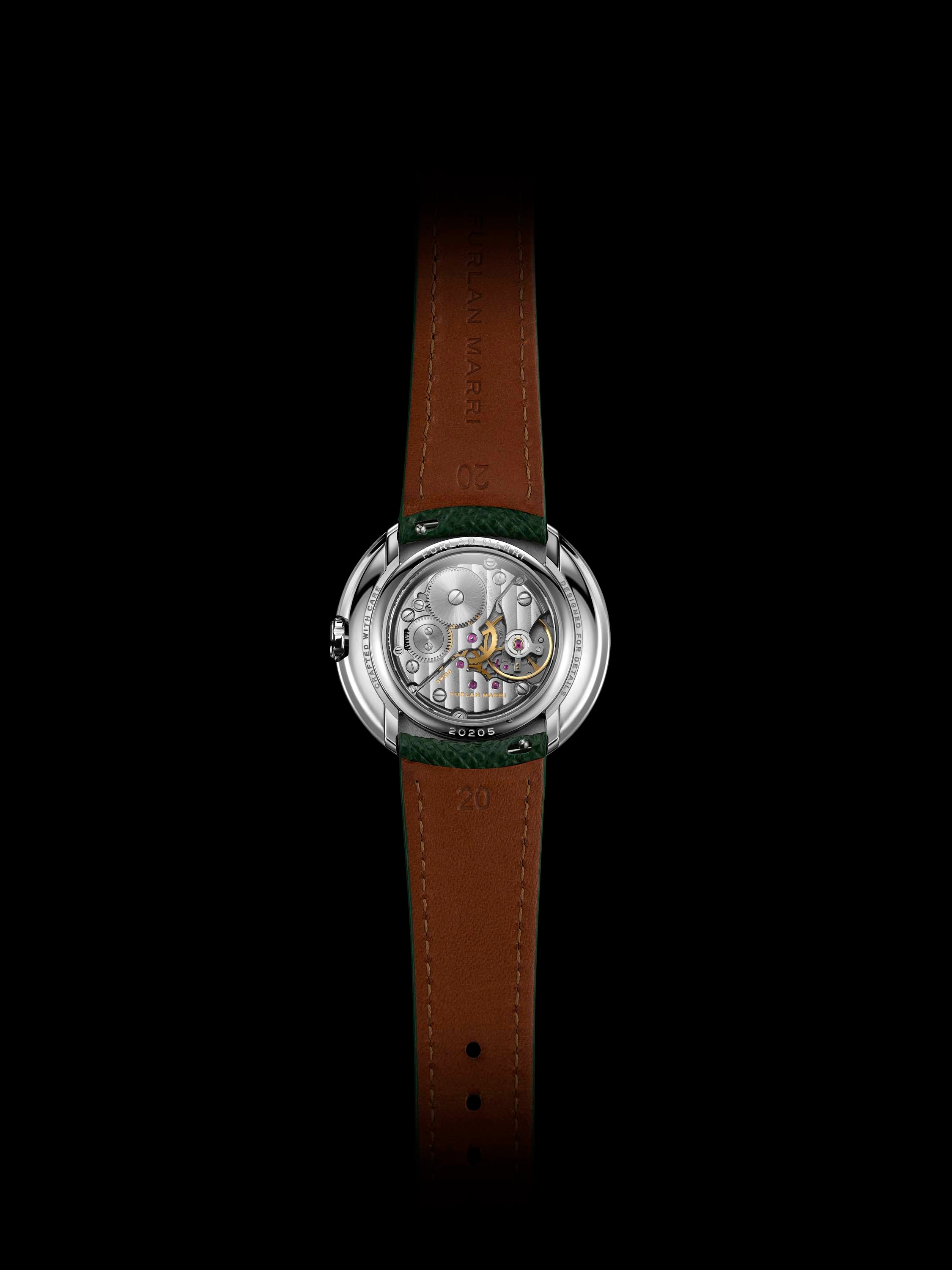 watchmakers’ desire to produce a watch as thin as the first release. Thus, the movement fits perfectly into the new 38 mm diameter case. This manually wound watch revives the Art Deco style, featuring design codes from the 1930s to 1950s but with an intermediate diameter. Meanwhile, Furlan Marri has meticulously redesigned the bridges, incorporating hand-finished, diamond-polished edges and a crown wheel and screws that are black-polished and chamfered around the stones. All the beveling is done by hand in Geneva (Meyrin, Switzerland) under the watchful eye of Furlan Marri technical manager Sébastien Rousseau.
