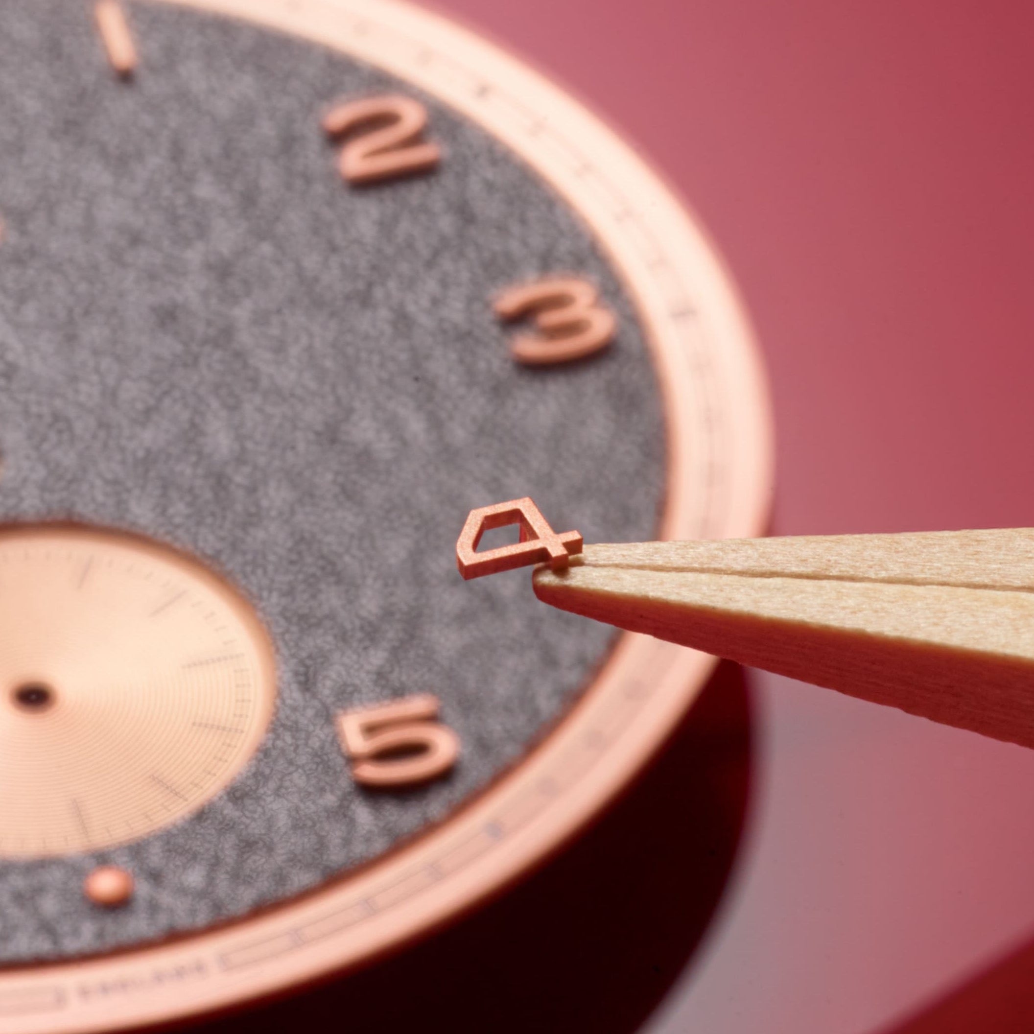 The hour and minute hands feature a lightly frosted finish before receiving 18ct rose gold coating to match the polished 3D numerals. The seconds hand is coated in contrasting black varnish.