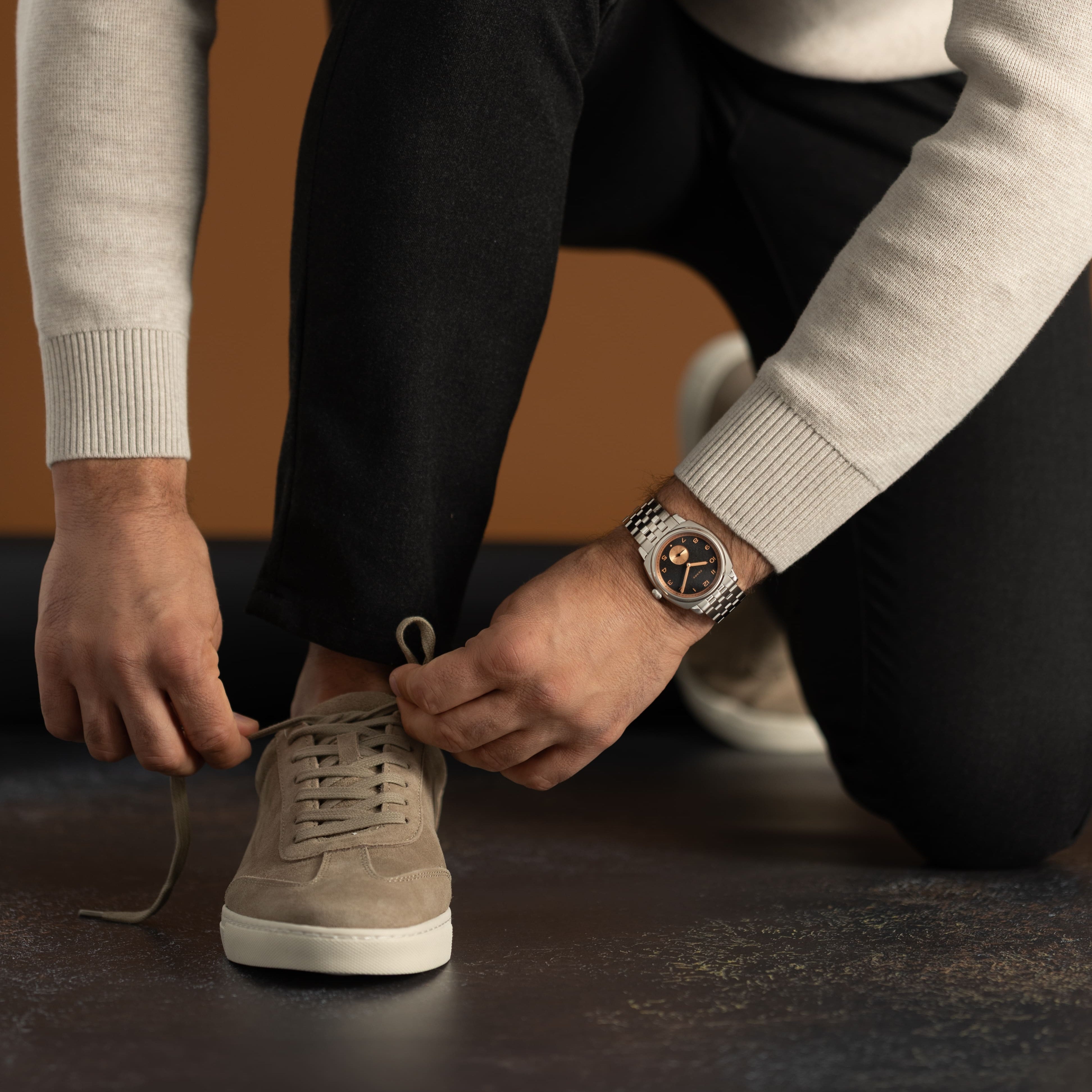 The Brunswick 38 'Charcoal Rose' reimagines classic elegance with a contemporary multi-tonal dial that draws inspiration from the subtle hues found throughout the Fears Archive. Its granular textured charcoal base provides a sophisticated backdrop for accents of 18ct rose gold, a first in the modern Fears era.