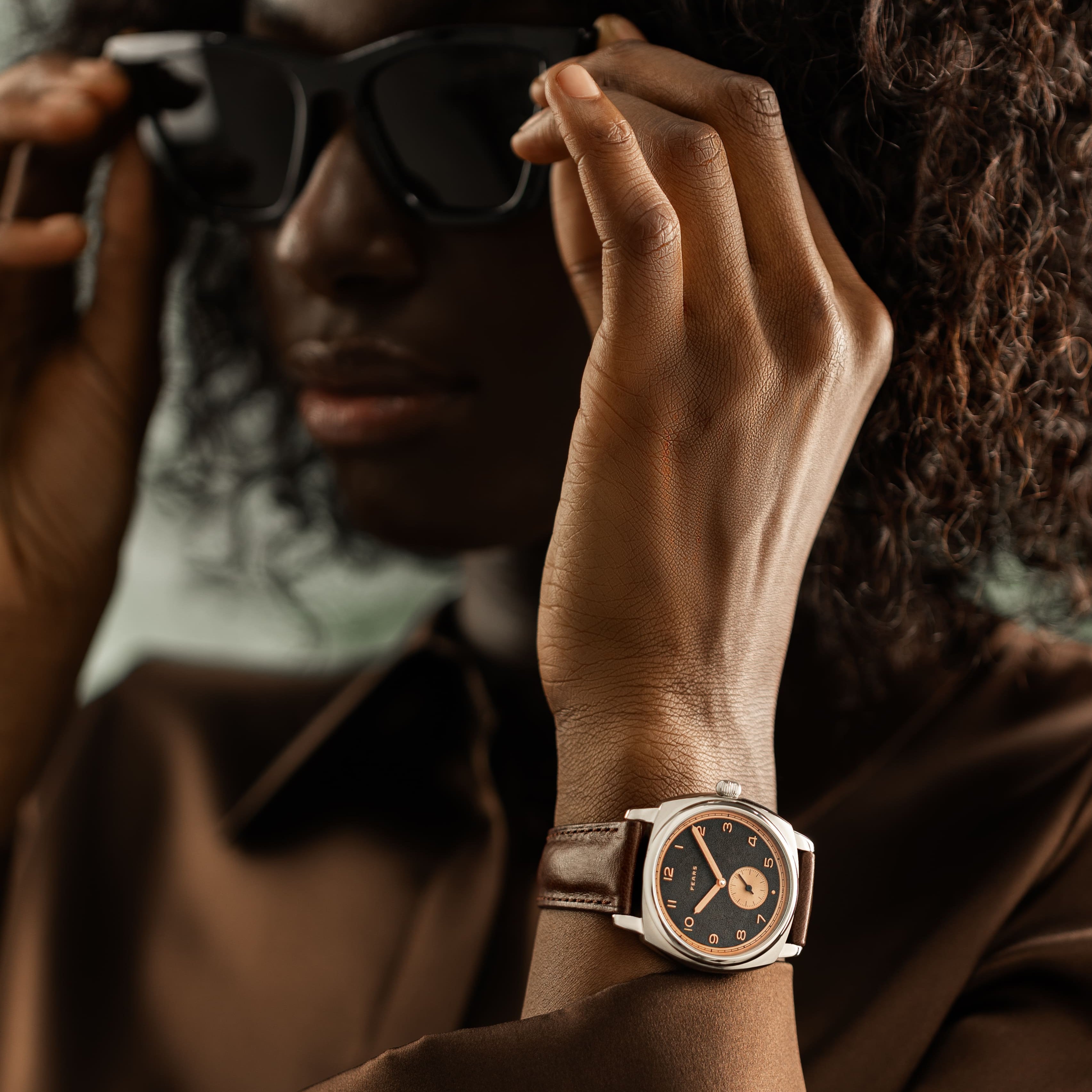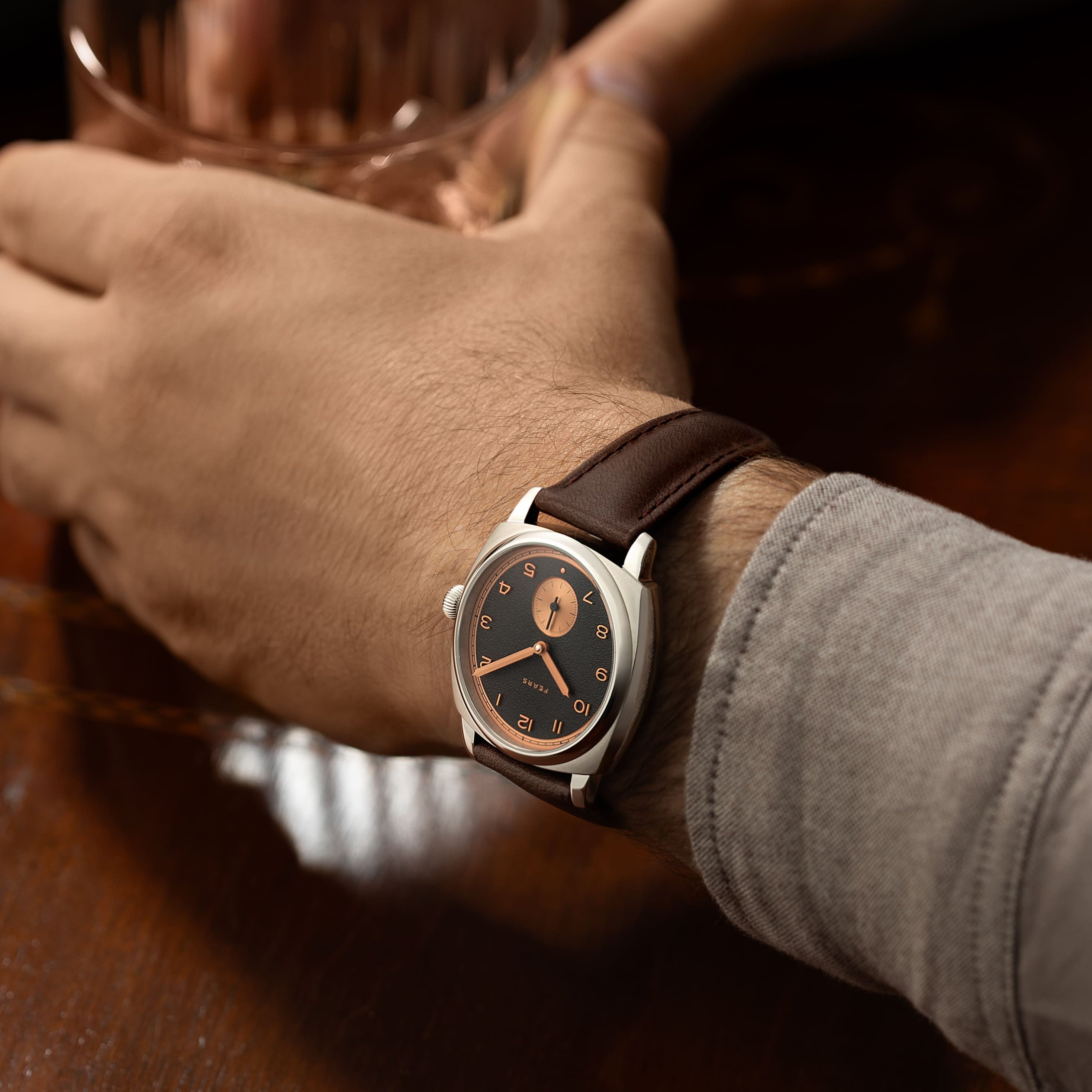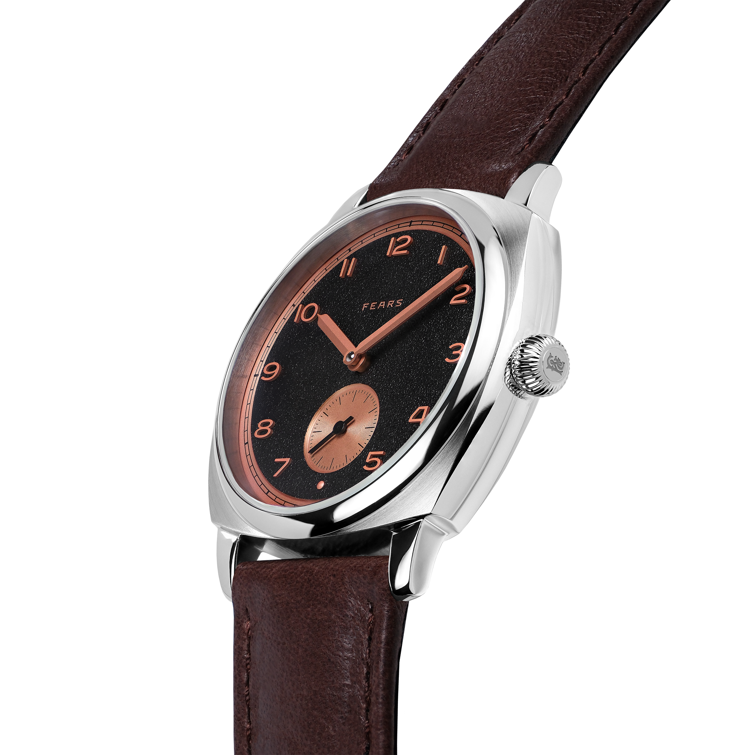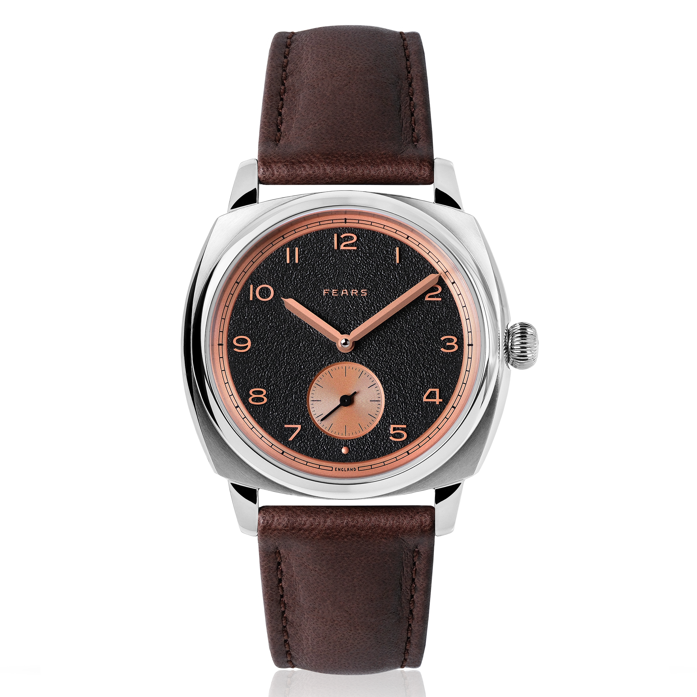 A contemporary expression of Fears’ iconic cushion-shaped silhouette, the Brunswick 38 ‘Charcoal Rose’ re-imagines classic elegance with a multi-tonal dial drawing inspiration from the gentle hues regularly seen in vintage Fears pieces.