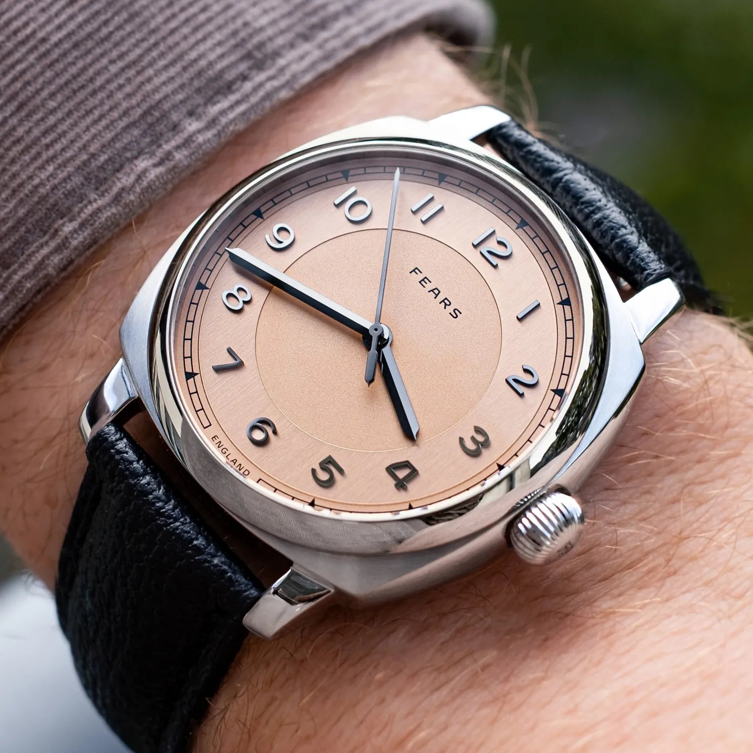 The distinctive ‘Fears’-shaped hands, milled from solid brass and coated in black gold, ensure excellent legibility. The watch is powered by a Swiss-made ETA 2824-2 automatic movement, modified in Britain for precision.