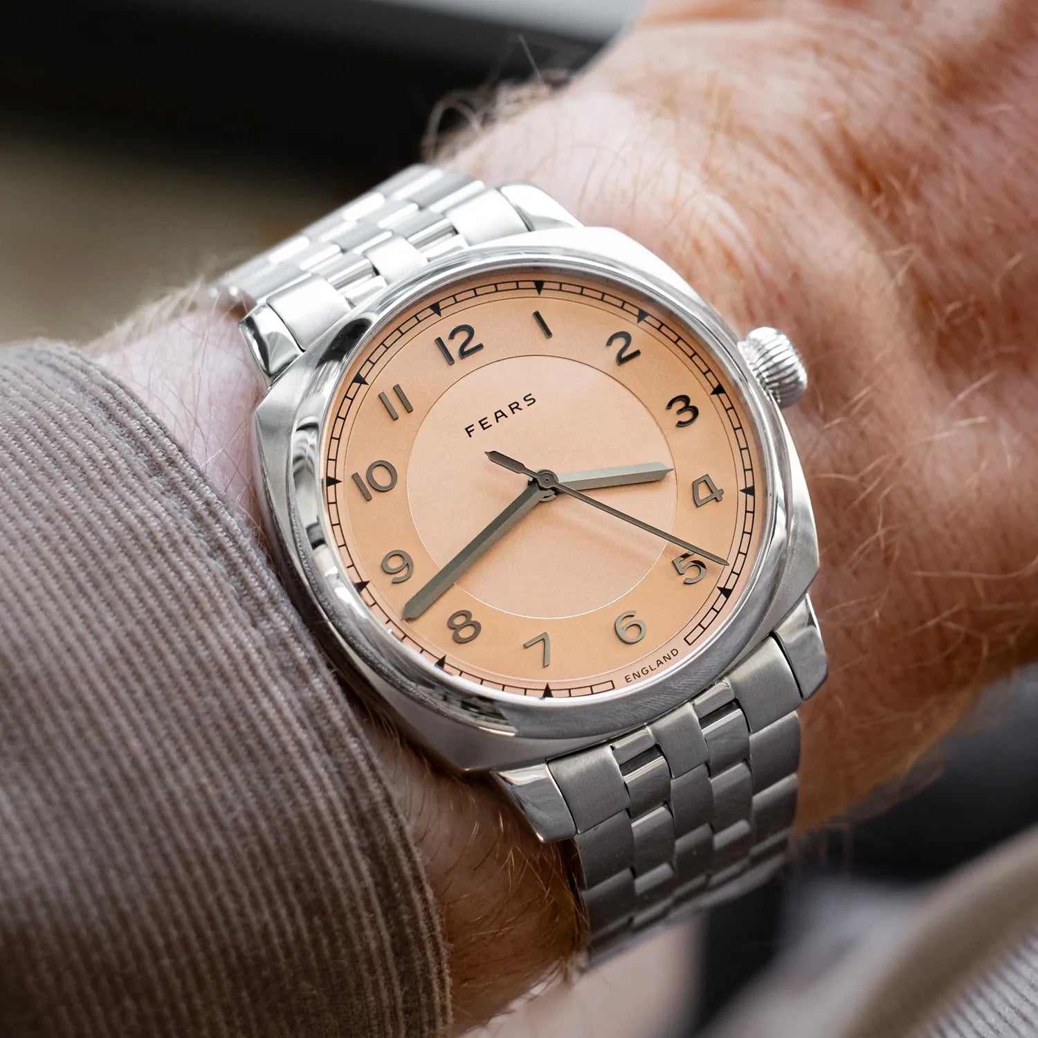 The Salmon dial, expertly crafted in Germany, features a two-level design with a fine sandblasted lower section and a hand-brushed outer section. The hand-applied numerals, crafted from brass and coated in black gold, are realised in the custom ‘Edwin’ typeface, adding a sophisticated touch.