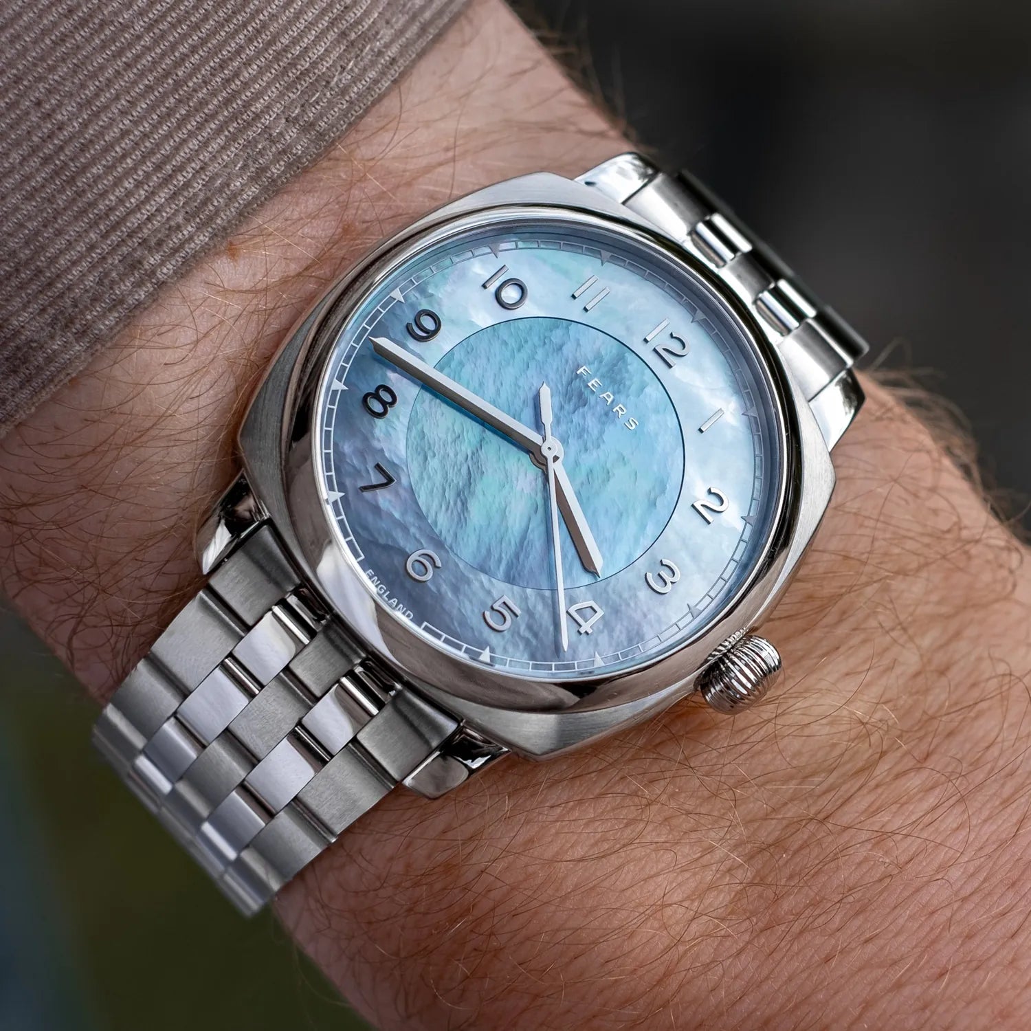 The Brunswick 'Aurora' features a unique mother-of-pearl dial made from Pinctada Maxima oyster shells, hand-tinted for a distinctive blue hue. The dial is meticulously crafted in Germany, with hand-applied numerals milled from brass and coated in rhodium, using Fears' custom ‘Edwin’ typeface.