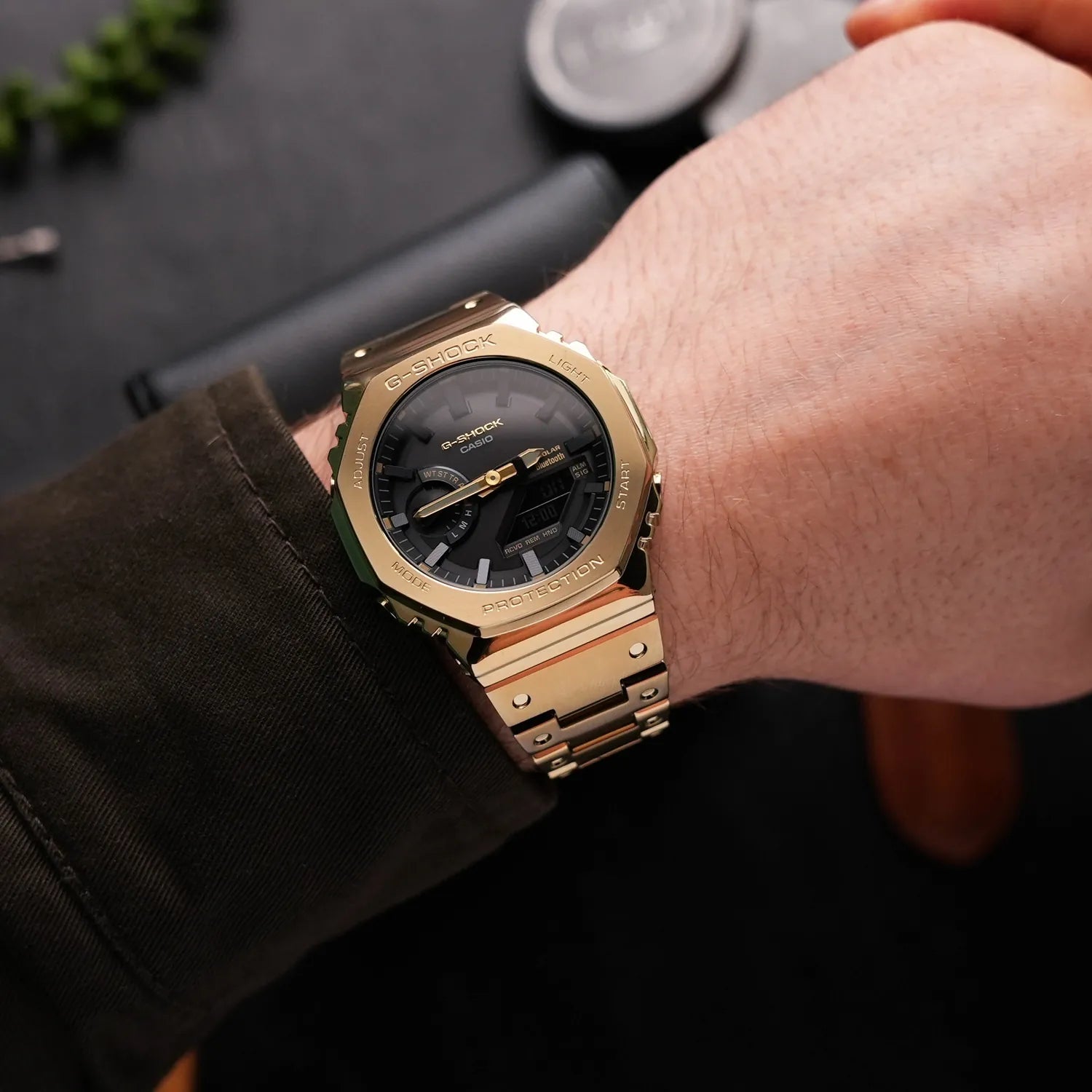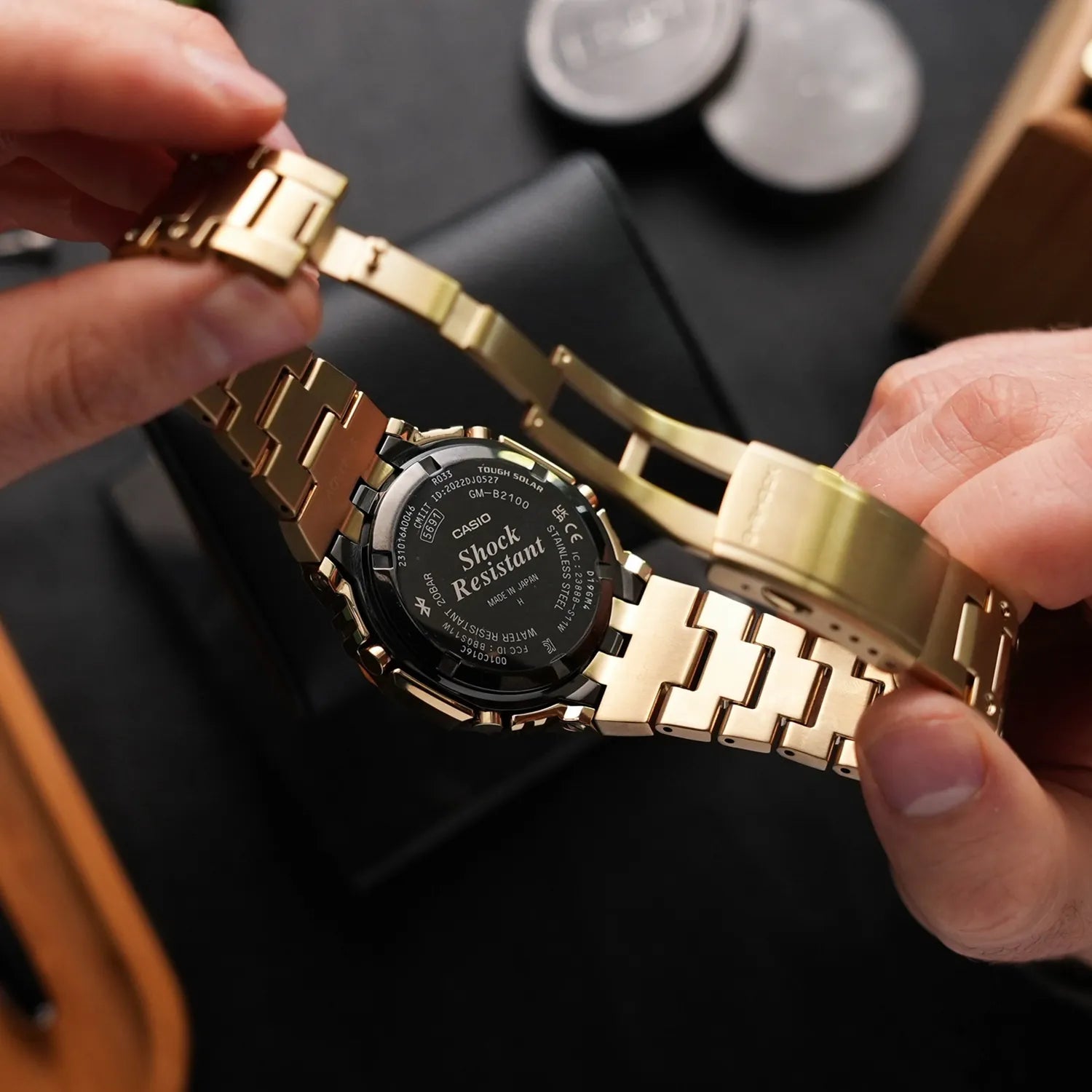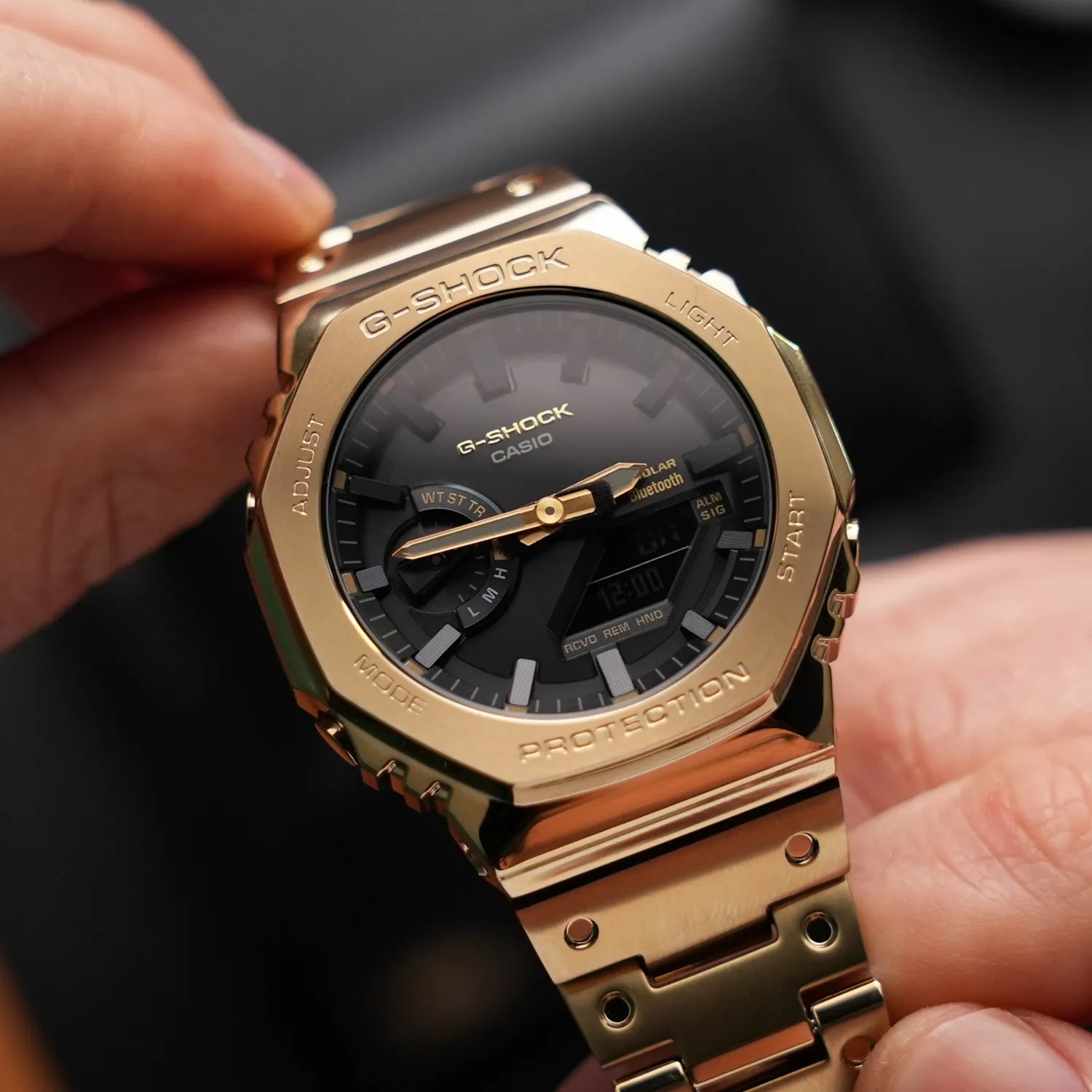 G-Shock take it way back with the octagonal bezel and dimpled band design of the original from 1983, all done in metal. The bezel and band are coated with yellow gold ion plating. The stainless steel bezel - formed three-dimensionally through a time-consuming forging, cutting, and polishing process - is finished beautifully with a circular hairline treatment on the top surface and mirror polish on the slopes. Pairs with a smartphone via Bluetooth®. Simply tap into the dedicated app for precision timekeeping that keeps you on track. With Tough Solar, a high-brightness LED light and a range of other convenient functions, this is a timepiece that delivers on style and practical utility.