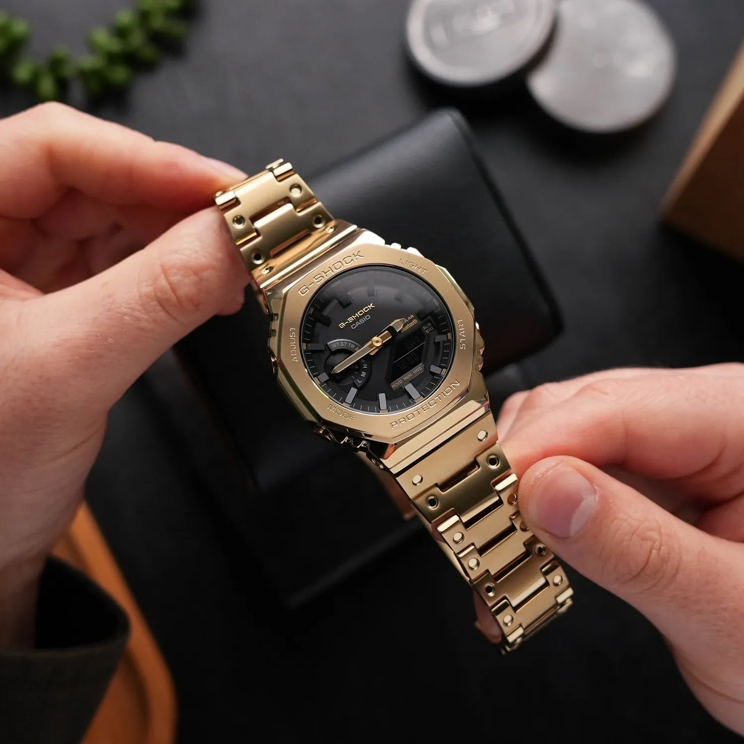 Introducing the full-metal addition to the continually evolving 2100 line of timepieces that inherit the legacy of the first-ever G-SHOCK, the DW-5000C. Luxe full-metal construction with a screw-back case, bezel, and band crafted in stainless steel creates a streamlined, minimalist design, while protecting the module from impact when dropped. High-density mounting keeps the analogue-digital combination module slim, while still providing the advanced functions you love in a compact profile and comfortable fit.