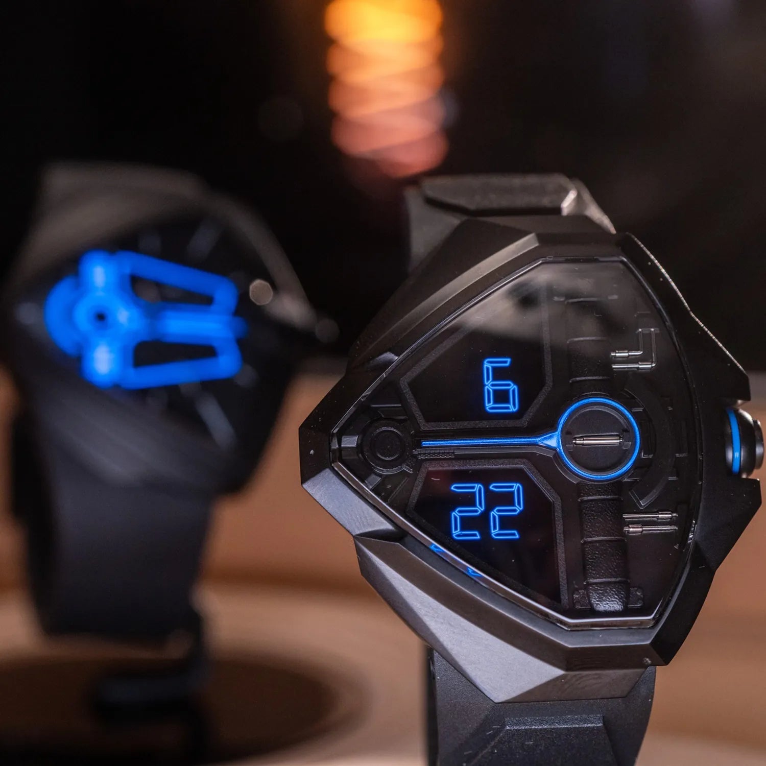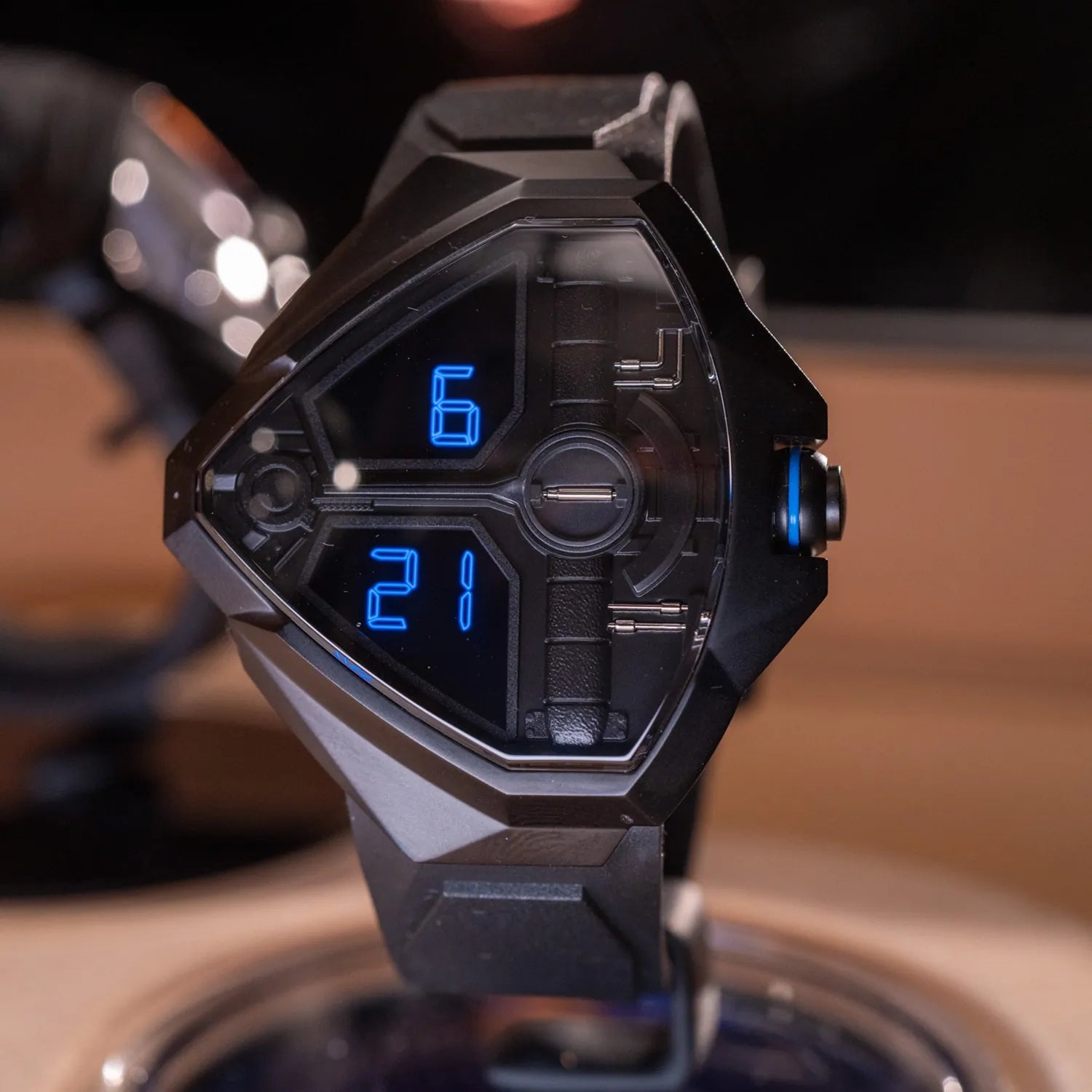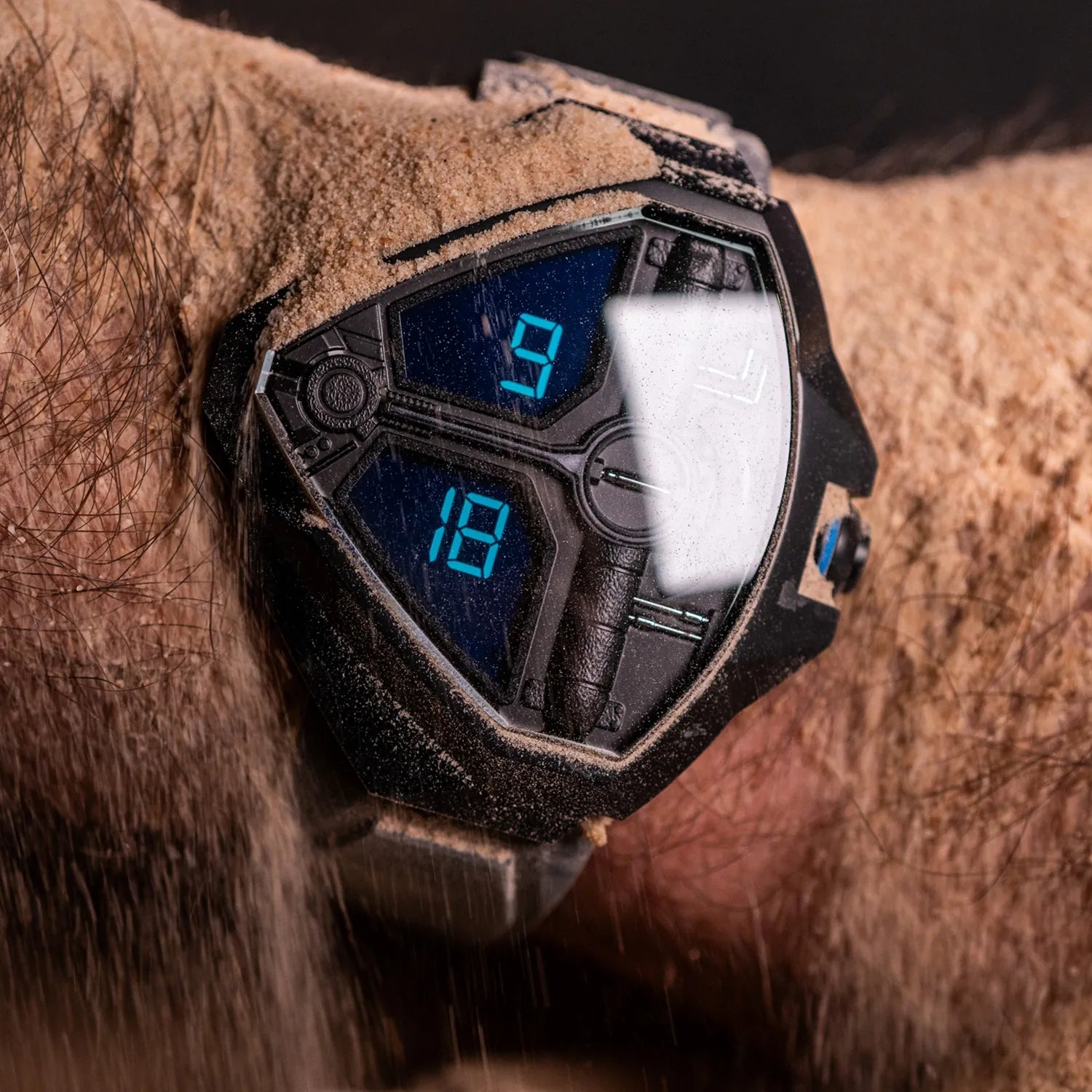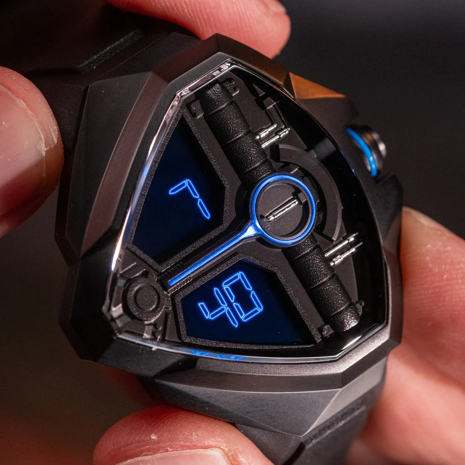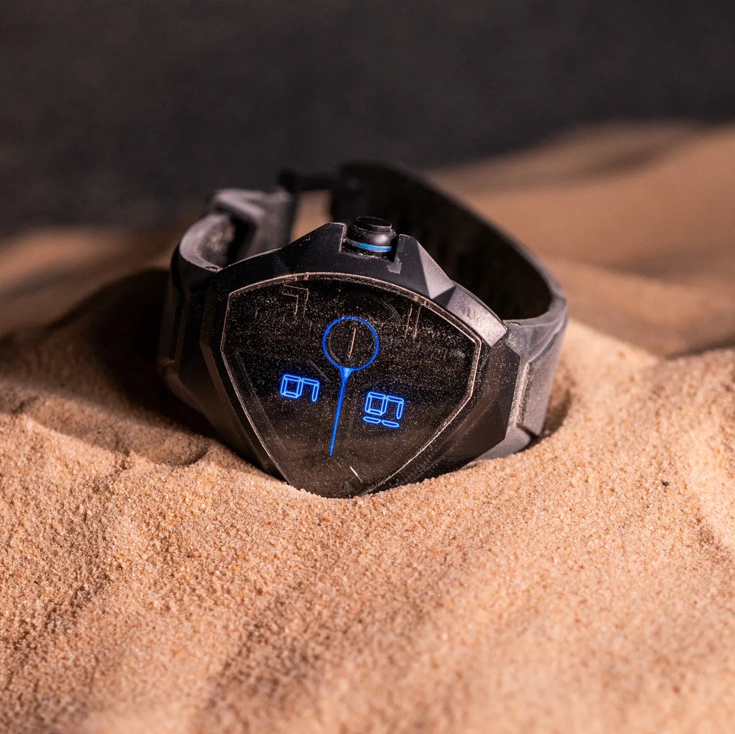 The stainless steel case is coated in Black PVD which compliments the luminescing blue display which is activated by the crown. Affixed to the case is a 23mm black rubber strap.