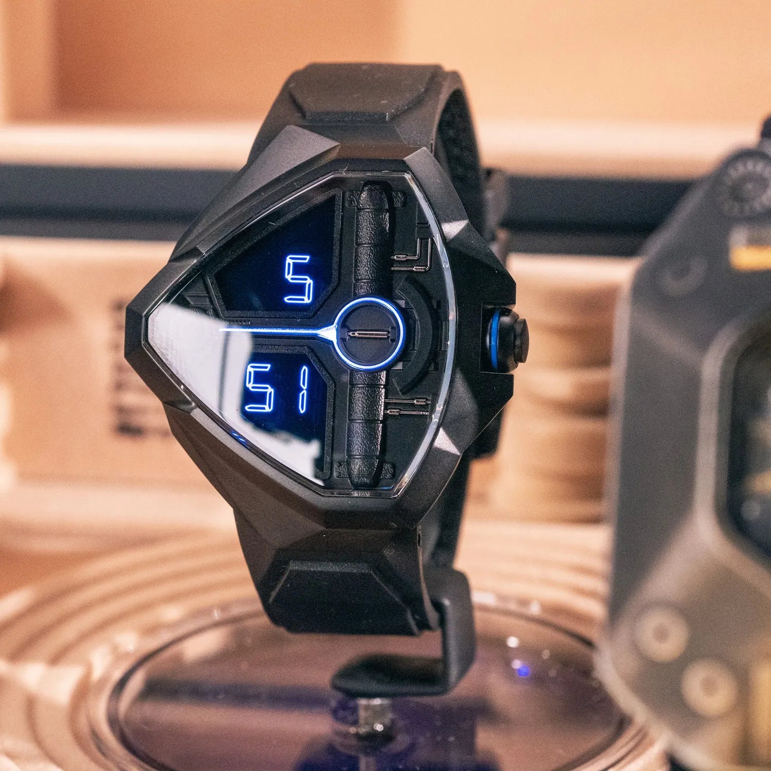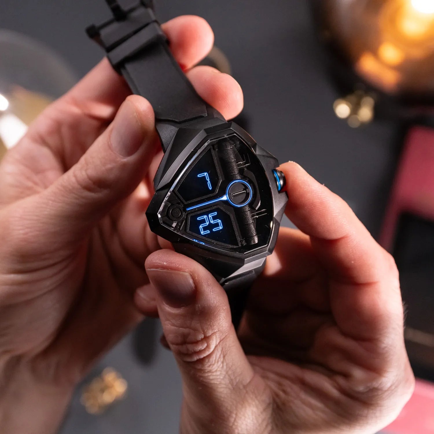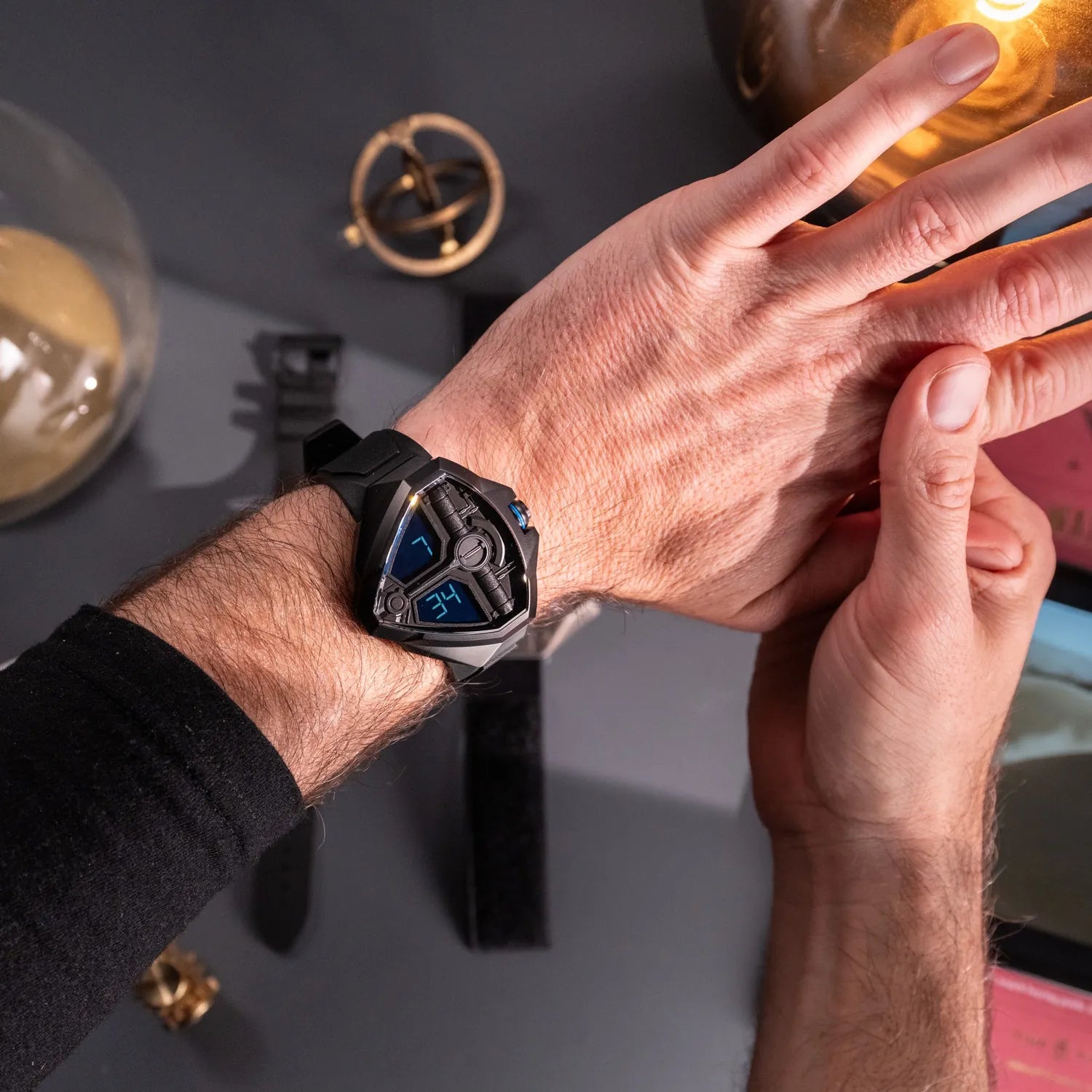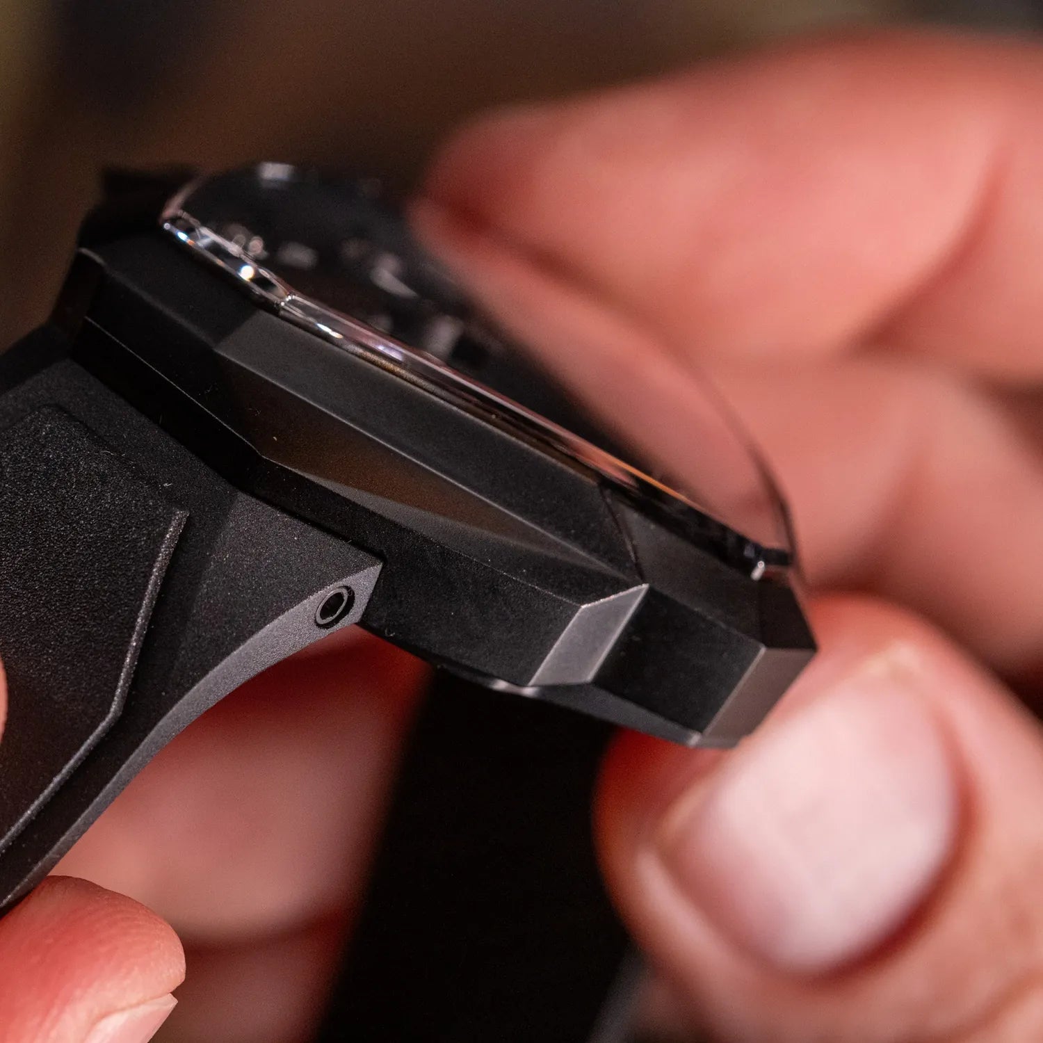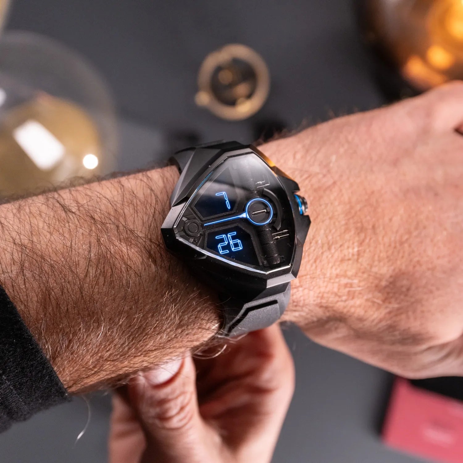 The stainless steel case is coated in Black PVD which compliments the luminescing blue display which is activated by the crown. Affixed to the case is a 23mm black rubber strap.