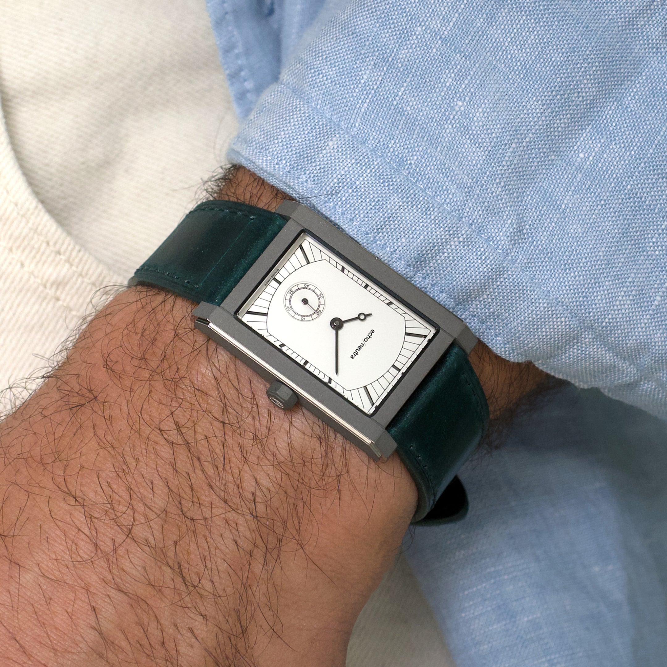 An Art Deco-inspired dial with applied indices reflects light beautifully, housed in a titanium case with sharp, bold lines and polished accents for a refined touch.