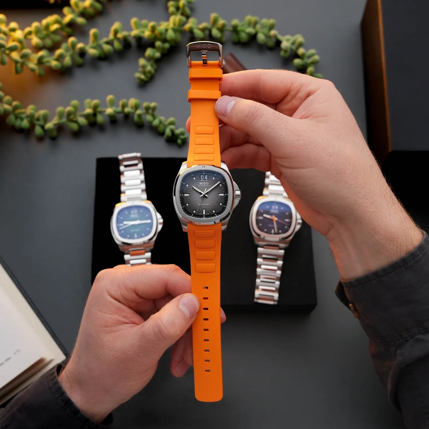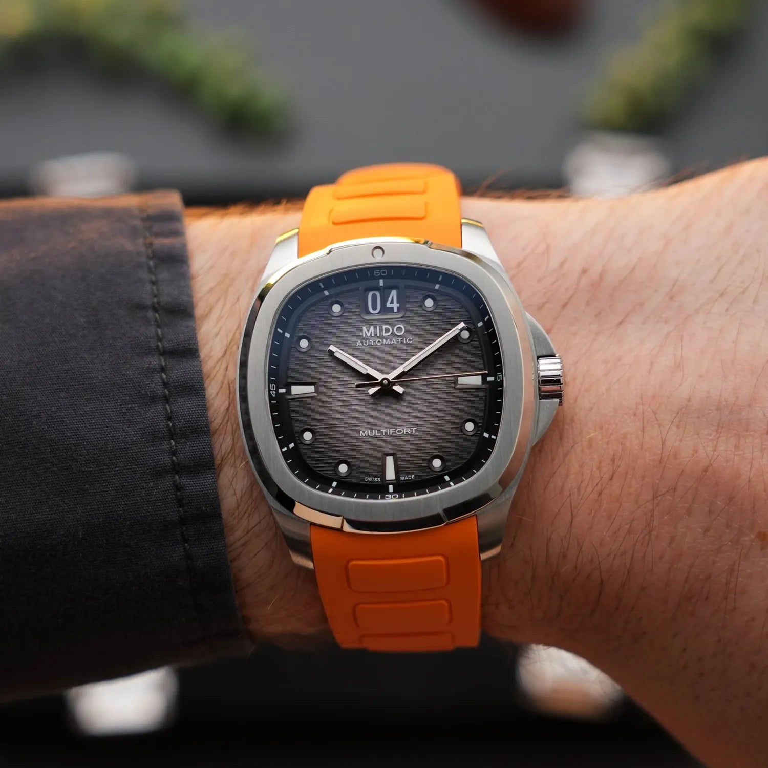 In a revival of a cult classic shape, created 50 years ago by Mido, the TV-shaped case makes a long-awaited comeback, this time honouring the Multifort collection. Its dynamic and modern design is emphasized by a stunning light-reflecting dial - which reveals a captivating dégradé effect that fades from grey to black - featuring a pronounced horizontal brushed finish, along with its distinctive function: the BIG DATE at 12 o'clock. Behind its TV screen, the ever-reliable Calibre 80 marks the time with precision.