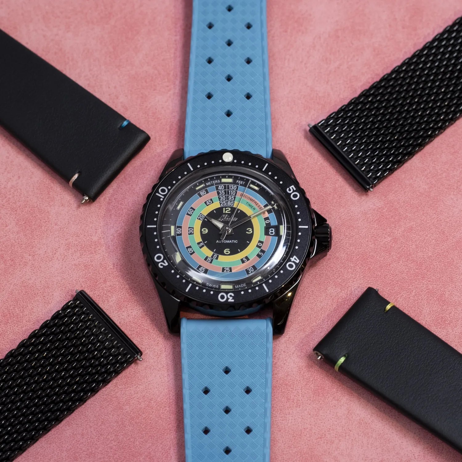 The watch comes with three interchangeable straps: shiny black Milanese mesh steel, leather, and rubber, each providing a distinct look.