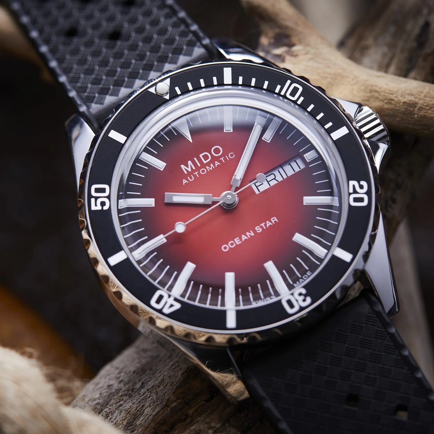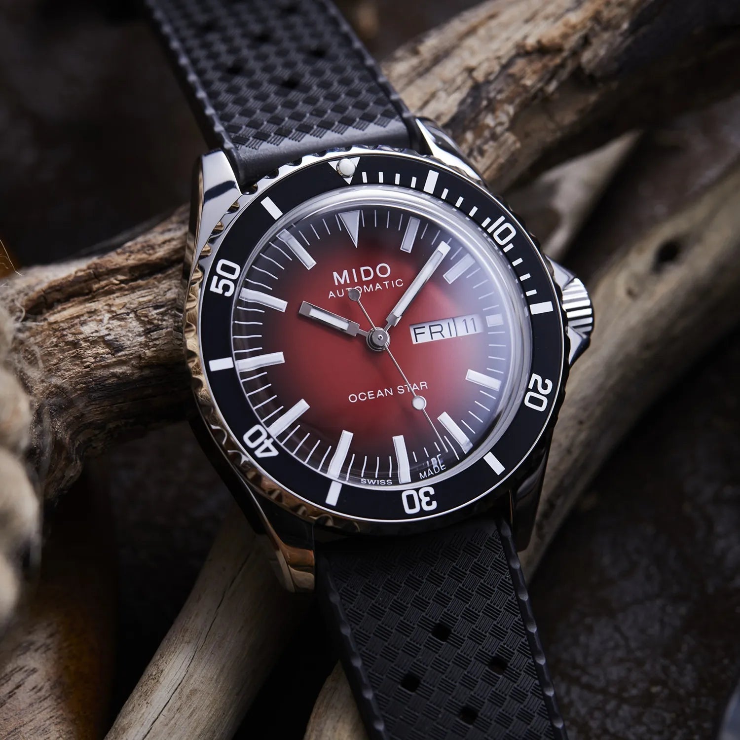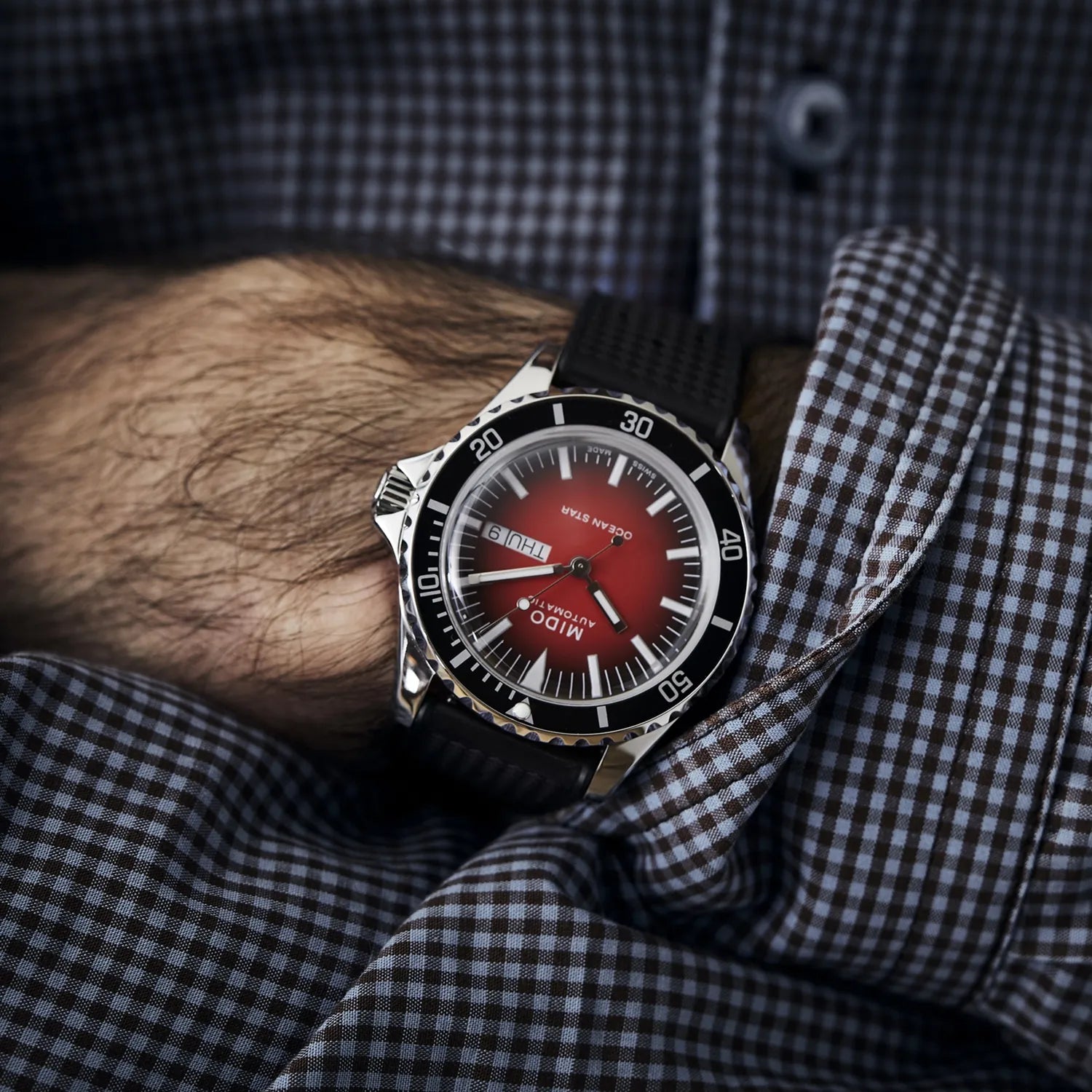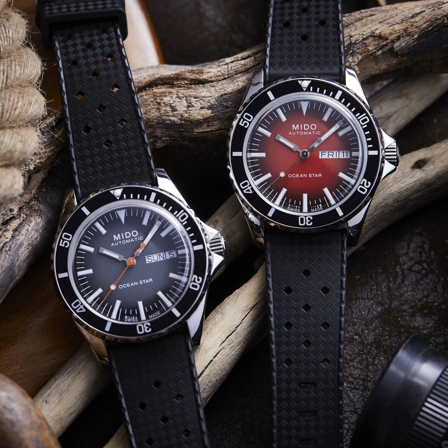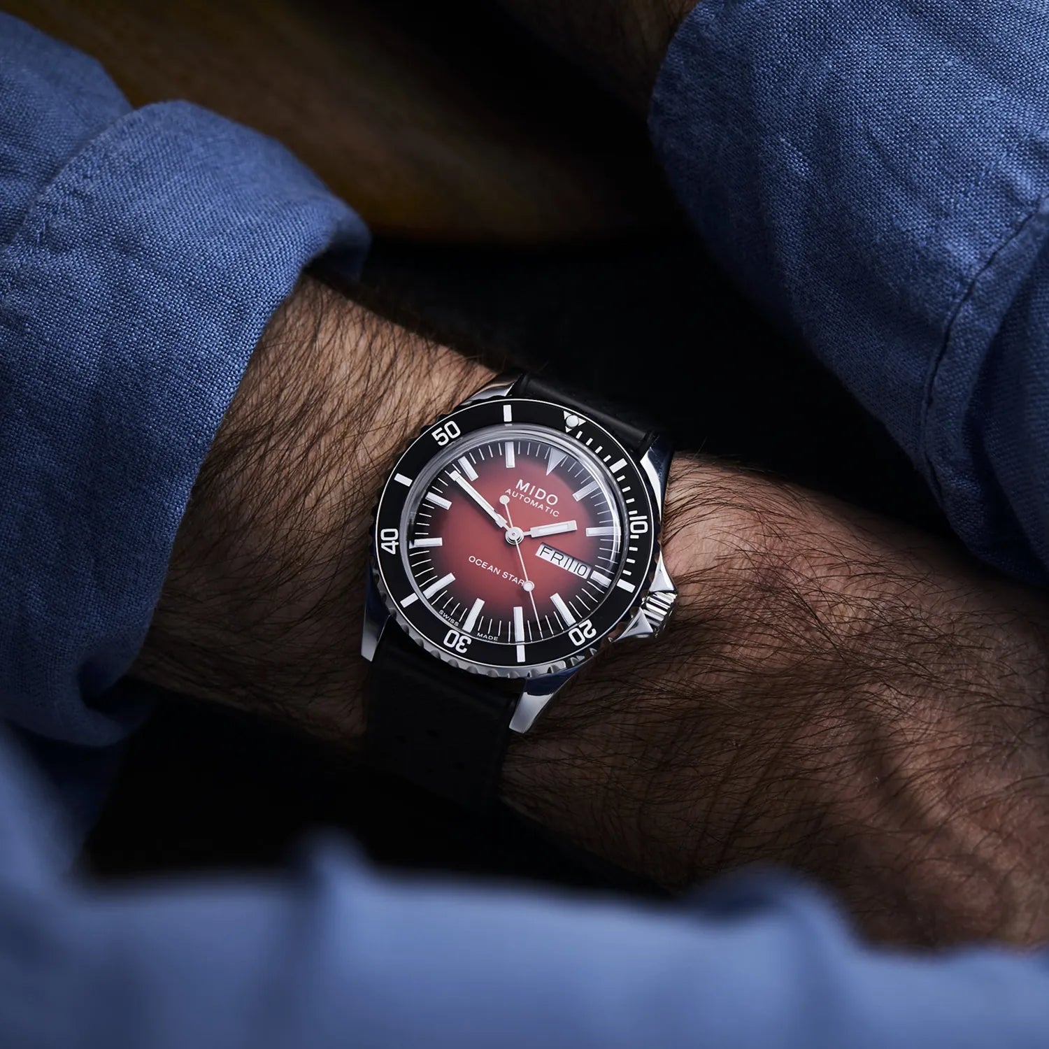 Mido pays tribute to the Ocean Star collection. In subtle reference to the past, the Ocean Star Tribute Swiss watch reinterprets the aesthetic codes of the diving models from the 1960s. It is fitted with the Caliber 80 automatic movement with up to 80 hours of power reserve, is water-resistant up to a pressure of 20 bar (200 m/656 ft) and features a unique strap offering maximum comfort.