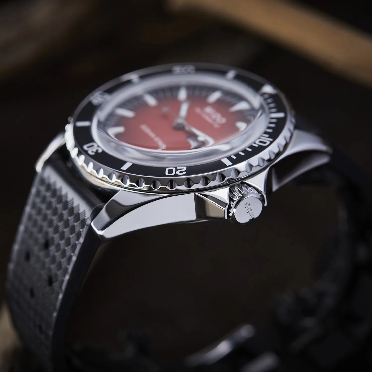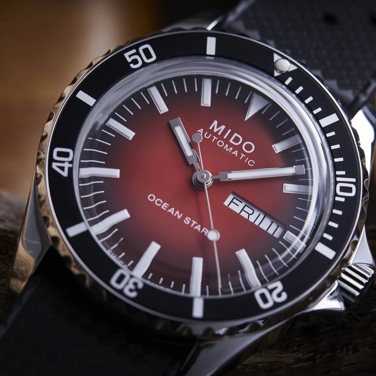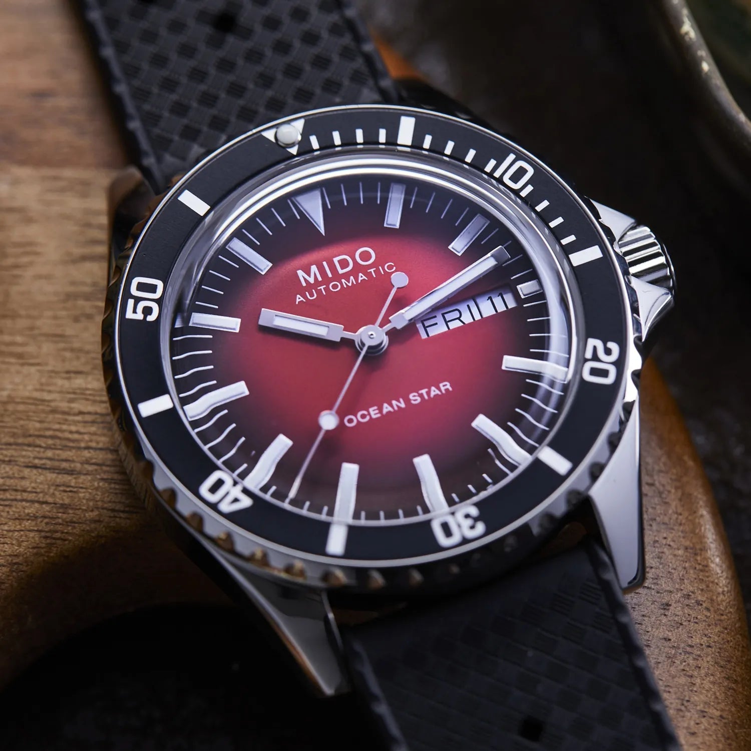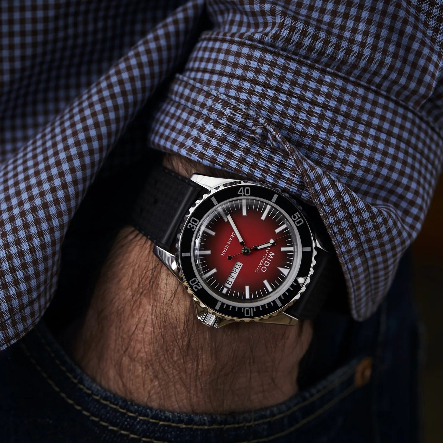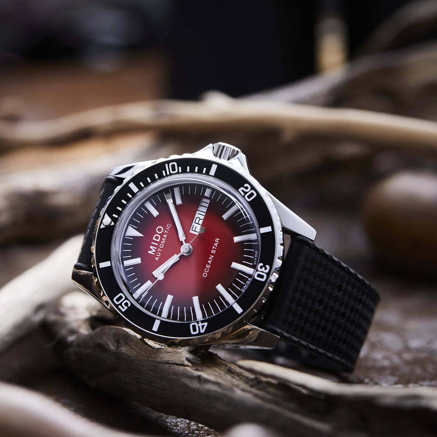 Mido pays tribute to the Ocean Star collection. In subtle reference to the past, the Ocean Star Tribute Swiss watch reinterprets the aesthetic codes of the diving models from the 1960s. It is fitted with the Caliber 80 automatic movement with up to 80 hours of power reserve, is water-resistant up to a pressure of 20 bar (200 m/656 ft) and features a unique strap offering maximum comfort.
