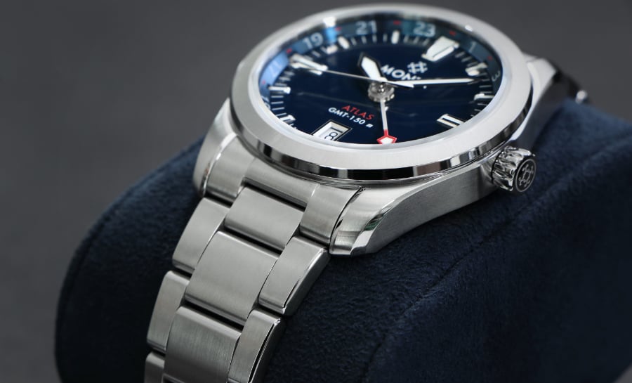 The Atlas Collection is powered by a Swiss automatic GMT movement that delivers accurate timing across time zones. Detailed with an arrow-tip GMT hand and a 24-hour scale, it’s designed to keep your schedule perfectly aligned.
