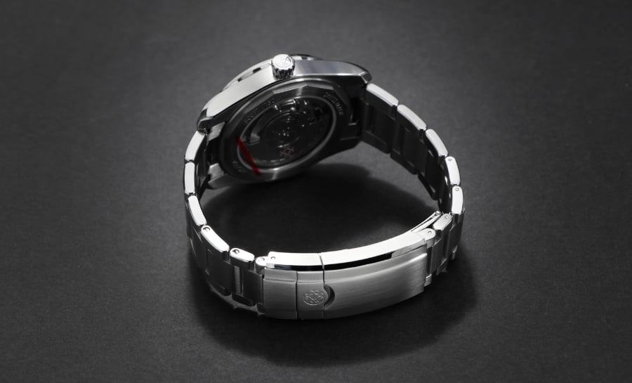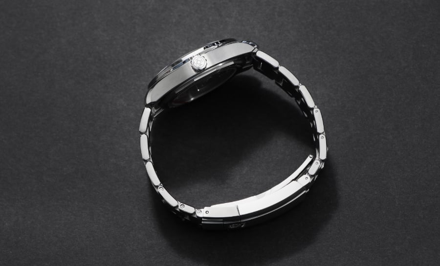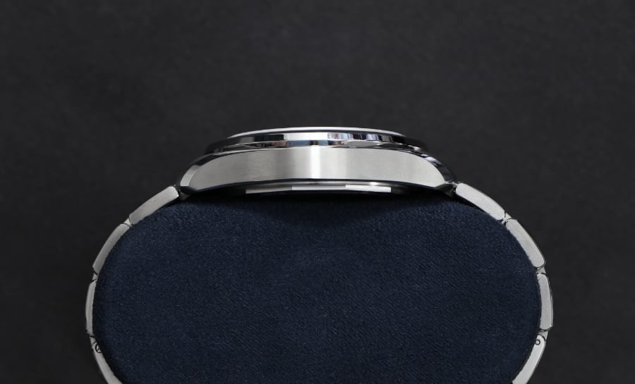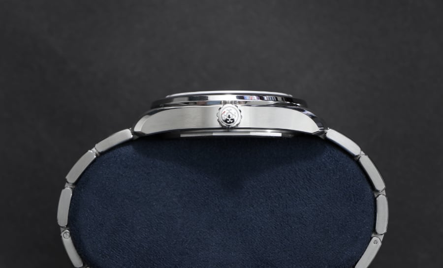 The watch features a 38.5 mm case with an elevated stainless steel bracelet designed for all-day wear. The watch’s lugs and smooth transitions allow it to sit comfortably on the wrist.