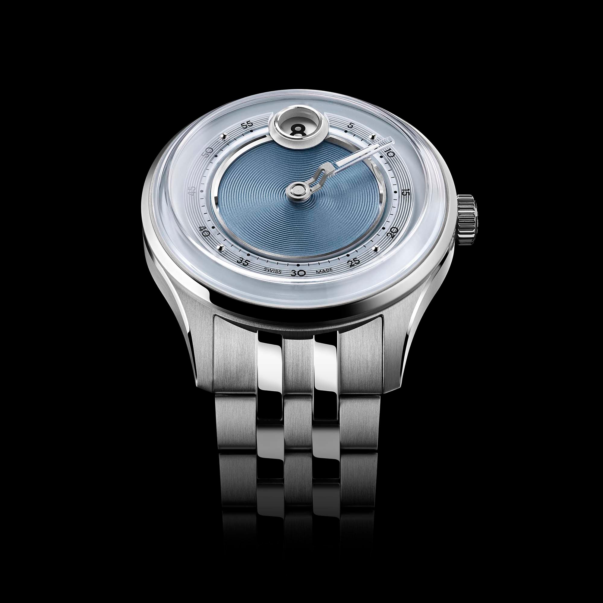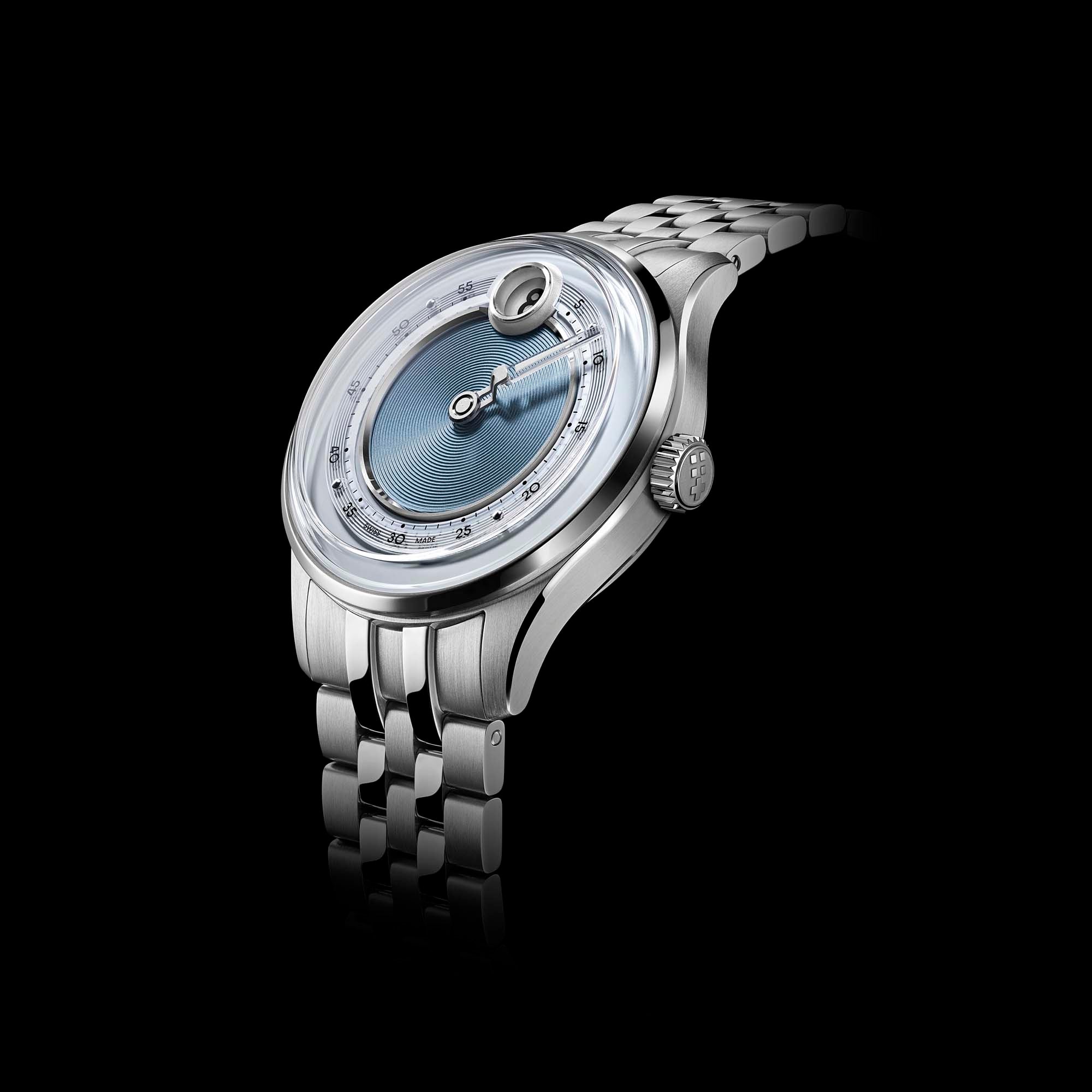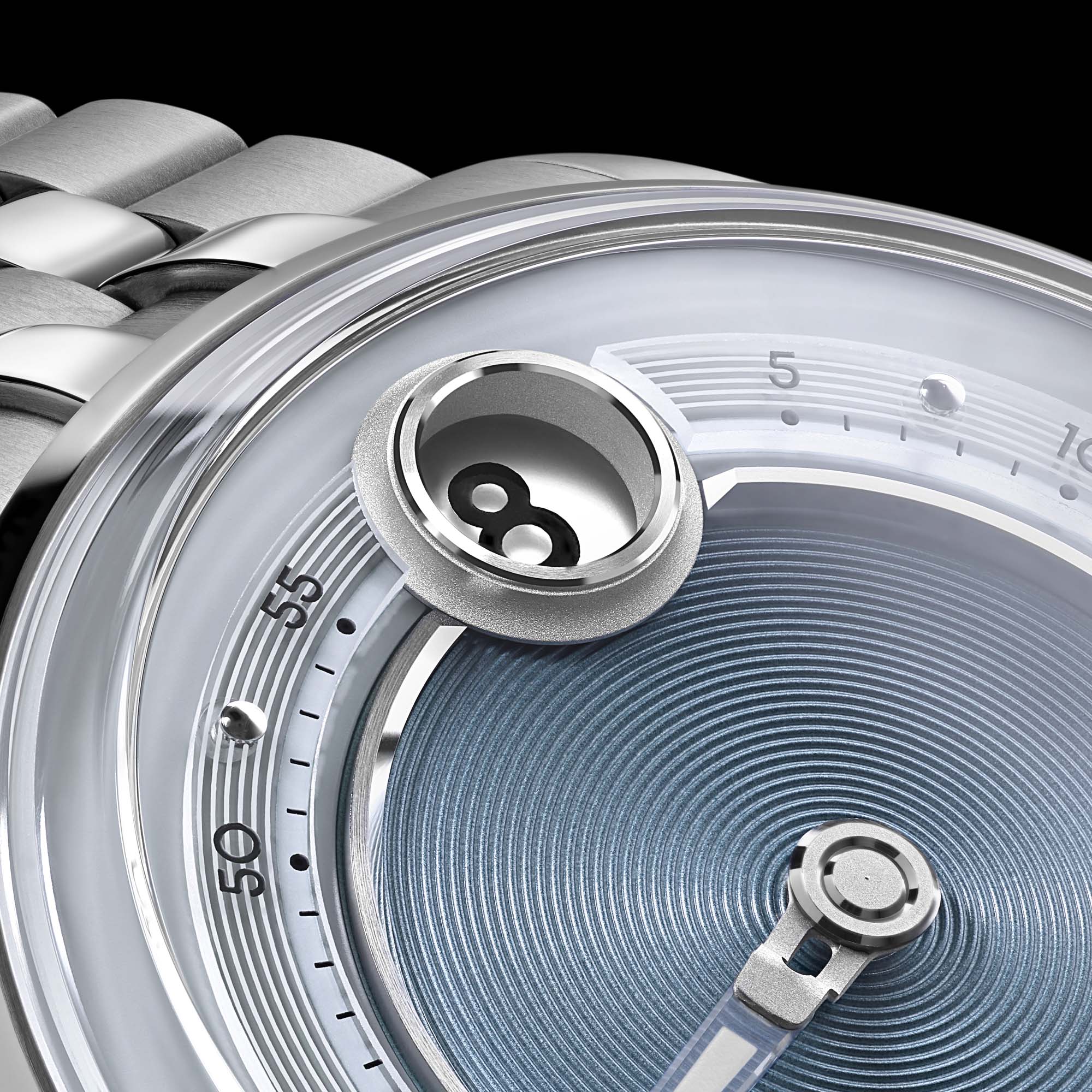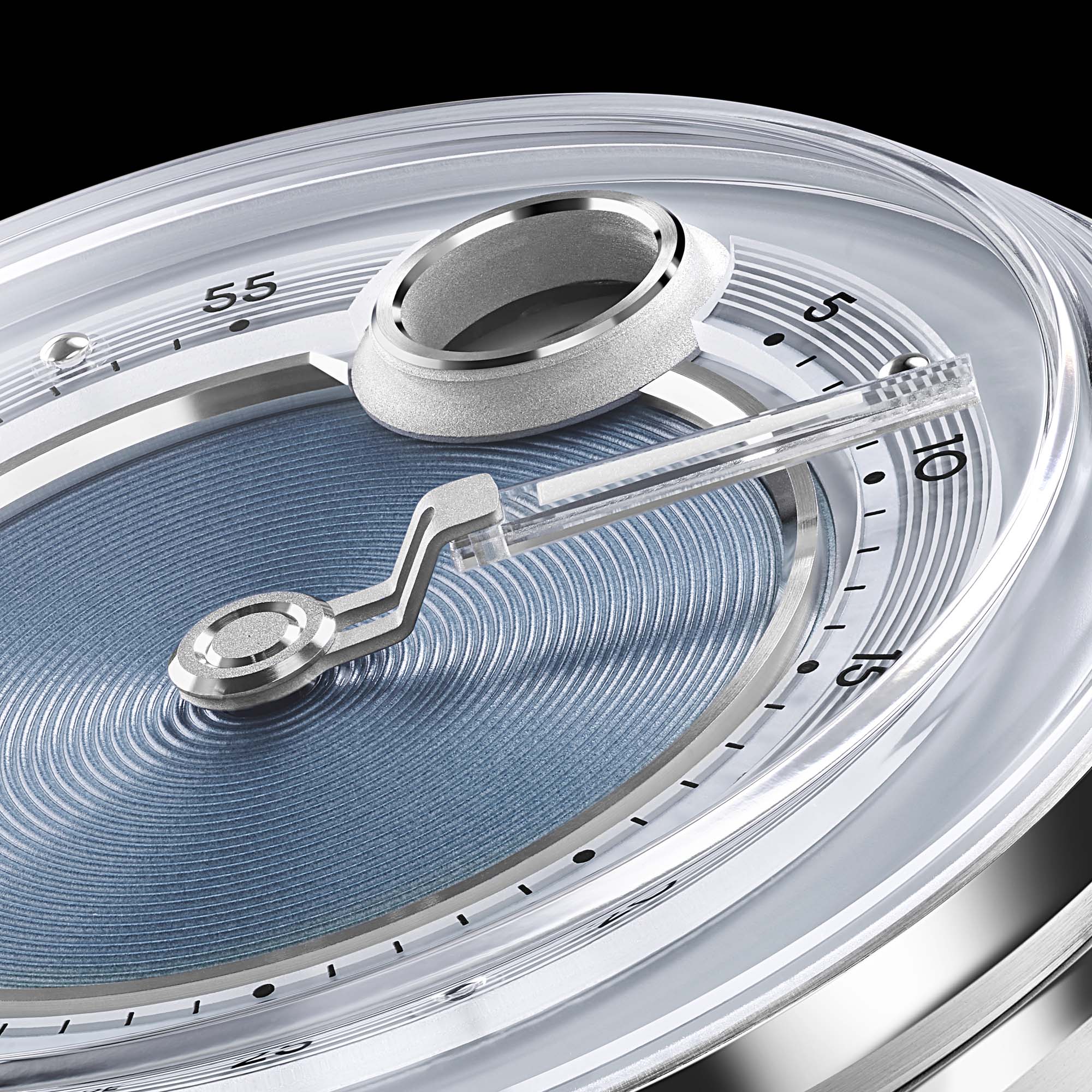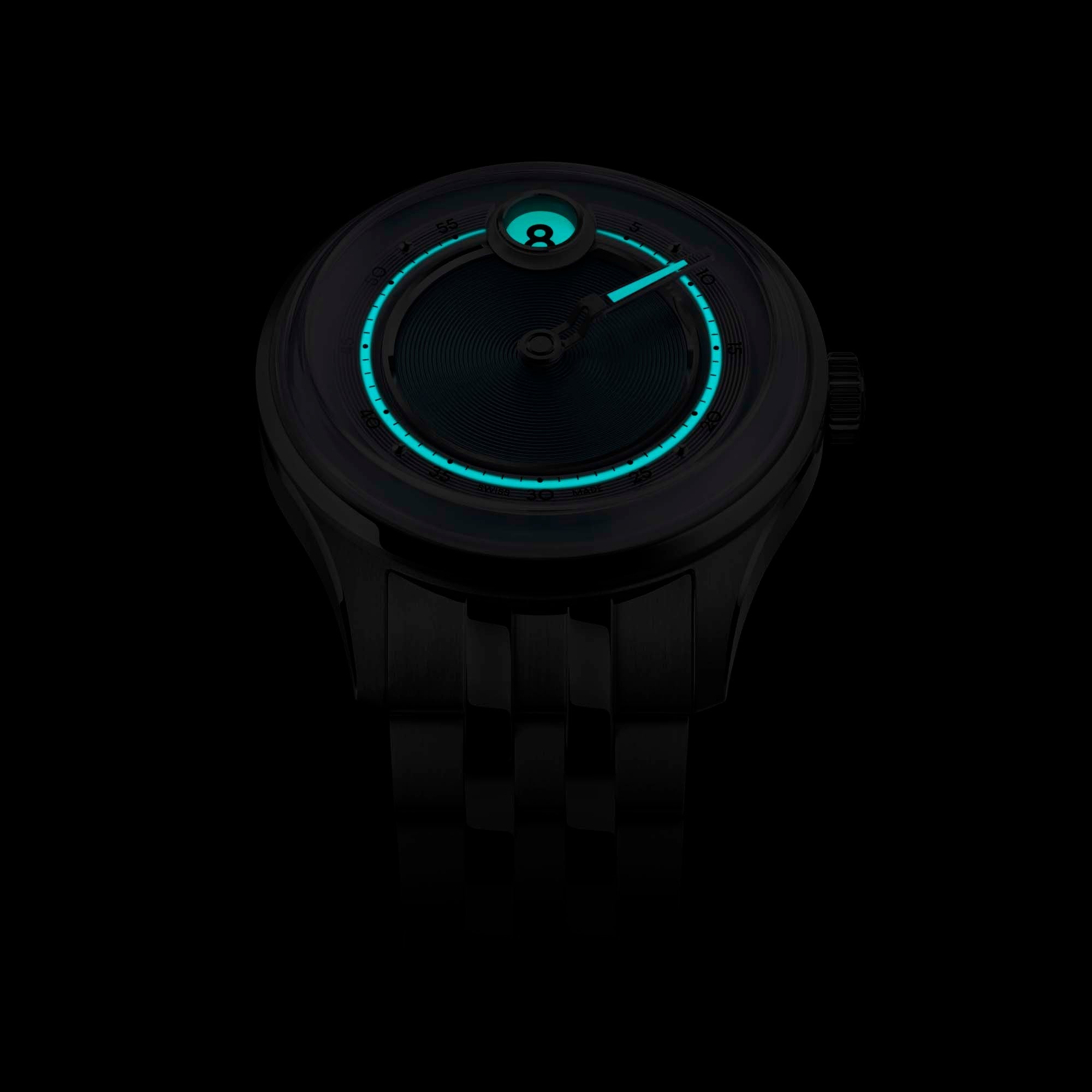 A translucent sapphire ring printed with minute markers and filled with Super-LumiNova® encircles the dial, glowing cool blue after dark while revealing the hidden hour wheel beneath. Four polished pins anchor the ring in perfect symmetry, framing a richly layered dial that plays with light and texture — from the sunray-brushed centre to the circular-brushed and high-grain metallic outer ring.