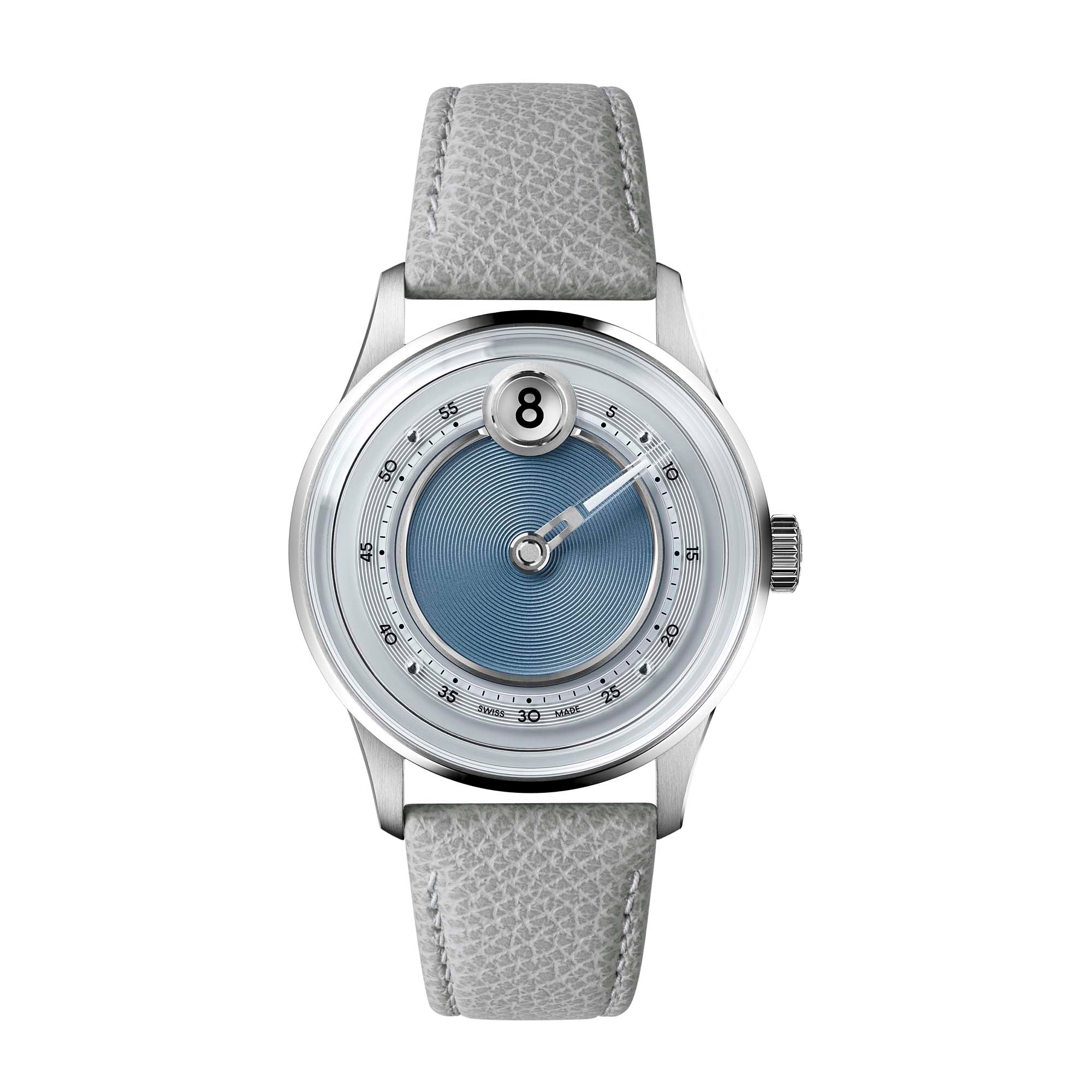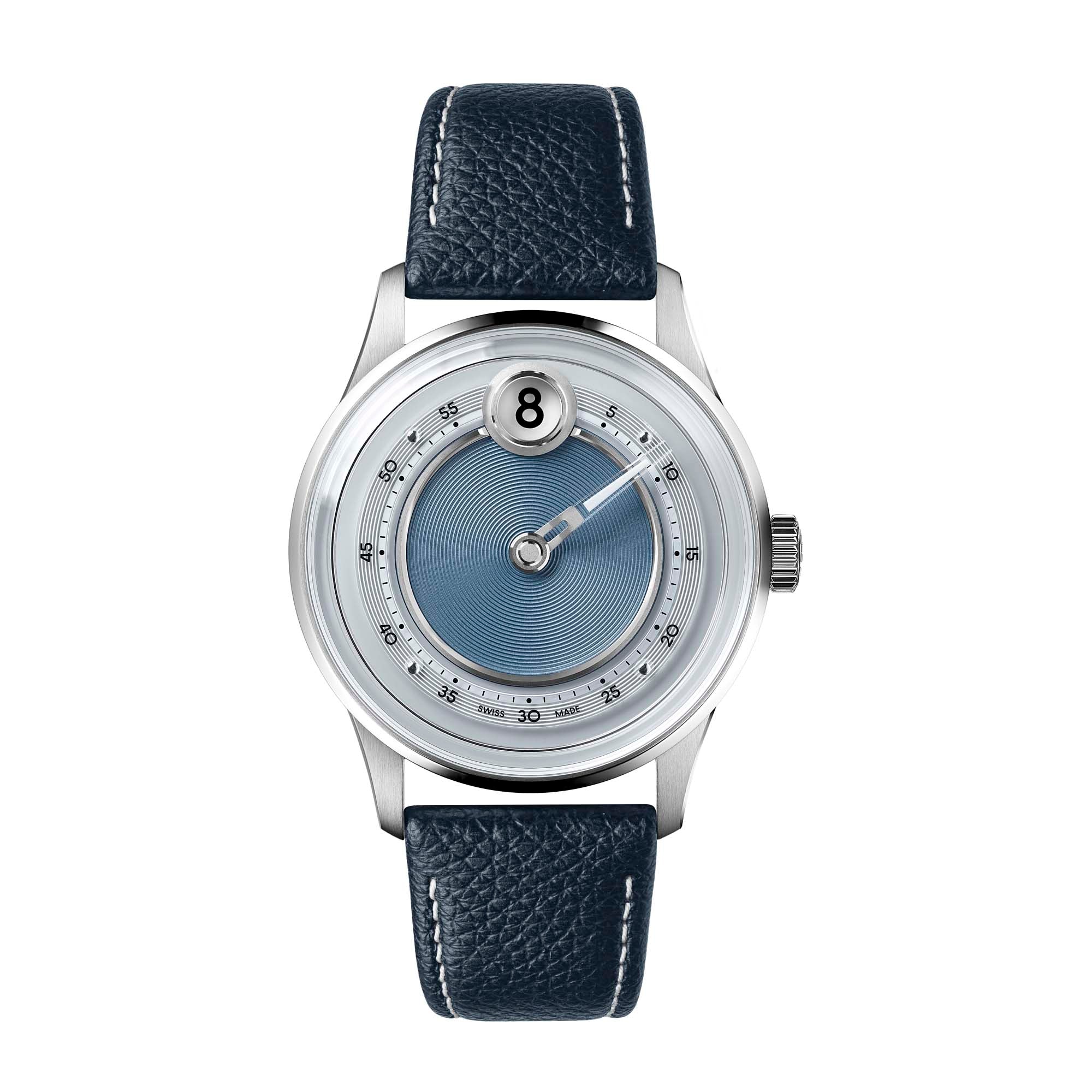 Housed in a 39 mm stainless-steel case with brushed flanks, polished facets, and a box-domed sapphire crystal, the Mk V is finished with a detailed caseback design marking each hour of the jump wheel — a nod to the mechanical precision beneath.