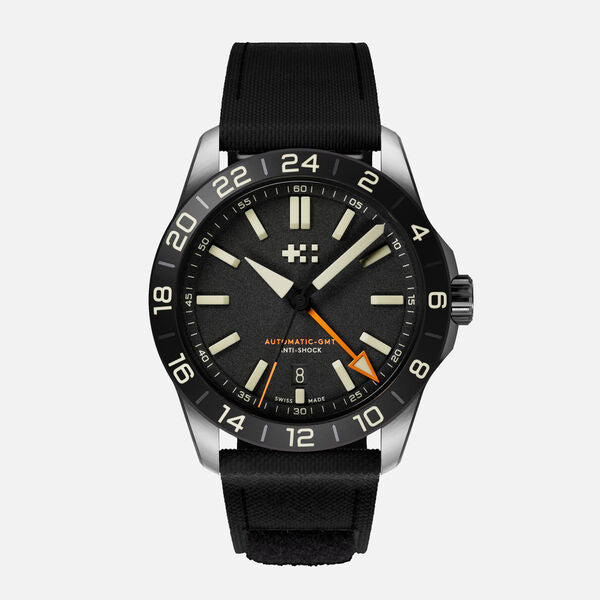 Plus, GMT functionality courtesy of the Sellita SW330-2 movement – protected by an ingenious anti-shock system. With a textured matte dial, sandblasted ceramic bezel and a 41mm brushed steel case, the C63 Extreme GMT is the ultimate go-anywhere companion. Available on our new action-ready Cordura® V-Strap or classic Bader bracelet.