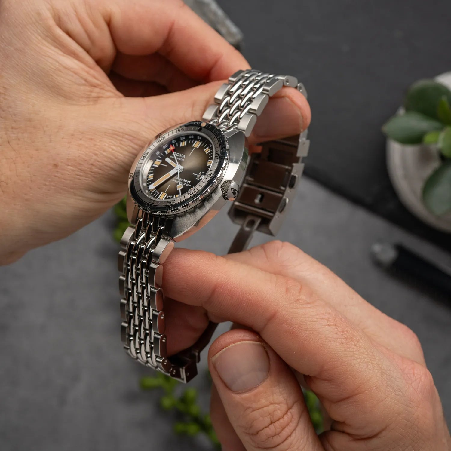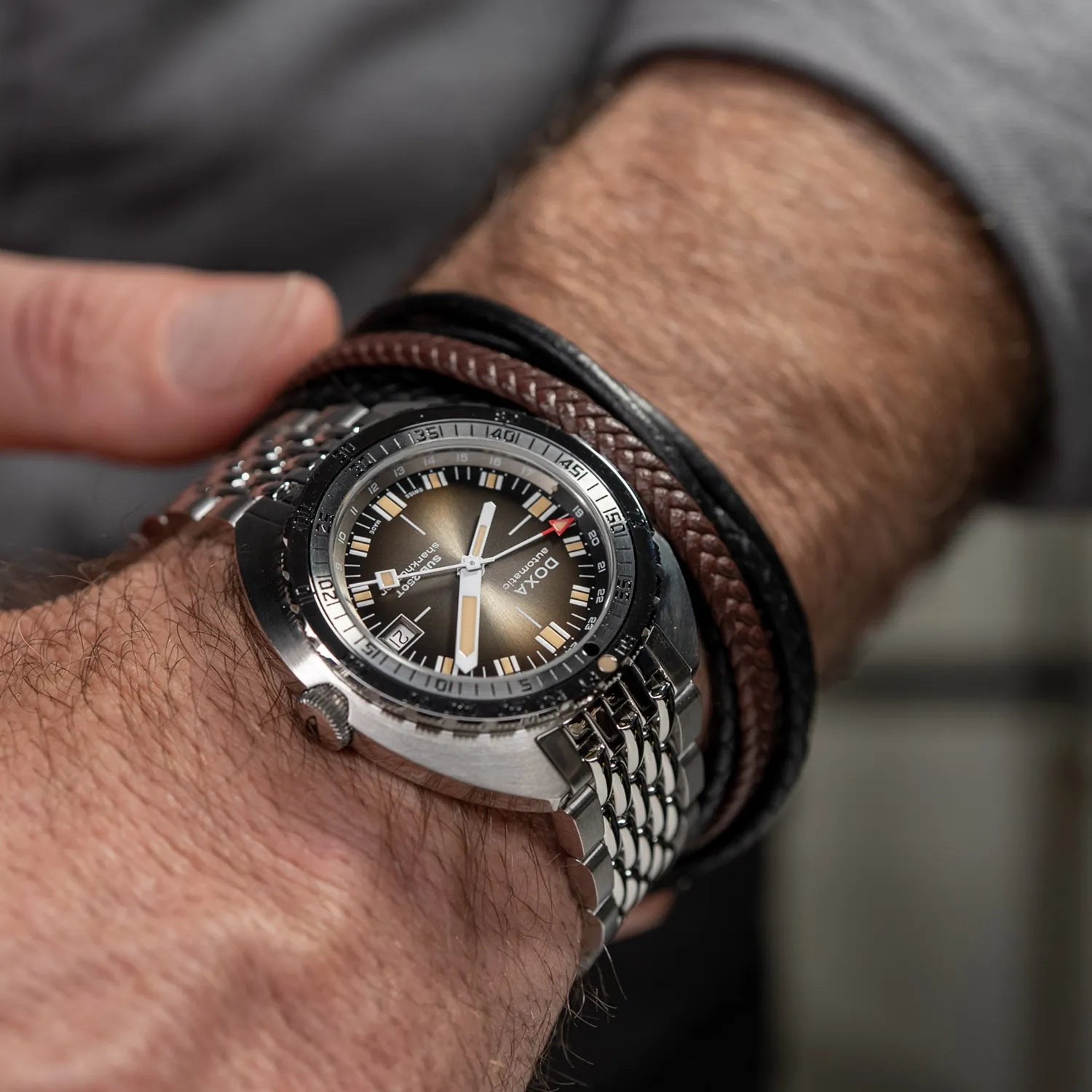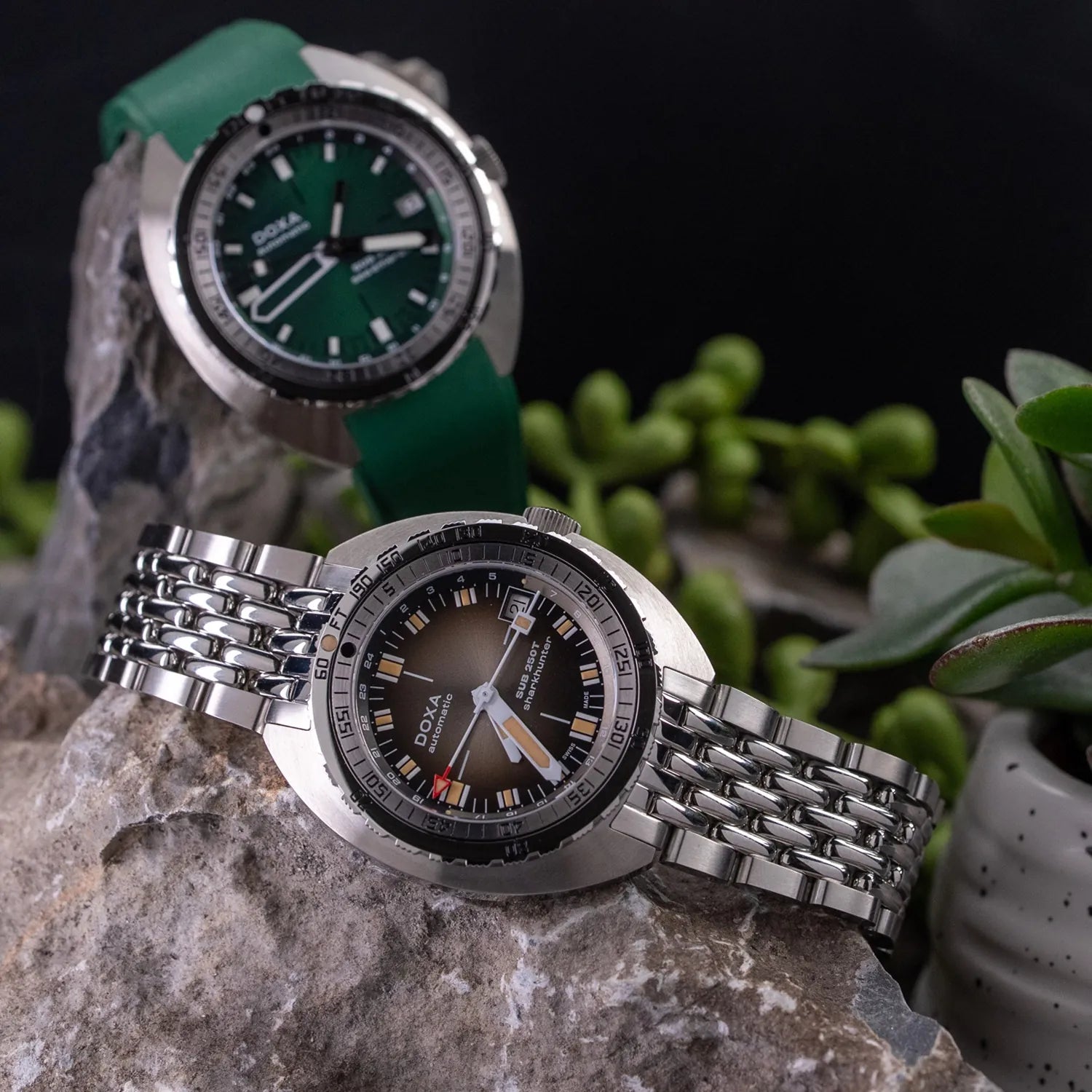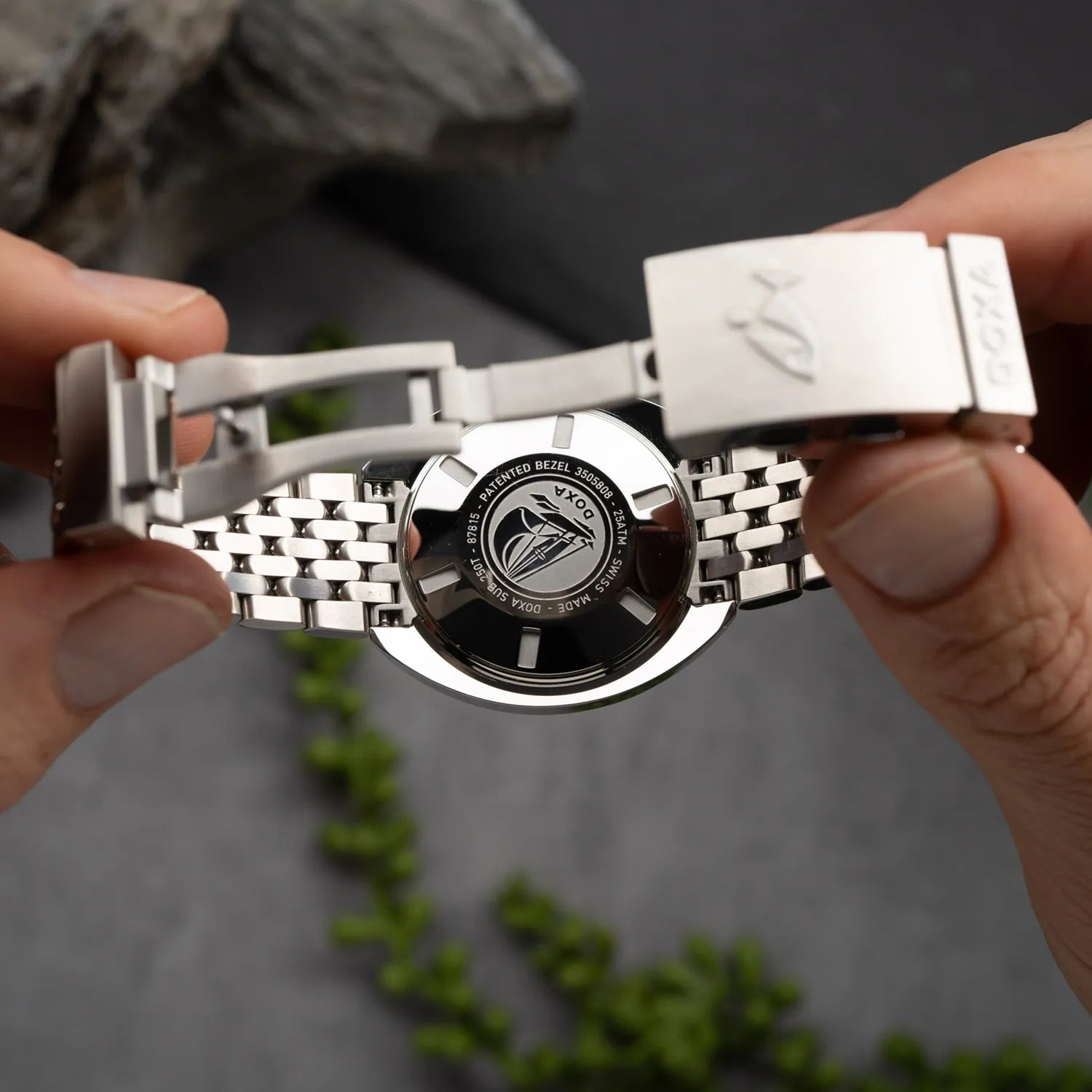 The SUB 250T GMT marks DOXA’s return to the GMT function, blending dive-watch durability with world-time functionality. Its 40mm stainless steel case ensures a perfect balance of wrist presence and comfort, while the screw-down crown and unidirectional bezel with diving scales provide professional-grade performance. With a water resistance of 250 meters (820 feet), it’s built for both underwater exploration and global travel.