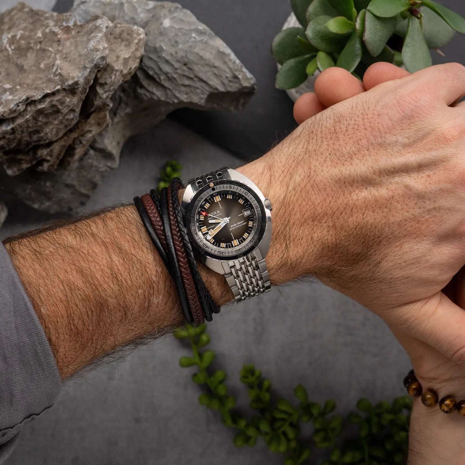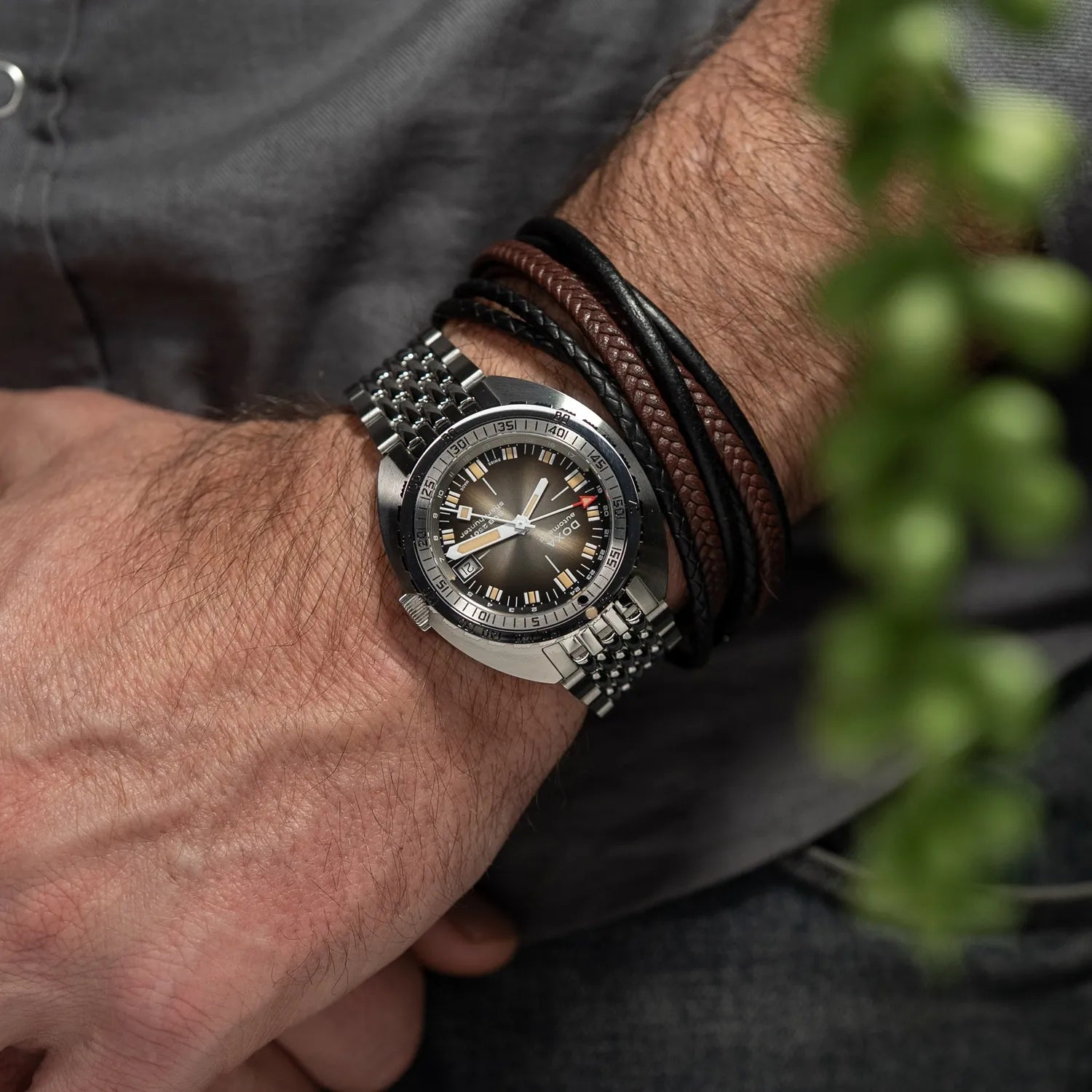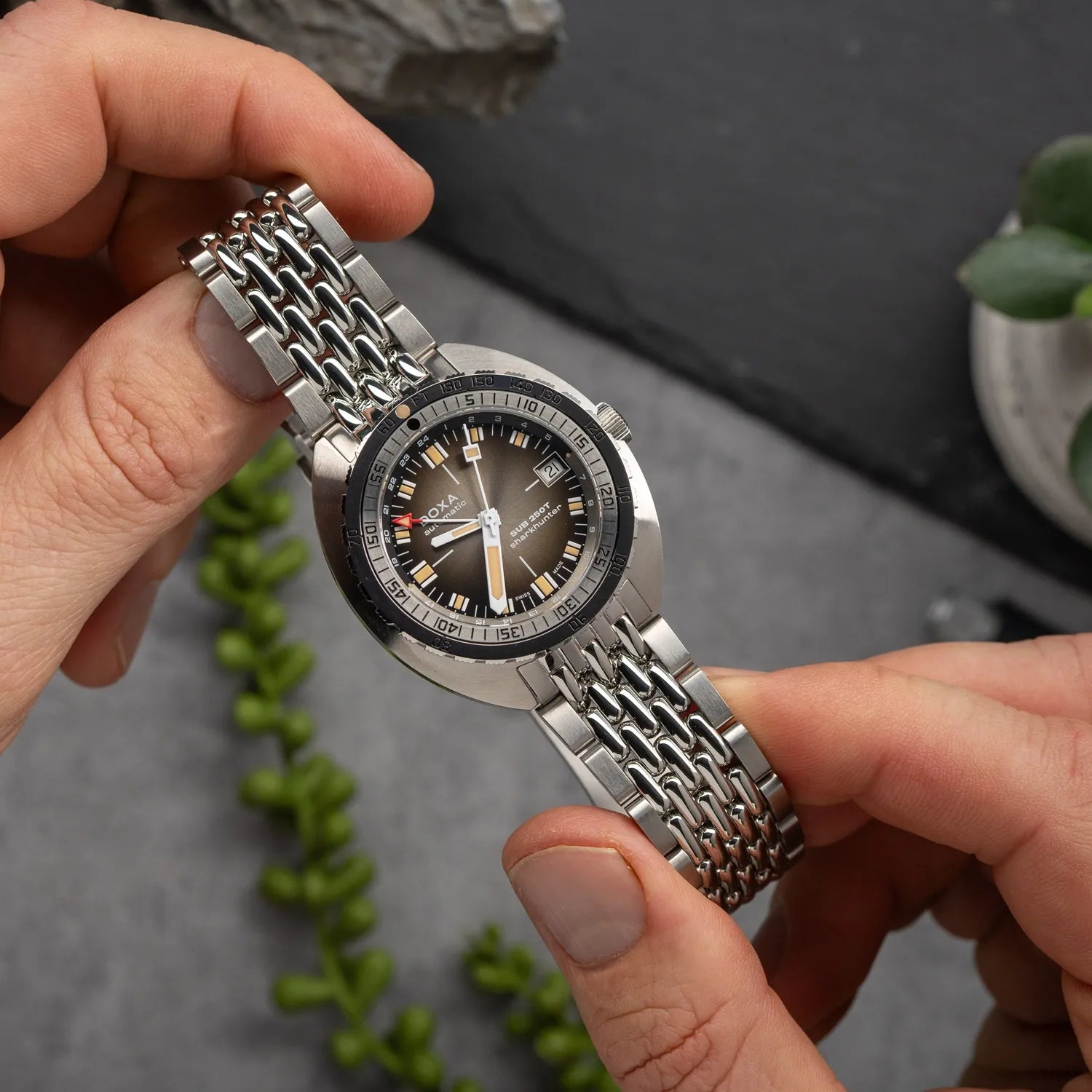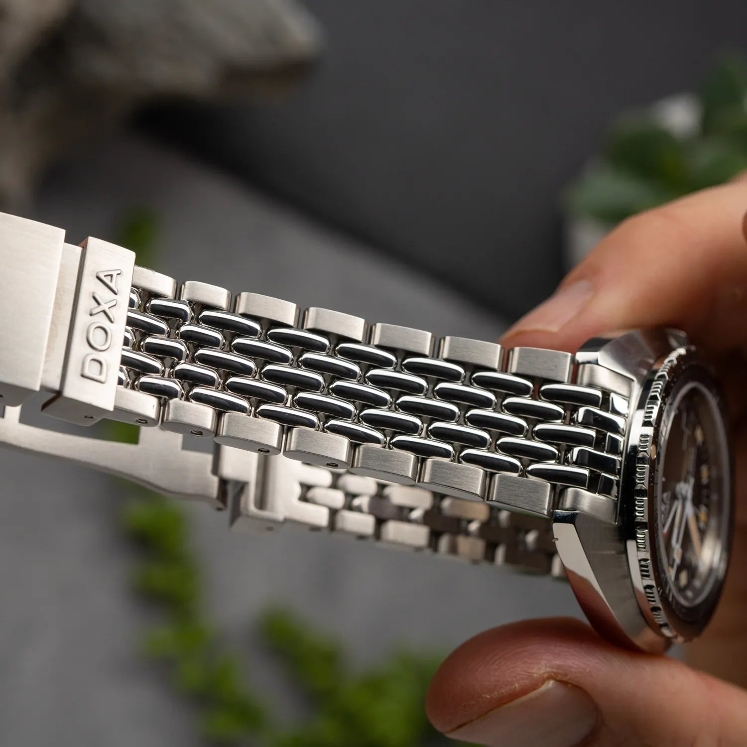 The SUB 250T GMT marks DOXA’s return to the GMT function, blending dive-watch durability with world-time functionality. Its 40mm stainless steel case ensures a perfect balance of wrist presence and comfort, while the screw-down crown and unidirectional bezel with diving scales provide professional-grade performance. With a water resistance of 250 meters (820 feet), it’s built for both underwater exploration and global travel.