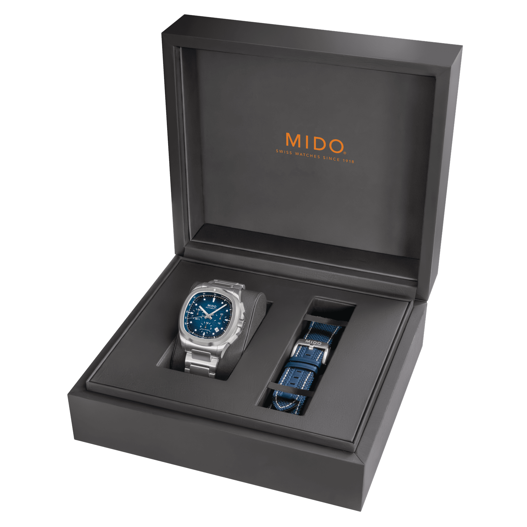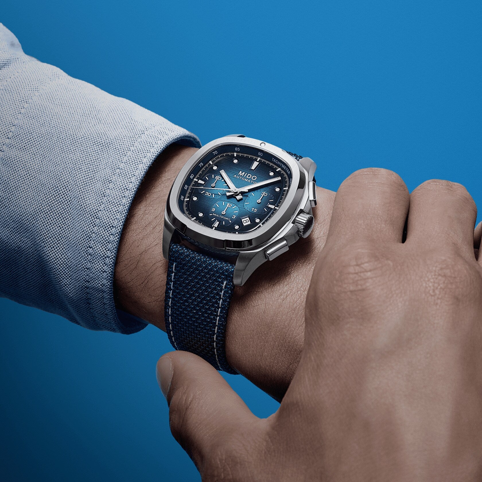 An eye-catching design! True to MIDO’s bold spirit, the Multifort TV Chronograph asserts its character with a uniquely styled TV-shaped case.