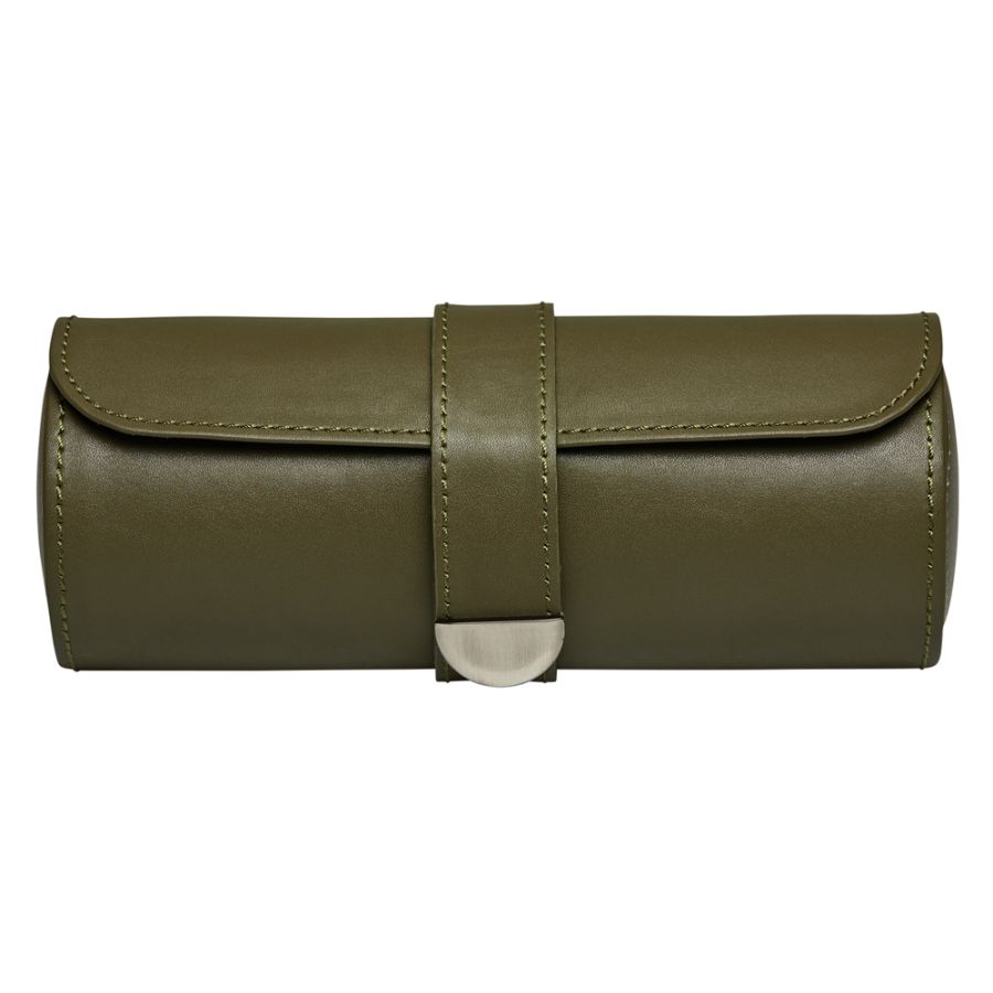 Earth Triple Watch Roll has an apple leather exterior with metallic closure. Inside a recycled satin jacquard interior with WOLF signature design offers storage for three watches and a hidden capsule with three compartments for other valuables.